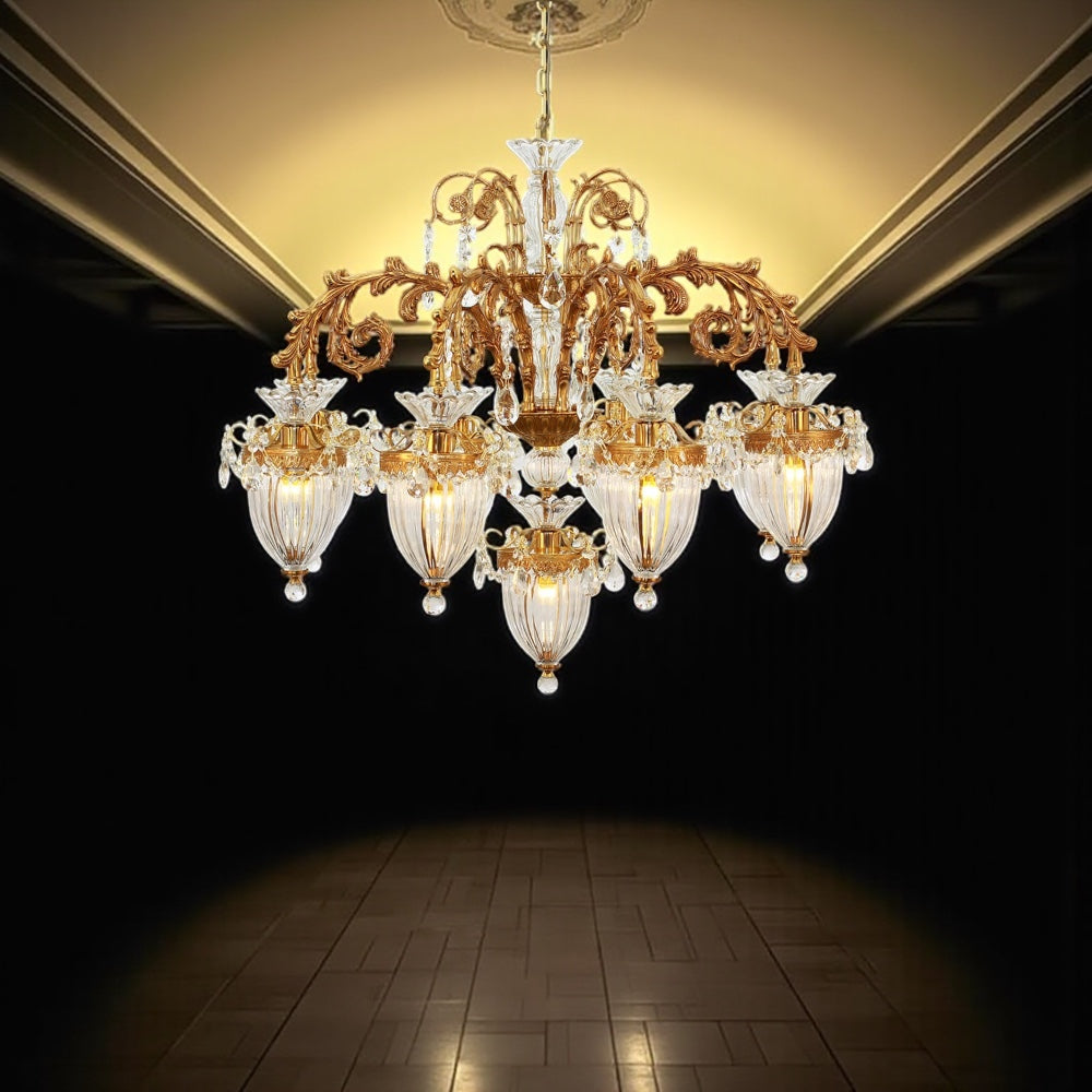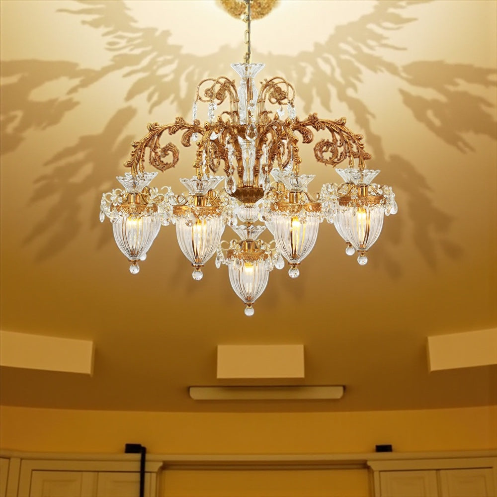 This chandelier features a baroque or vintage French design with a brass or copper frame. It is adorned with crystal or glass elements and has multiple lights, giving it a luxurious and elegant appearance.
