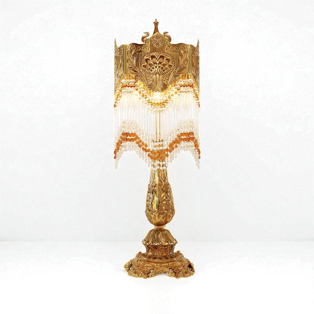 The lamp is characterized by its ornate and elegant design. It features a sculpted brass base and a lampshade made of crystal beads arranged in a tassel or fringe pattern. The materials are typically listed as copper or brass and crystal. The lamp is a single-light fixture, often designed for use with an E26 bulb base, and is suitable for living rooms or bedrooms.