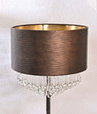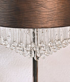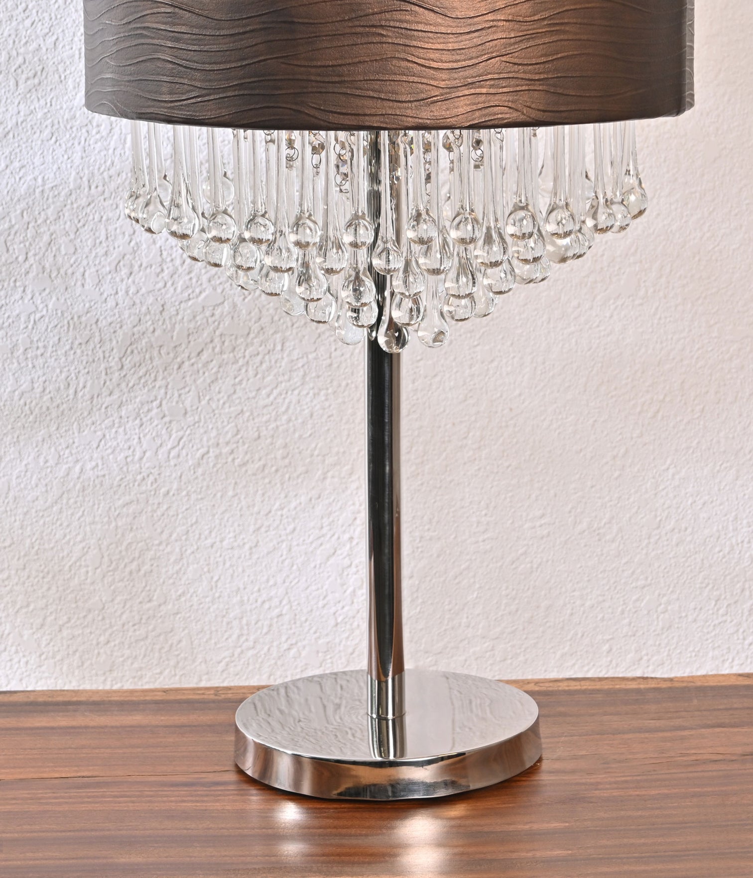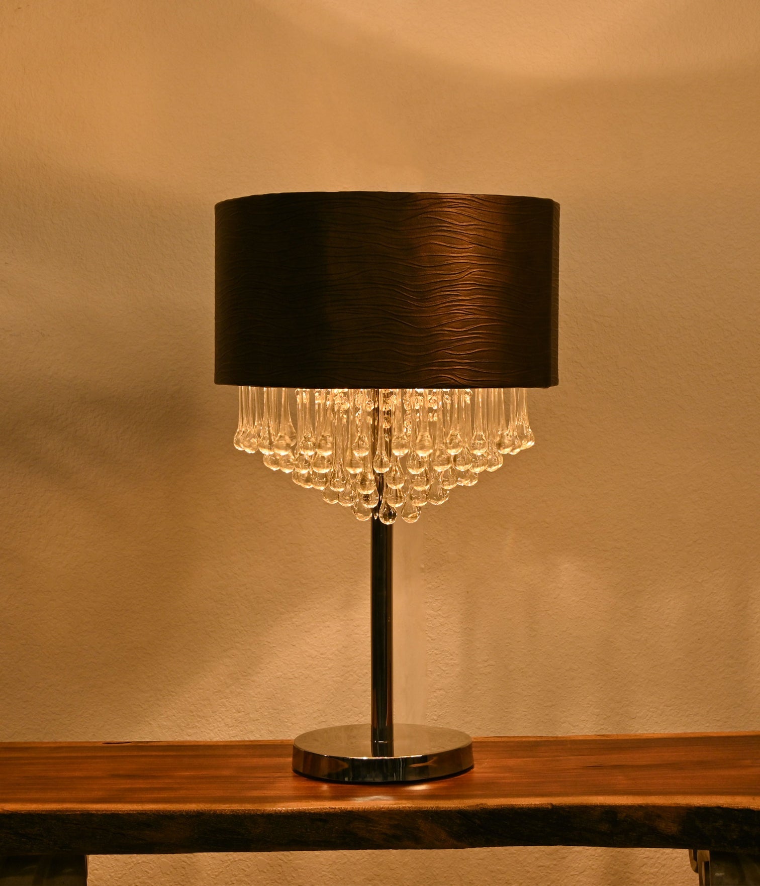 A table lamp featuring a sleek chrome finish, adorned with a sophisticated leatherite lamp shade, complemented by exquisite handcrafted glass droplets for added elegance.