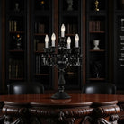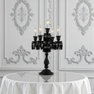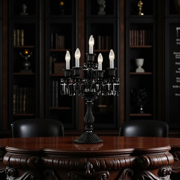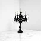 The lamp features a black, multi-tiered body with decorative crystal or glass elements. It has multiple arms, each topped with a candle-style light bulb. The base is ornate, and the overall design is elegant and dramatic, suggesting a gothic or luxurious aesthetic.