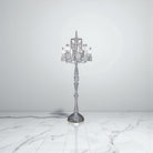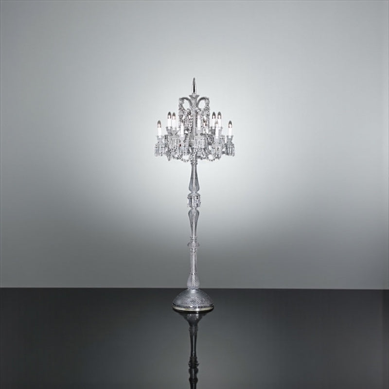 This candelabra is a dramatic reinterpretation of Baccarat's iconic chandelier design, crafted in clear crystal. It features a central column that conceals electrical cables and is adorned with chiseled prisms and pendants. It is designed to be a statement piece for tall spaces.