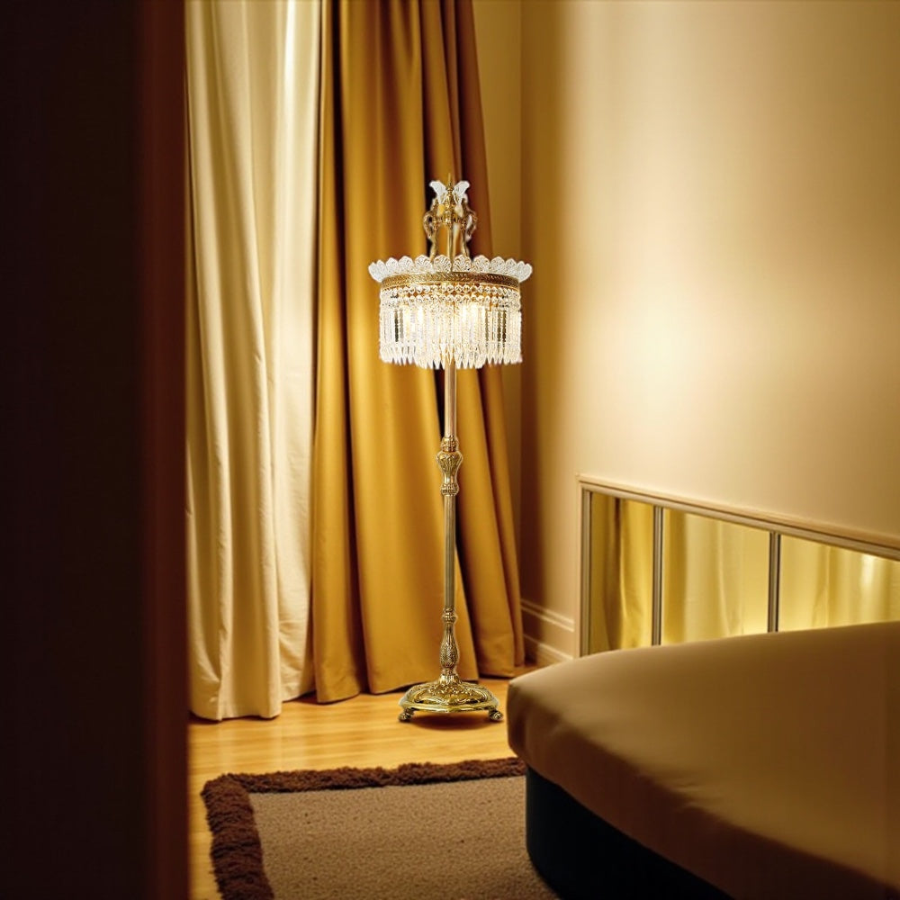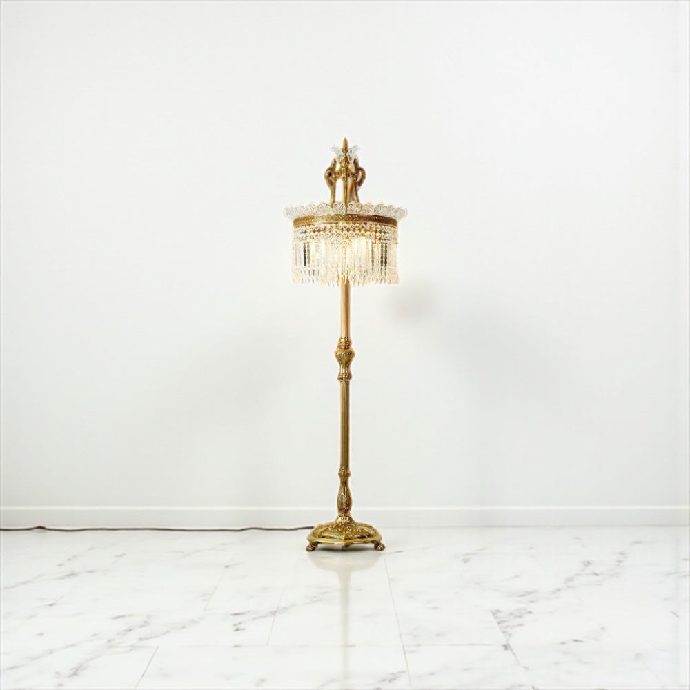 This American, mid-20th-century floor lamp features elongated crystal prisms arranged in three tiers. It is mounted on a brass standard with a round base. The lamp is a blend of Art Deco and Mid-Century Modern styles, characterized by its metallic gold accents and classic lines.