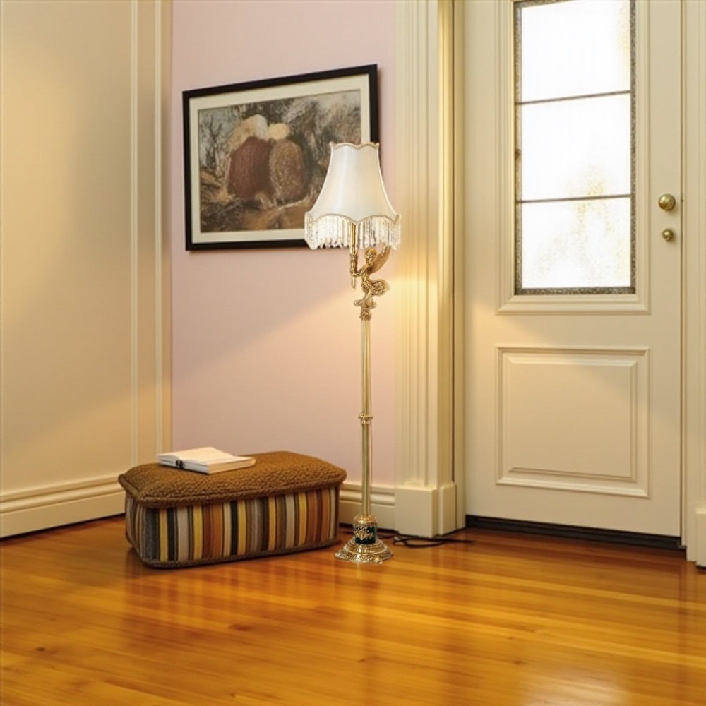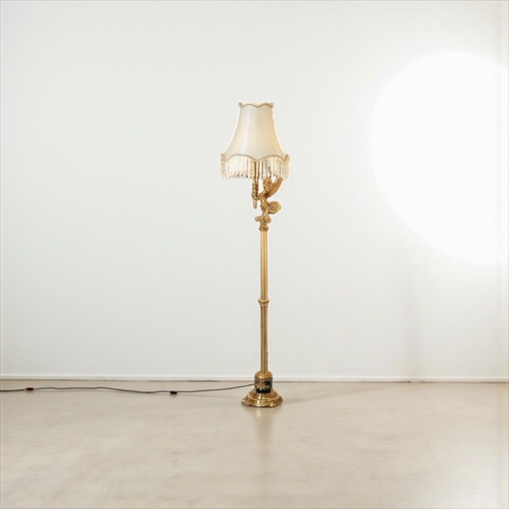 This floor lamp is made of cast brass and features a decorative base and a stem that includes a figure, often an angel or cherub. The lampshade is typically made of a double layer of fabric with crystal or glass inserts.