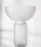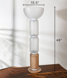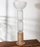 This striking floor lamp pairs sculpted glass with a textured wooden base, creating a harmonious fusion of natural and modern materials. The layered design adds dimension and style, casting a soft light that enhances the textures beneath. A sophisticated addition to contemporary homes.