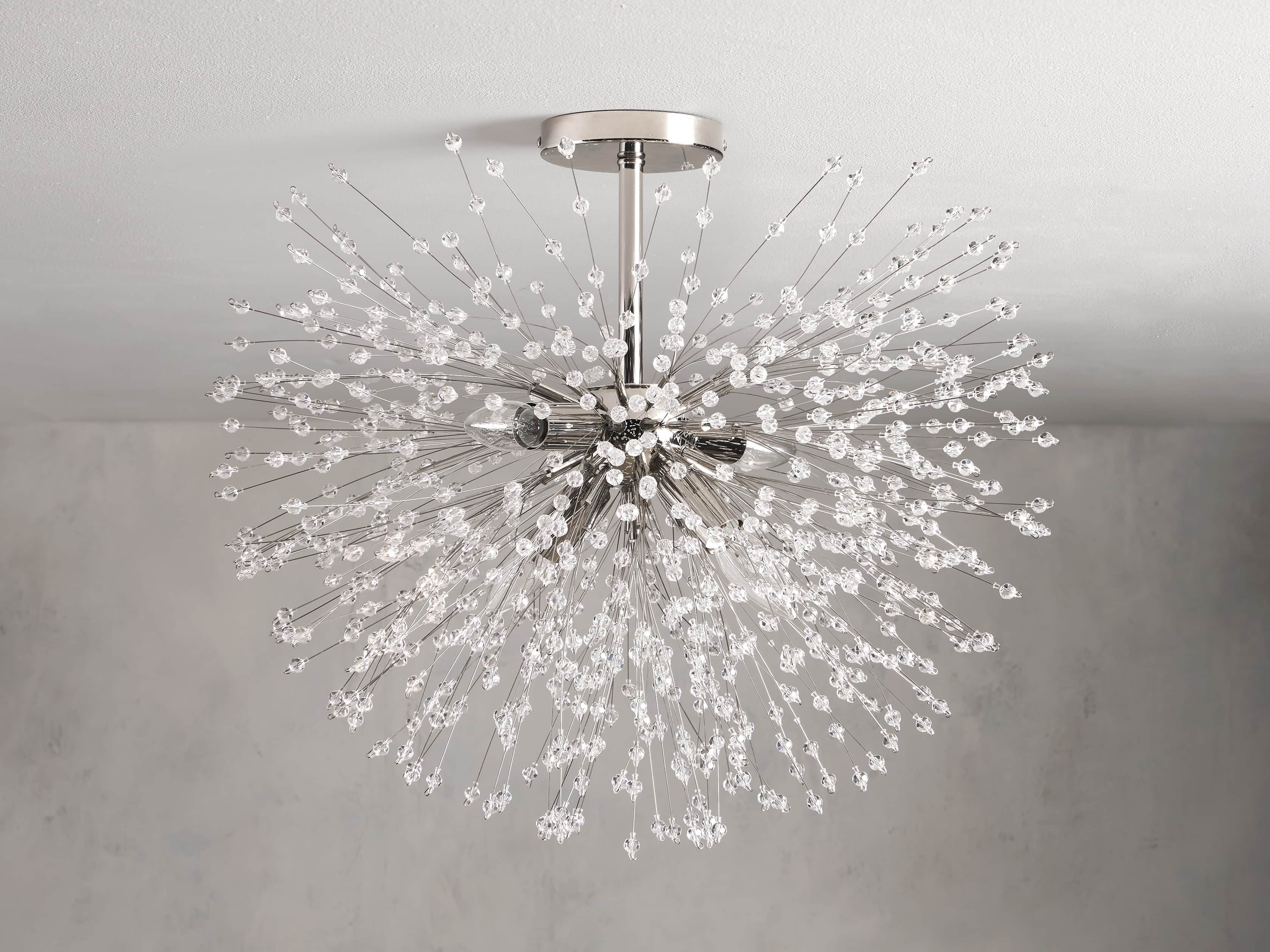 Delightfully designed to resemble a dandelion after it’s blossomed, our elegant Dandelion Chandelier beautifully twinkles with reflected light. Crafted from nickel-plated iron with a painted finish, Dandelion’s radiating crystals will add whimsical wonder to any space.