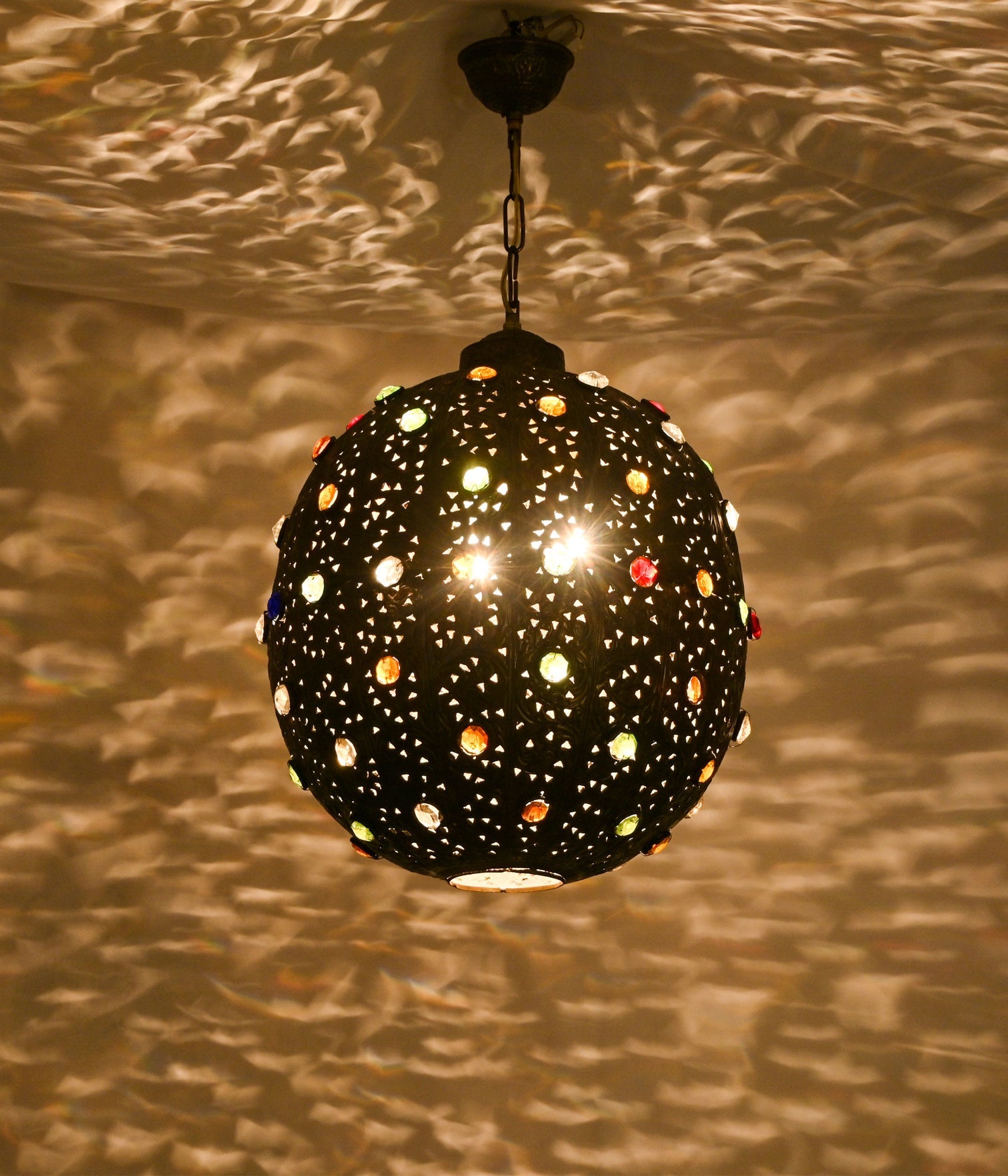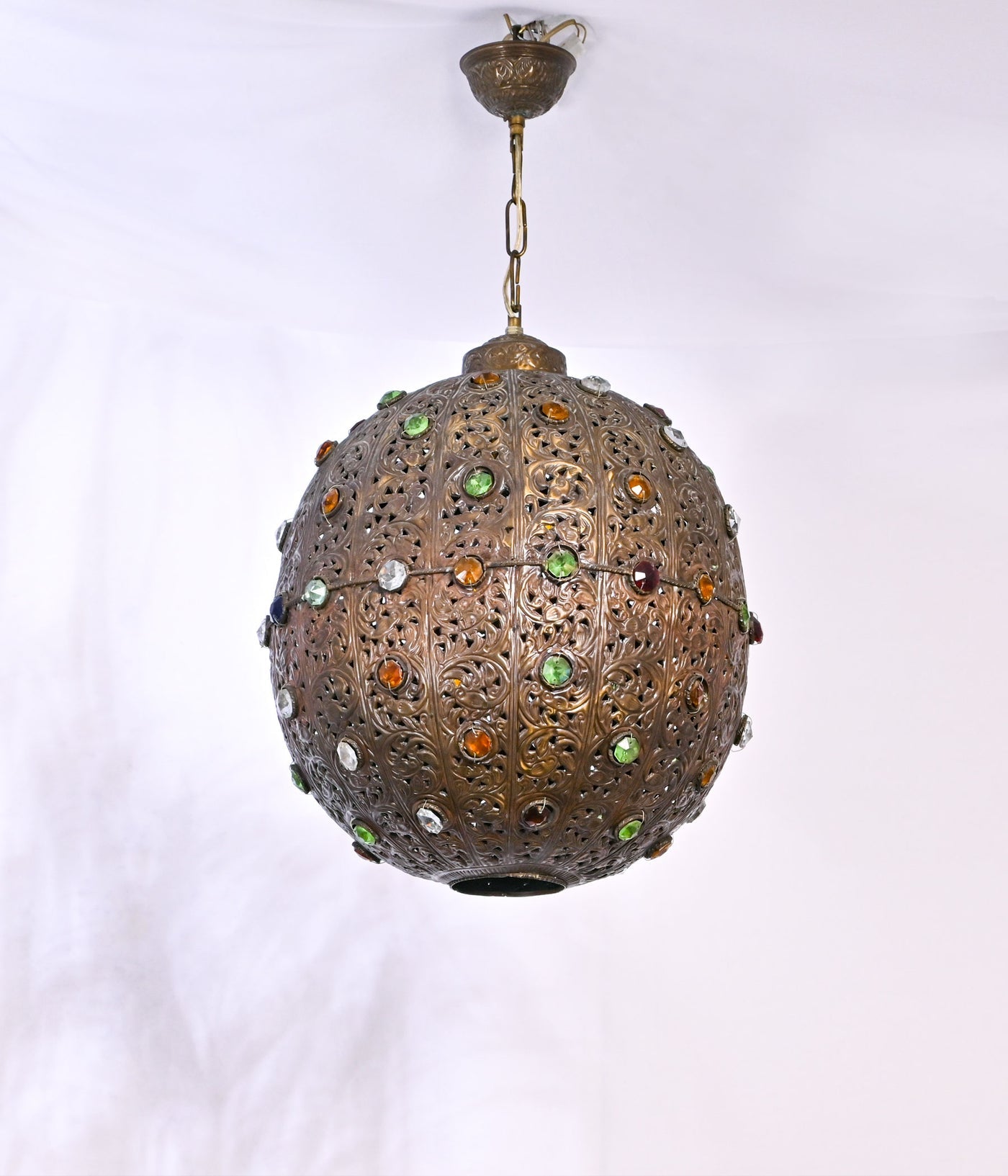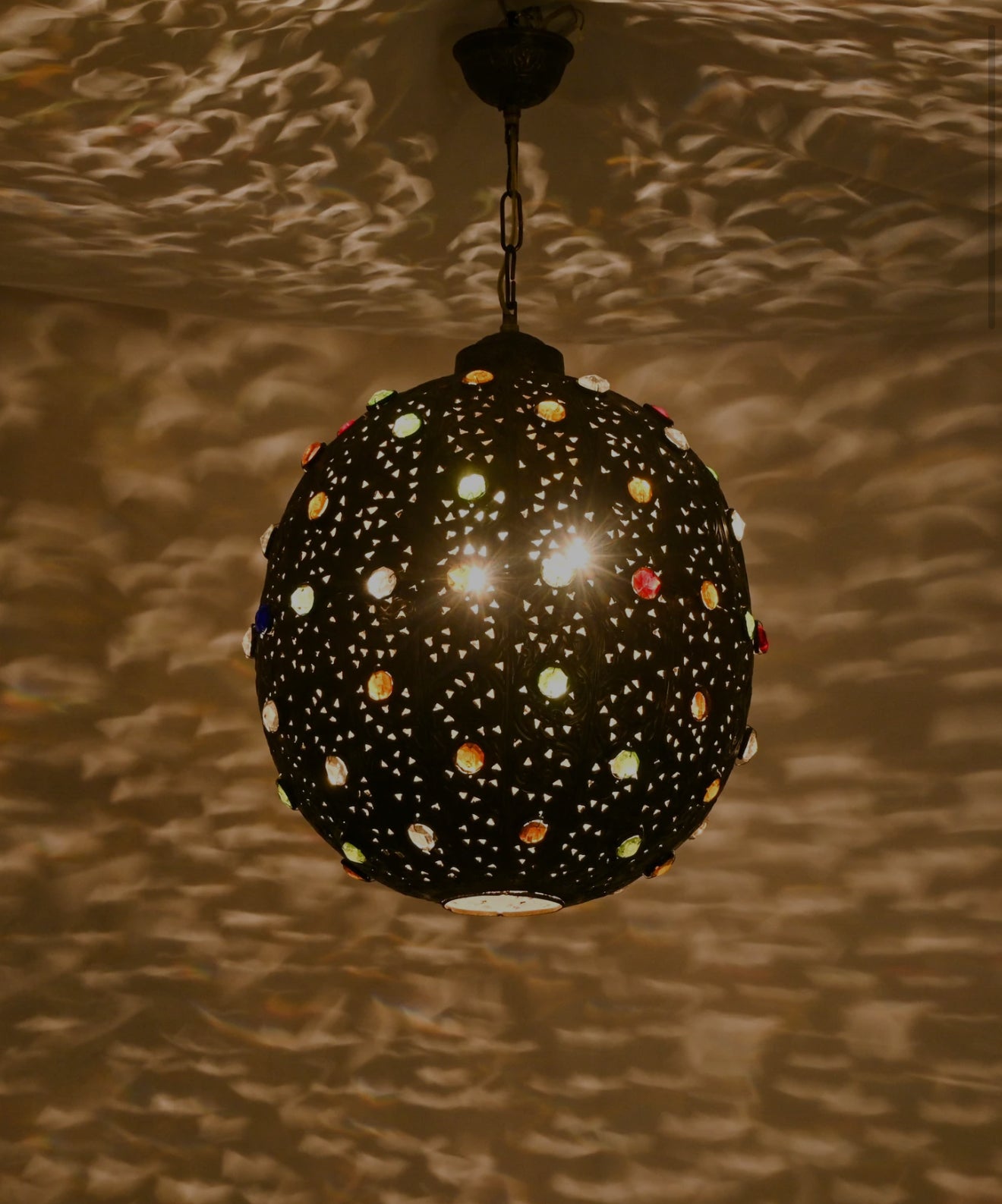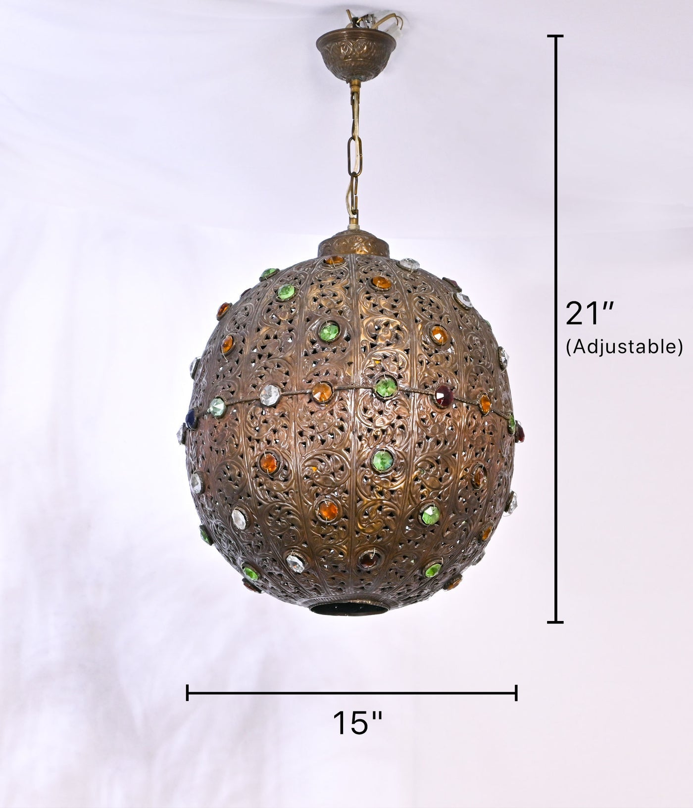 Enhance your interiors with this pendant light, crafted in an antique brass finish and adorned with multi-coloured crystal accessories. The captivating design brings a playful energy to your décor while providing warm, inviting light to any space.