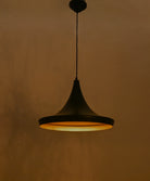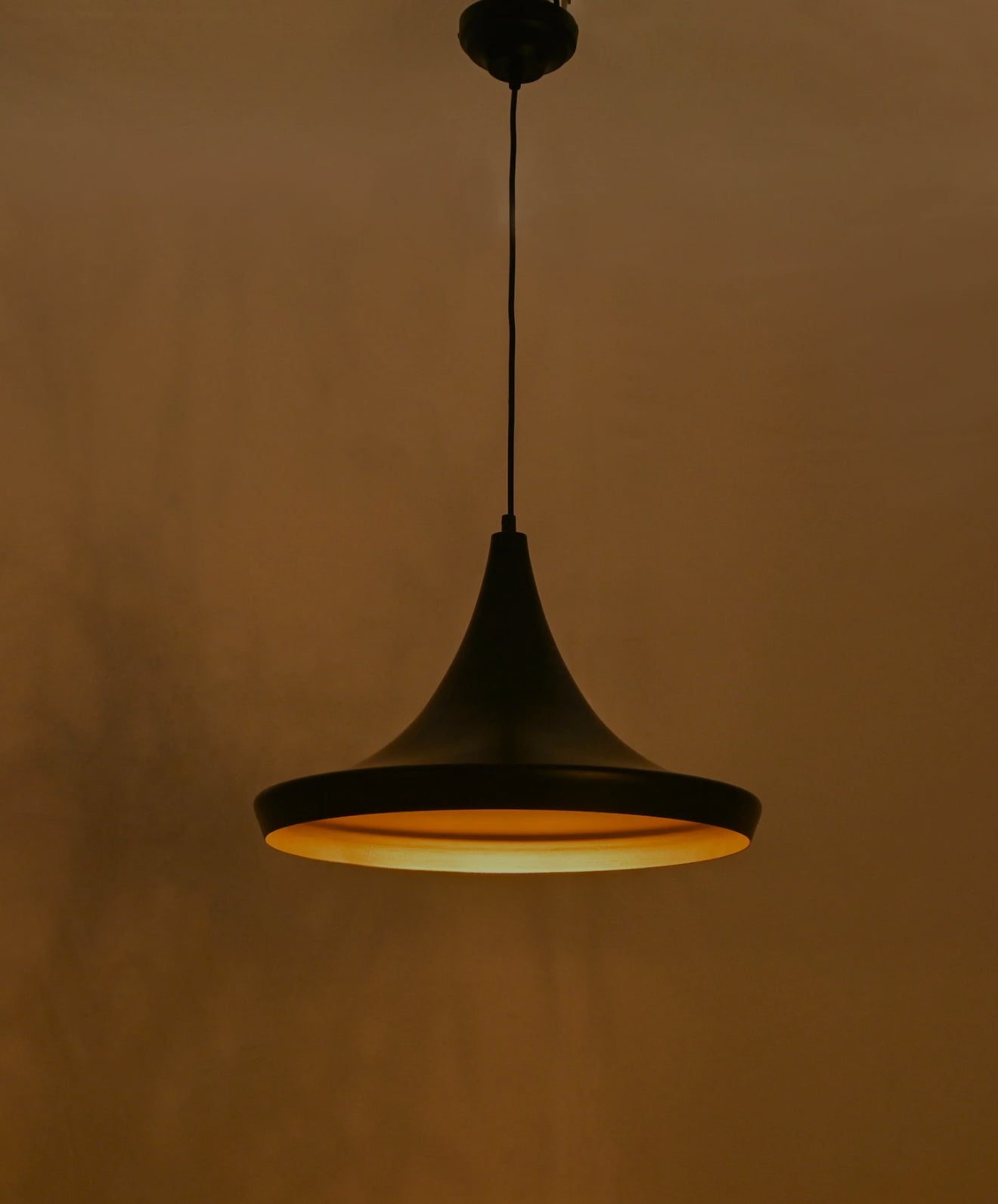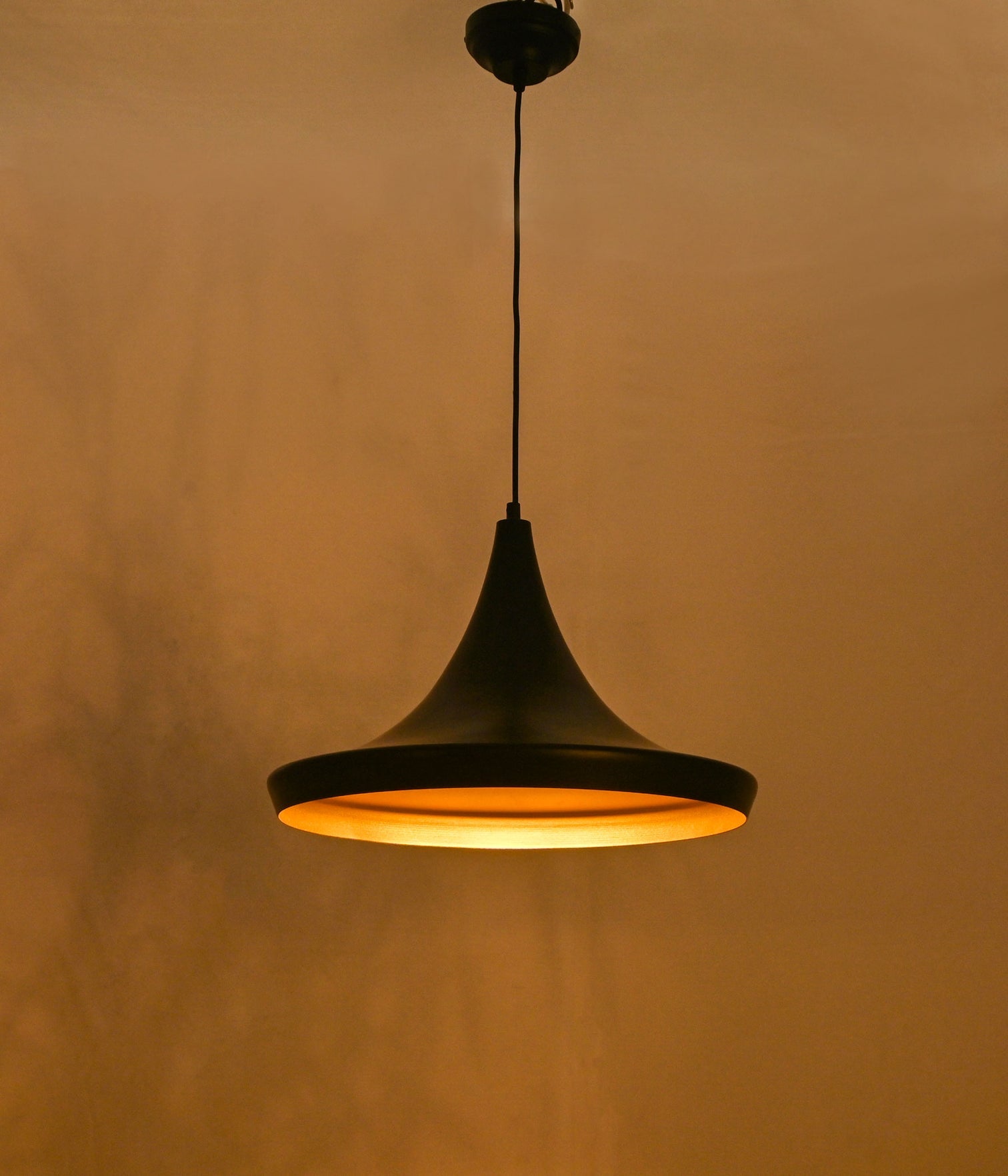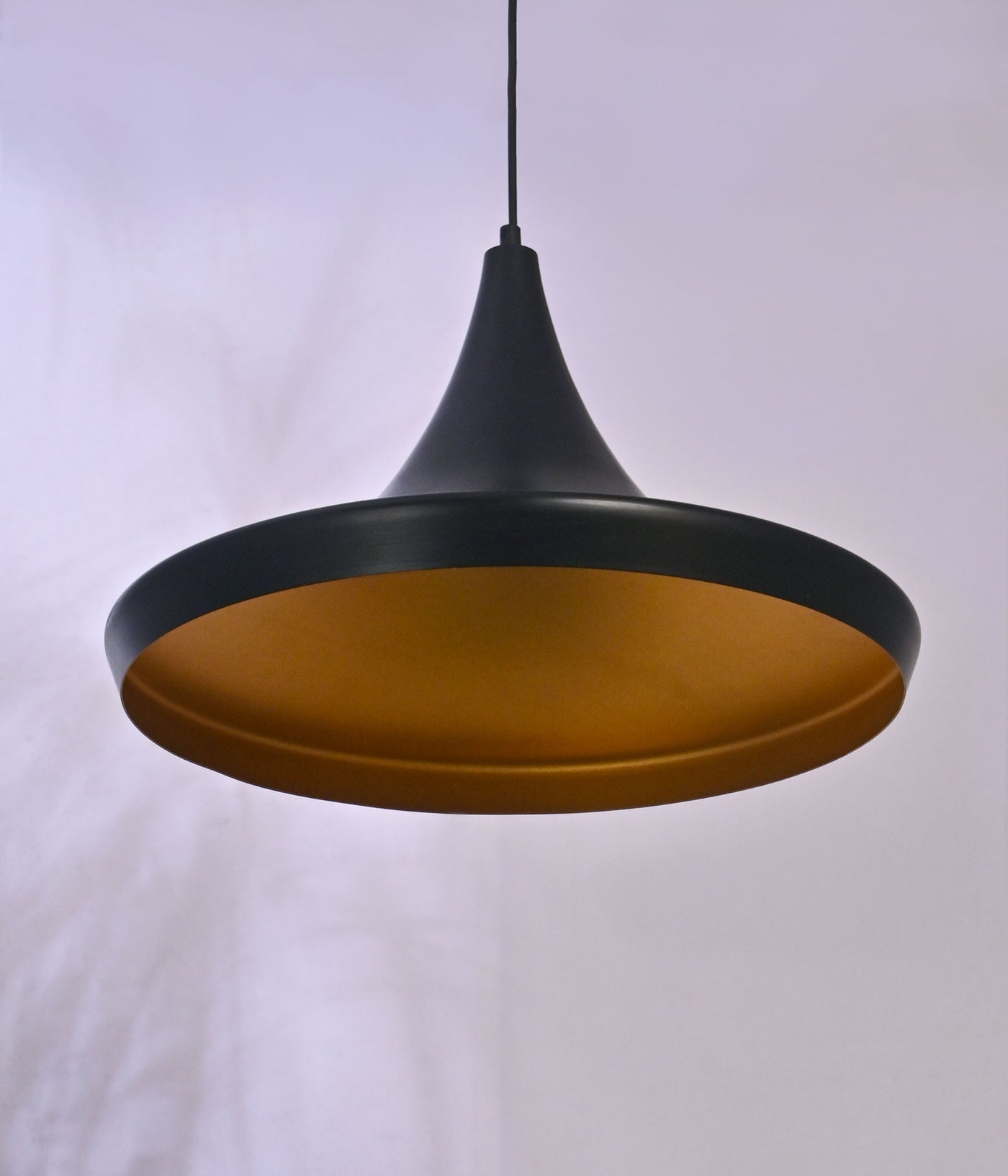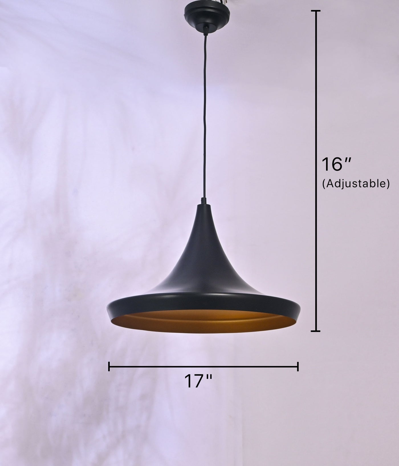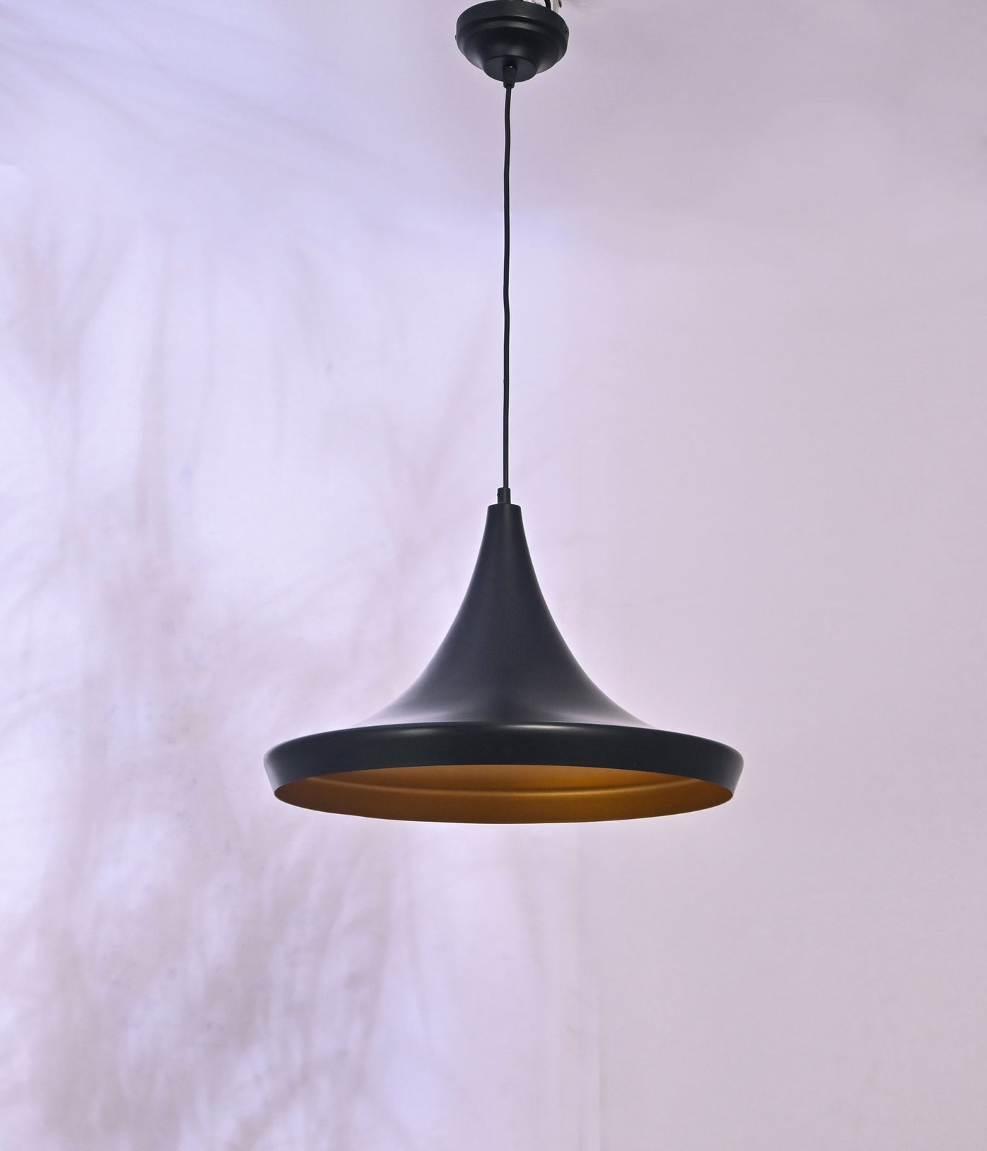 Transform your interiors with our metal pendant light, featuring a stunning matt black finish on the outside and a luxurious matt gold inside. This unique design casts a warm glow, making it perfect for any modern setting.