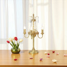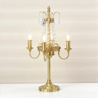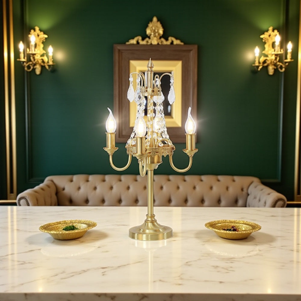 This is a classic, ornate table lamp with a brass-colored finish and crystal accents. It features a central column with suspended crystals and three arms extending outwards, each holding a light fixture designed to resemble a candle. The base is round and sturdy, and the overall design is decorative and luxurious.