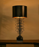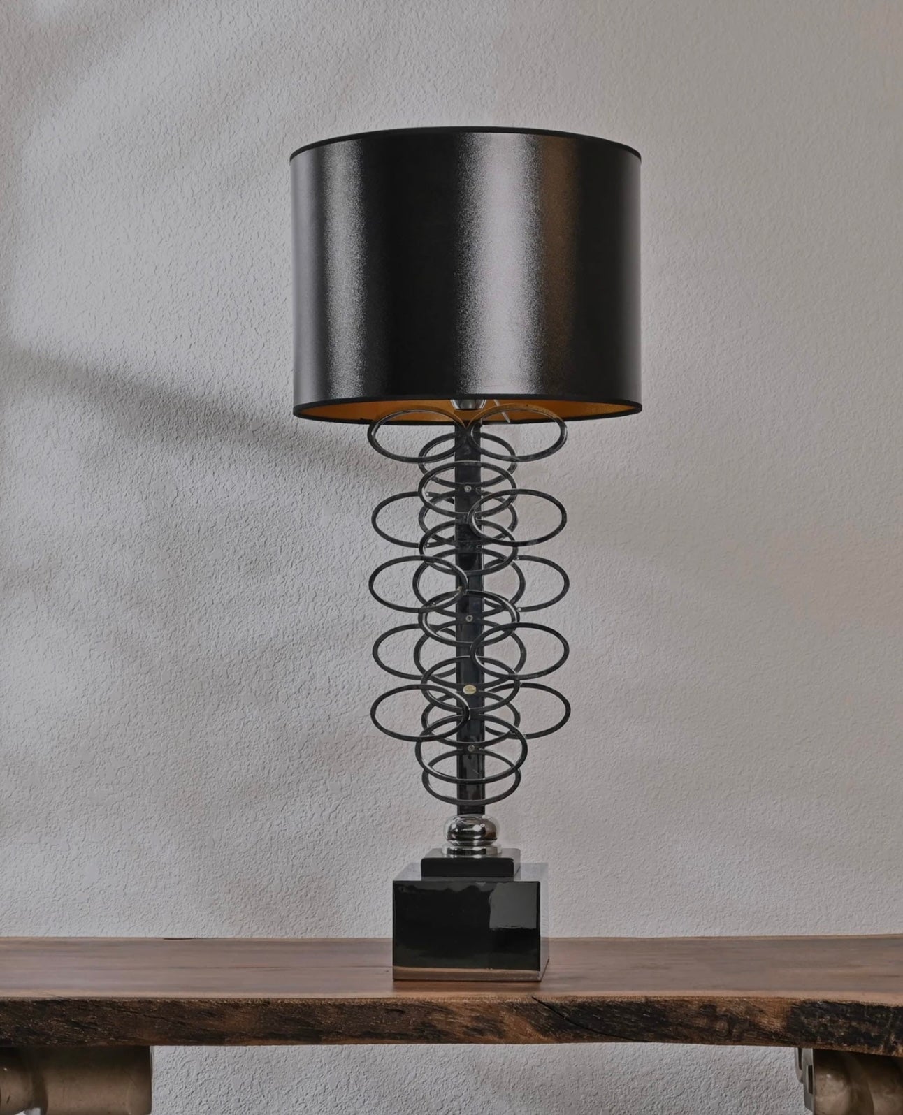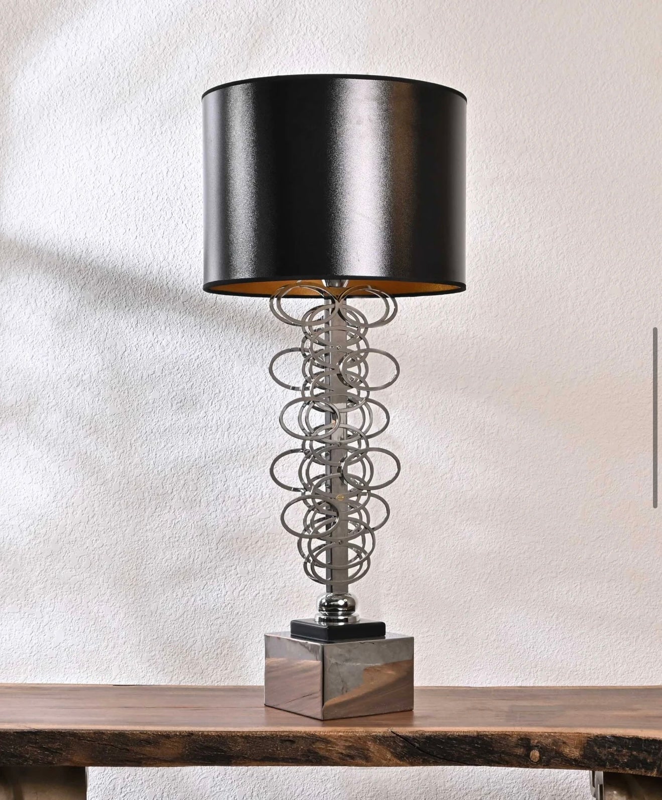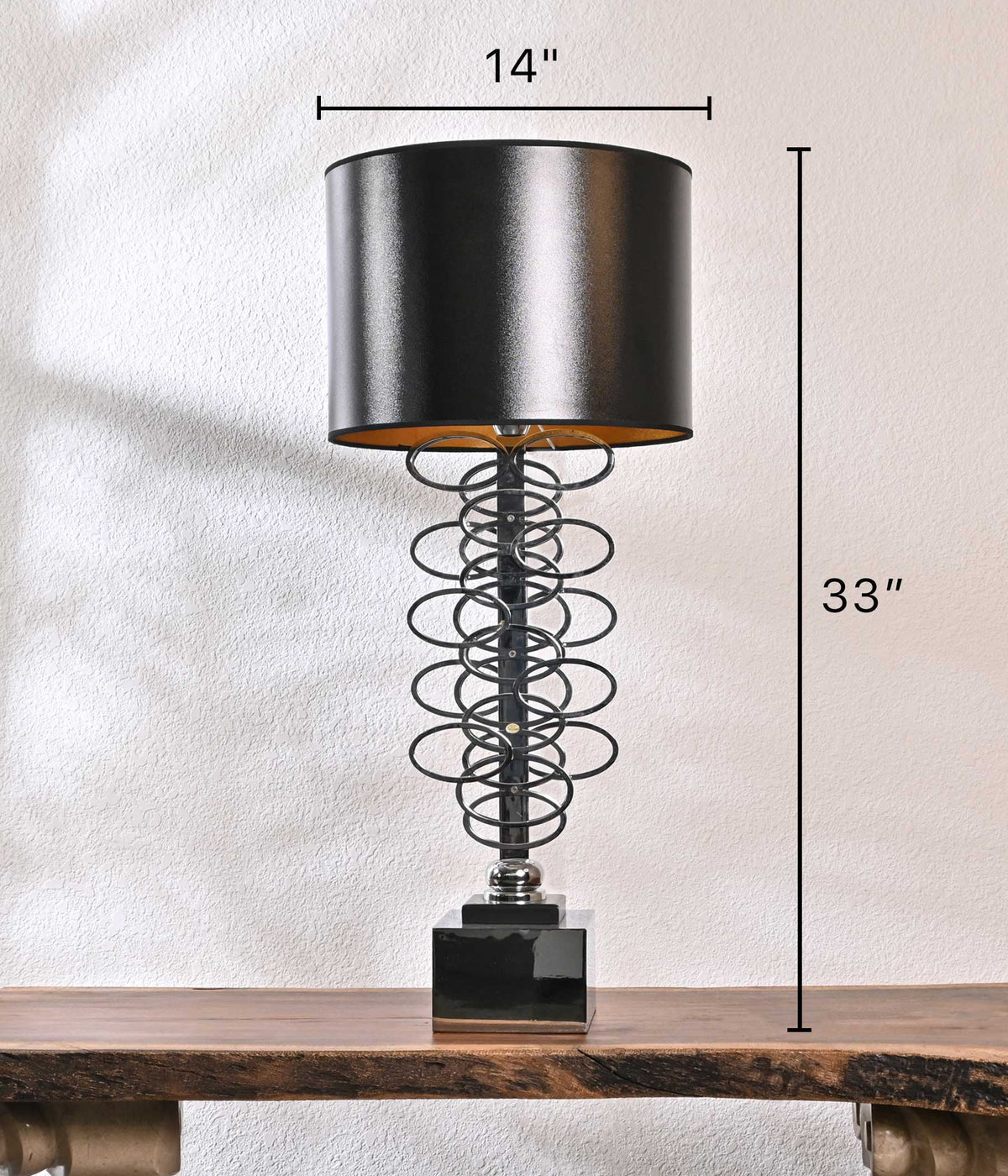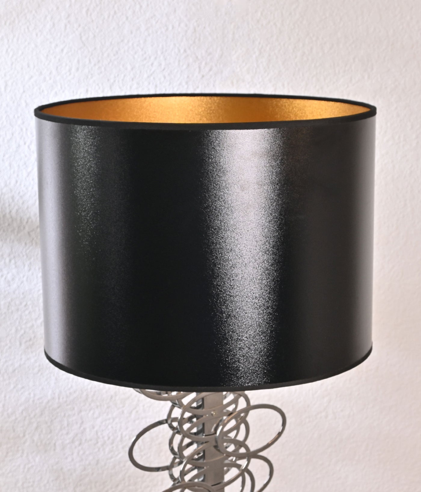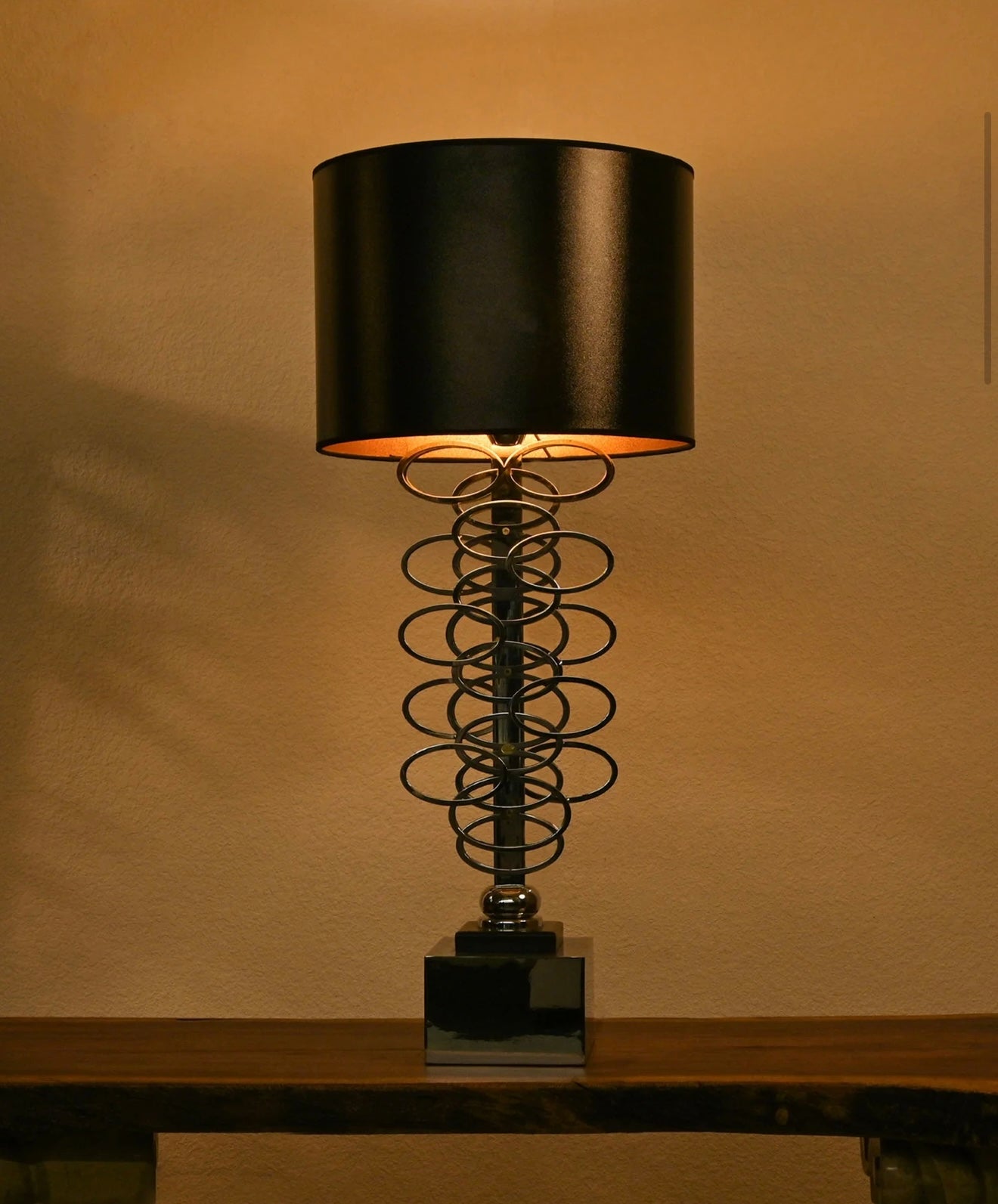 A metal chrome finished table lamp featuring components in matte black, complemented by a lampshade adorned in black and gold tones.