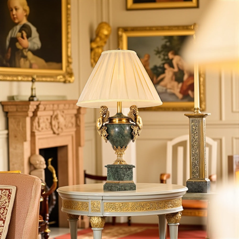 The lamp is constructed from marble and gilt bronze or brass. It features a pleated fabric lampshade. The base and body of the lamp are made of dark green marble, while the ornate handles, which are cast in the form of classical figures, are made of gilt bronze or brass.