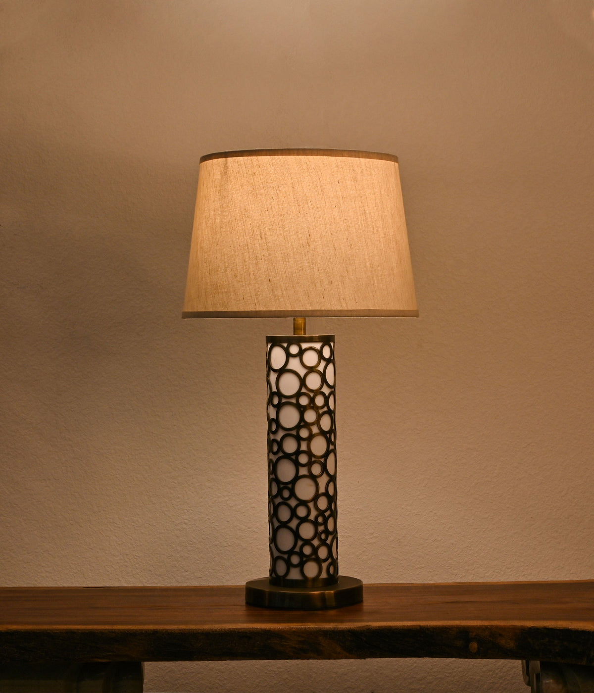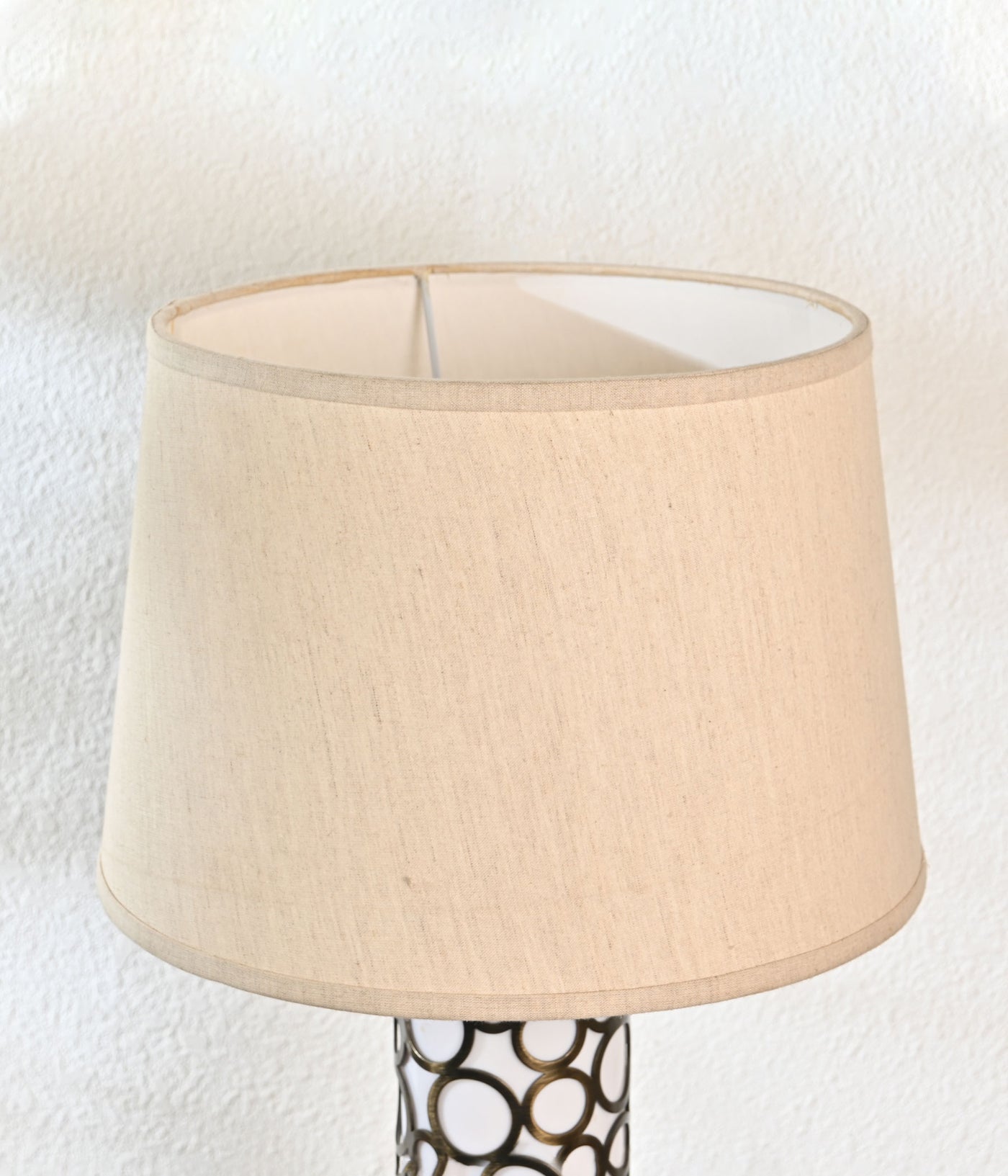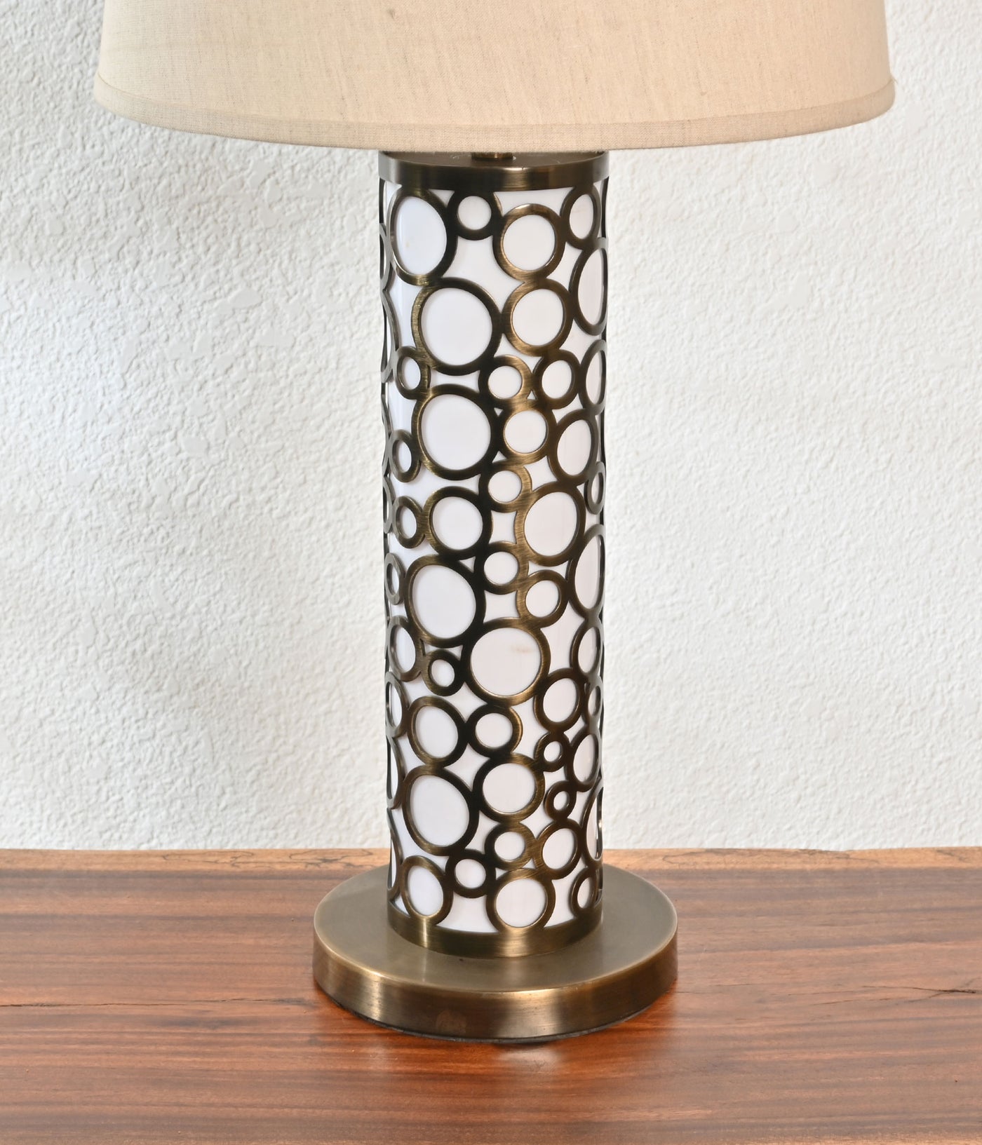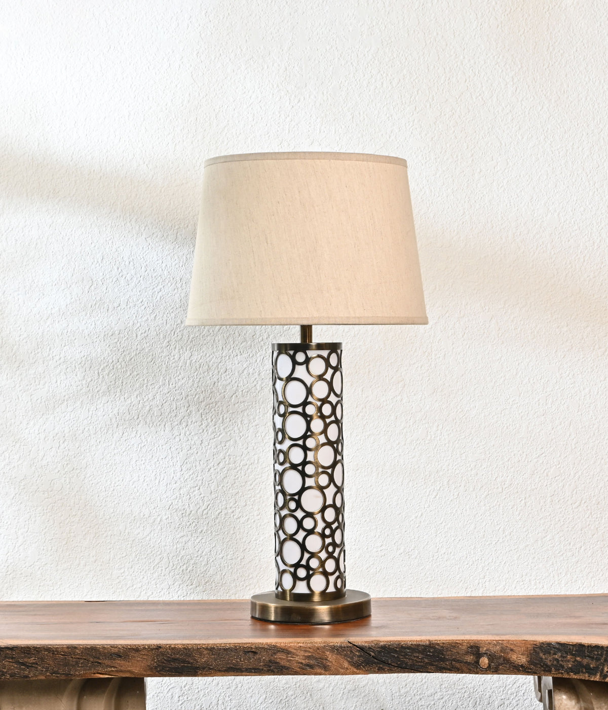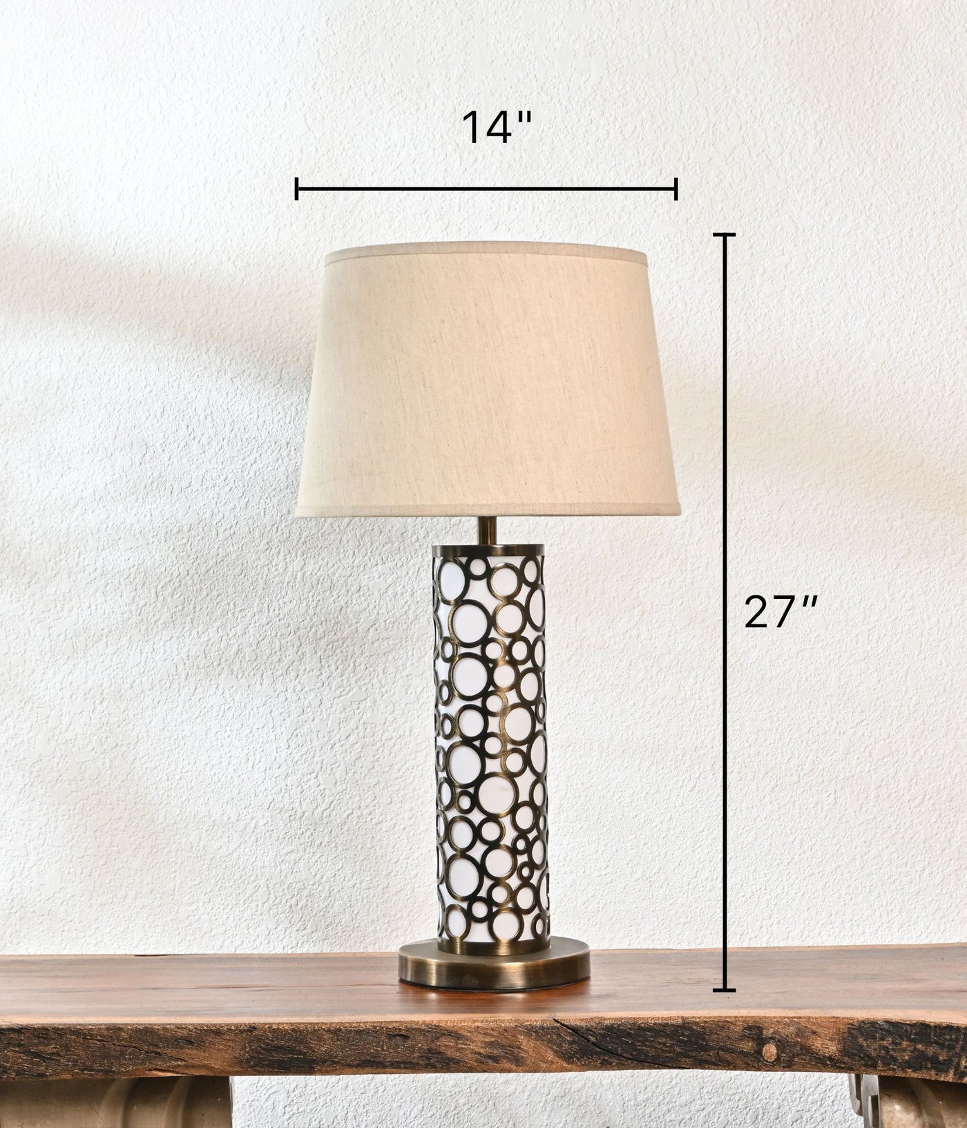This table lamp features a contemporary design with metal rings and an antique brass finish, complemented by an off-white fabric shade.