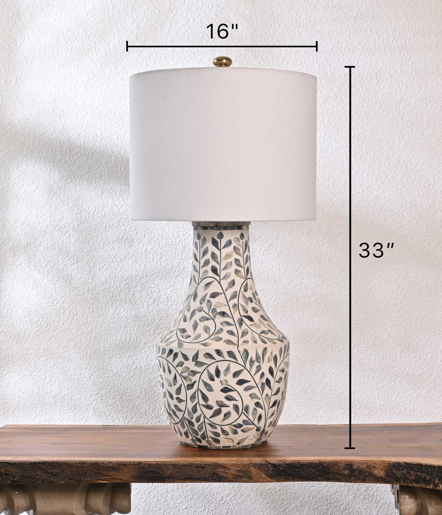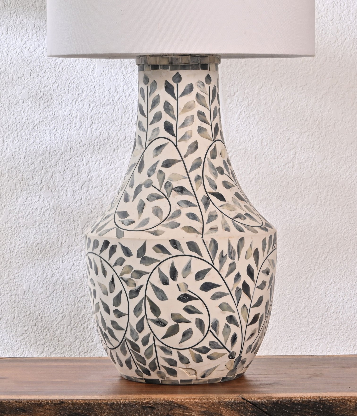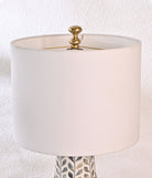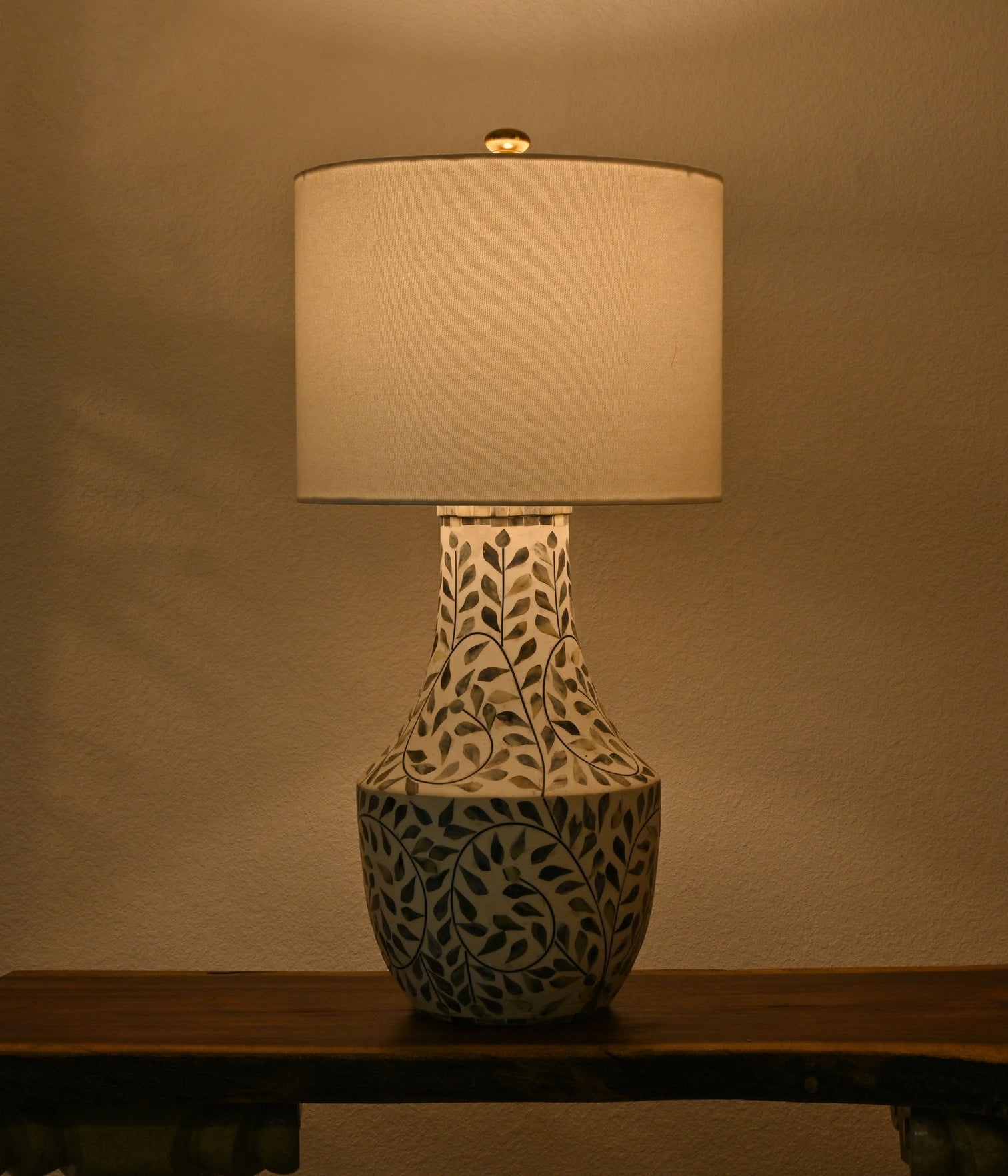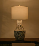 Exquisite blue and white inlay craftsmanship, complemented by an elegant off-white lamp shade, showcases an impeccable blend of sophistication and style