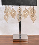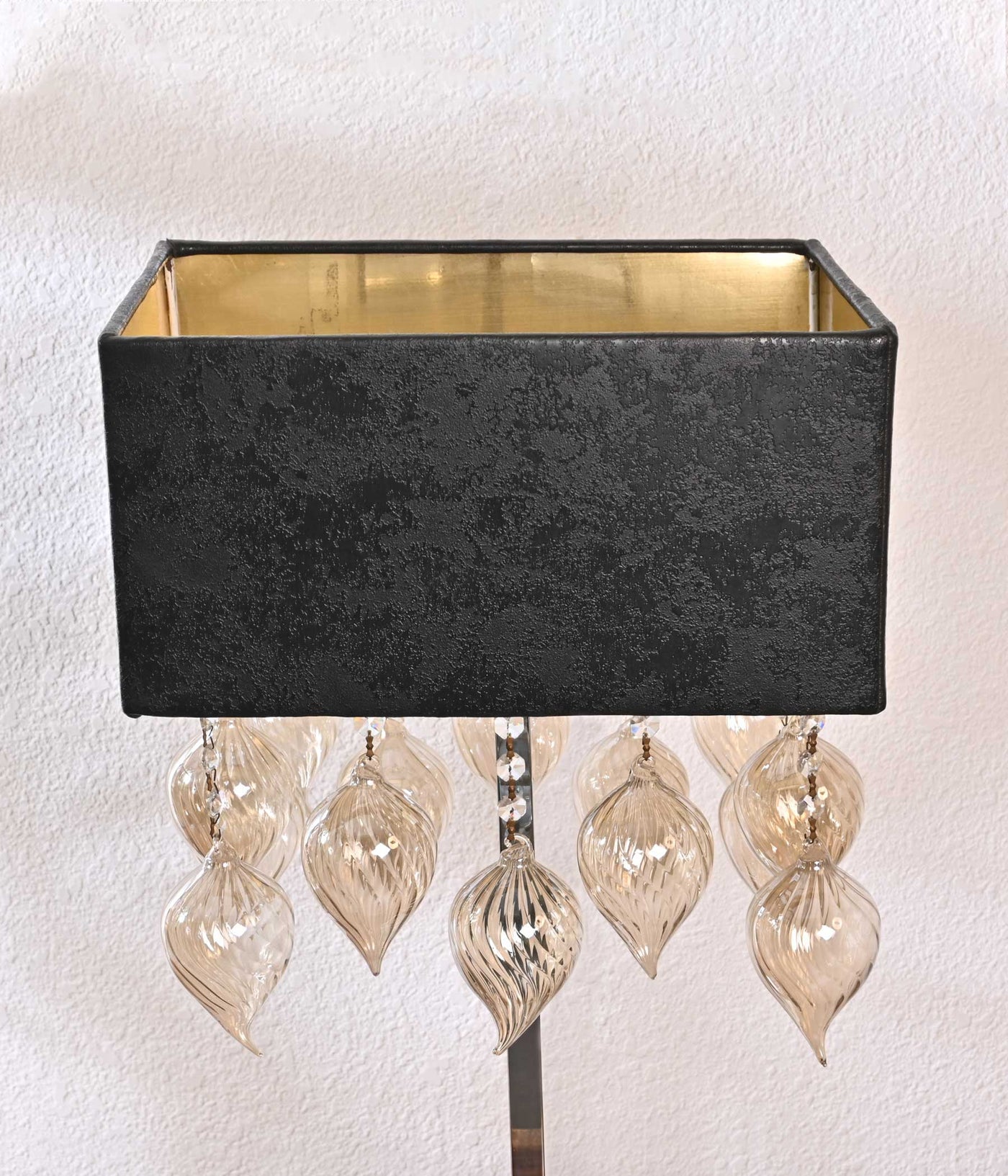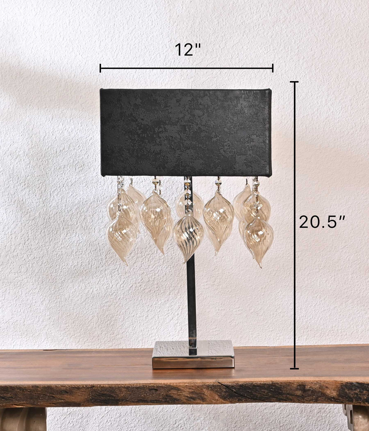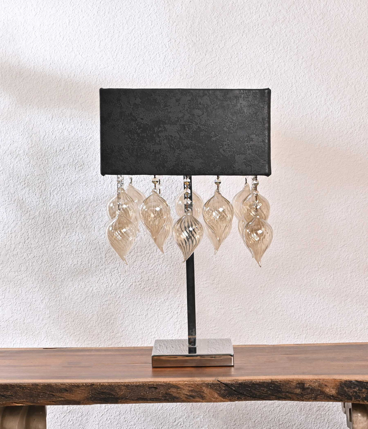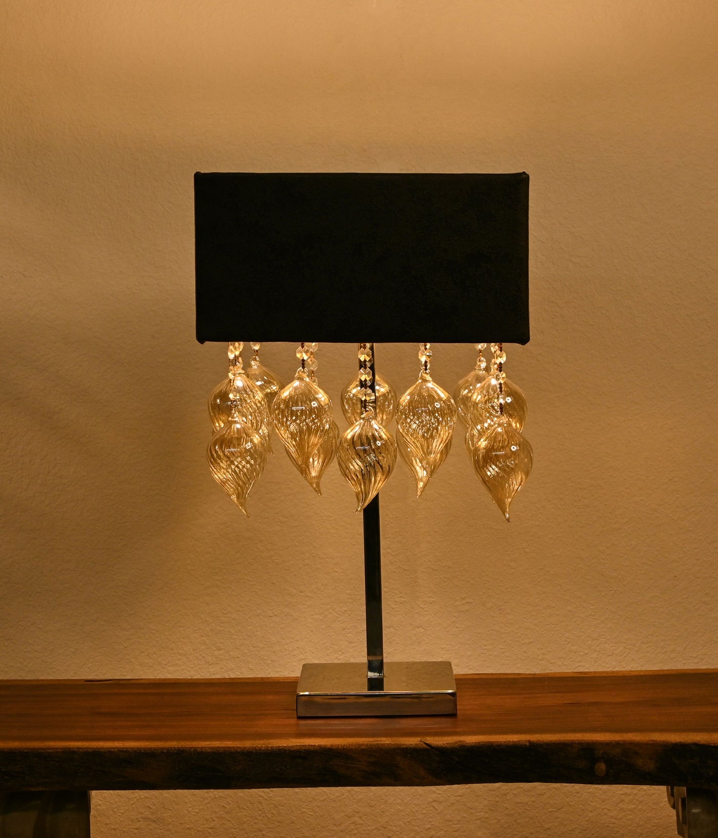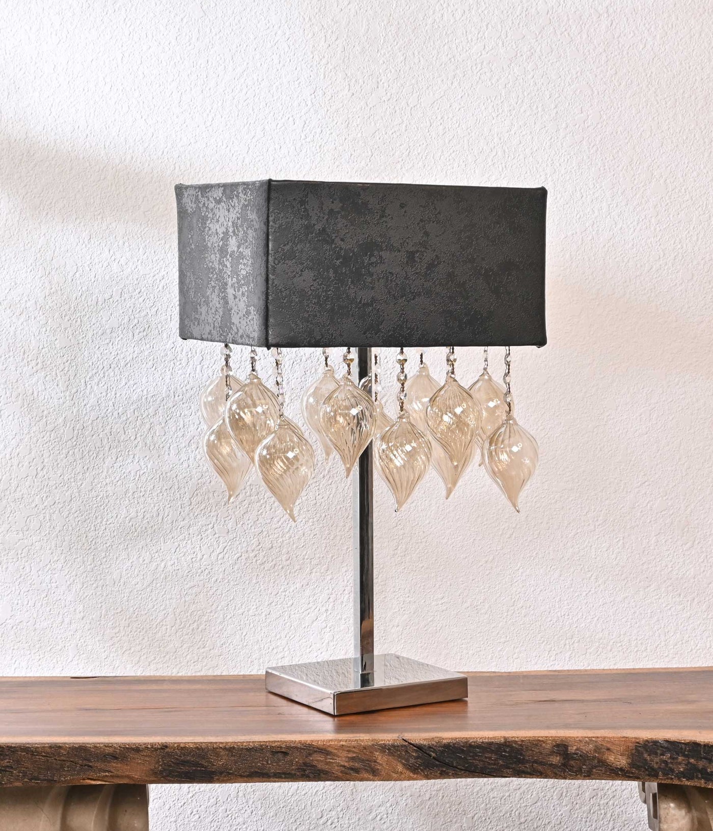 A table lamp featuring a sleek chrome finish, complemented by a luxurious leatherite lamp shade. Additionally, it comes adorned with meticulously crafted, hand-blown glass accessories suspended elegantly.