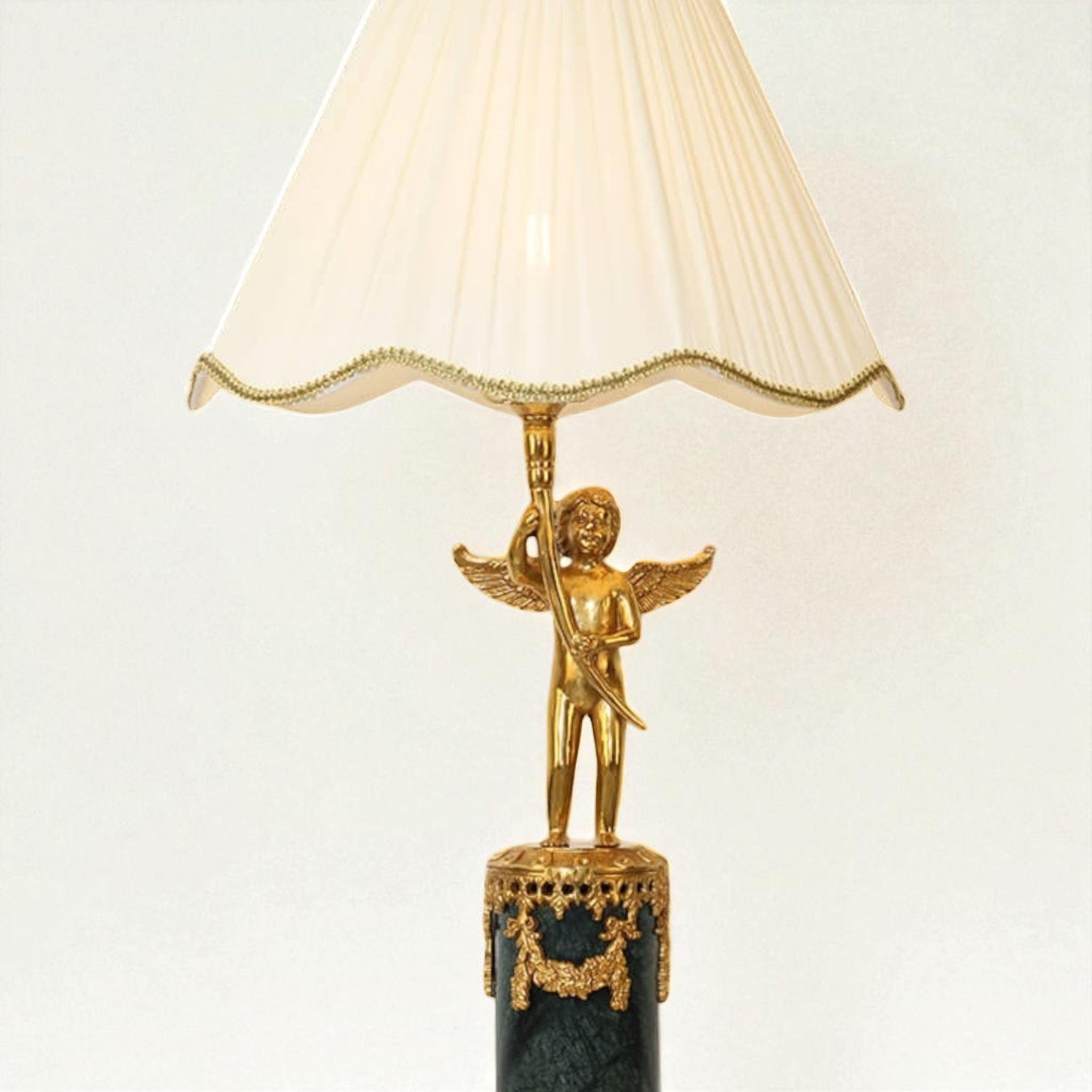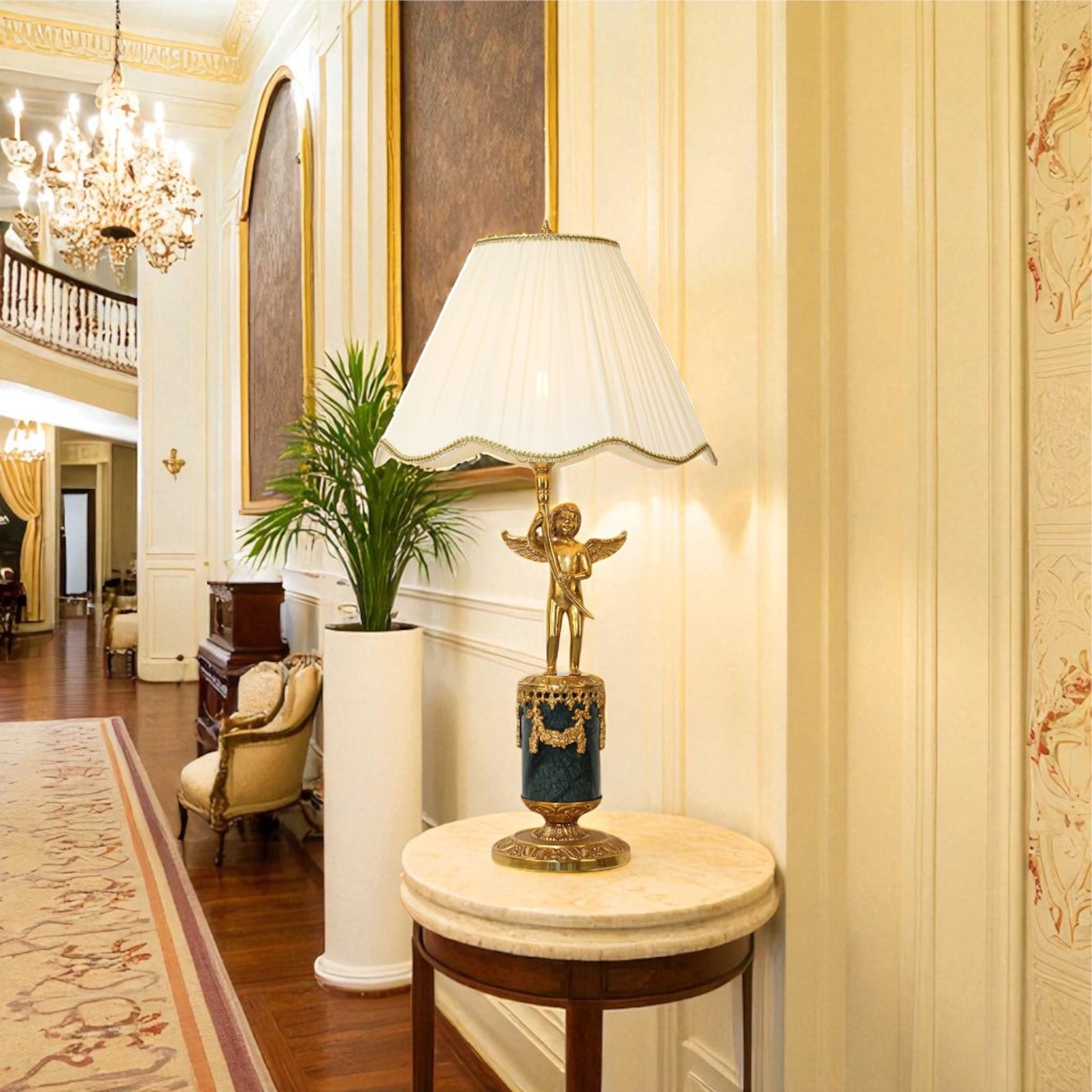 The lamp features a brass figure of a winged Cupid holding a torch-like light. The figure stands on a circular base made of a dark, possibly marble or spelter, material with ornate brass detailing. The lamp is topped with a pleated, off-white fabric lampshade.