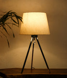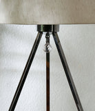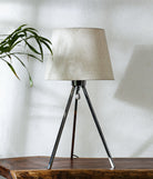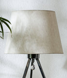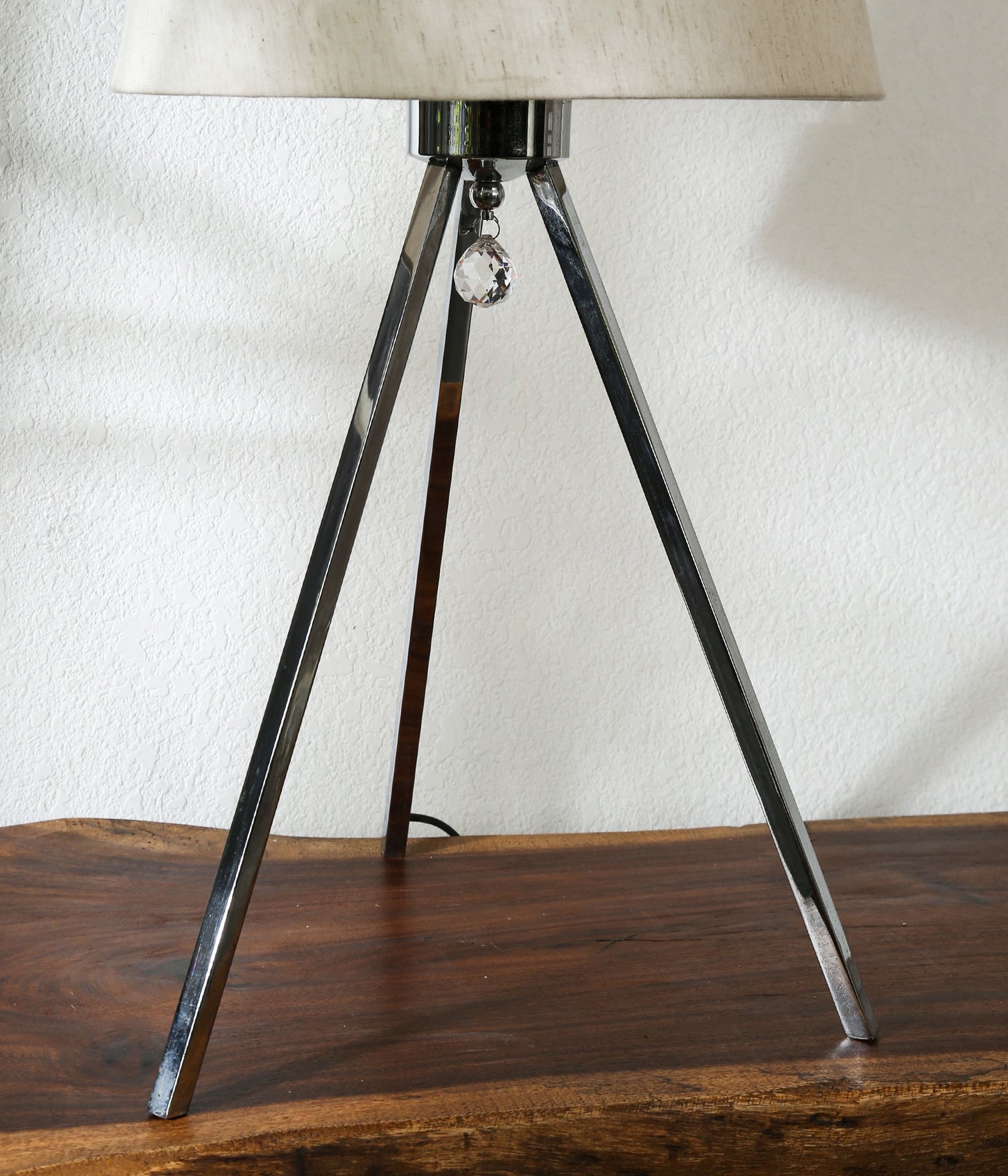Sculptural yet simple, this tripod table lamp stands tall with a polished steel silhouette that demands attention. Its clean off-white shade diffuses gentle light, adding a touch of modern sophistication and a cozy atmosphere to any room it graces.
