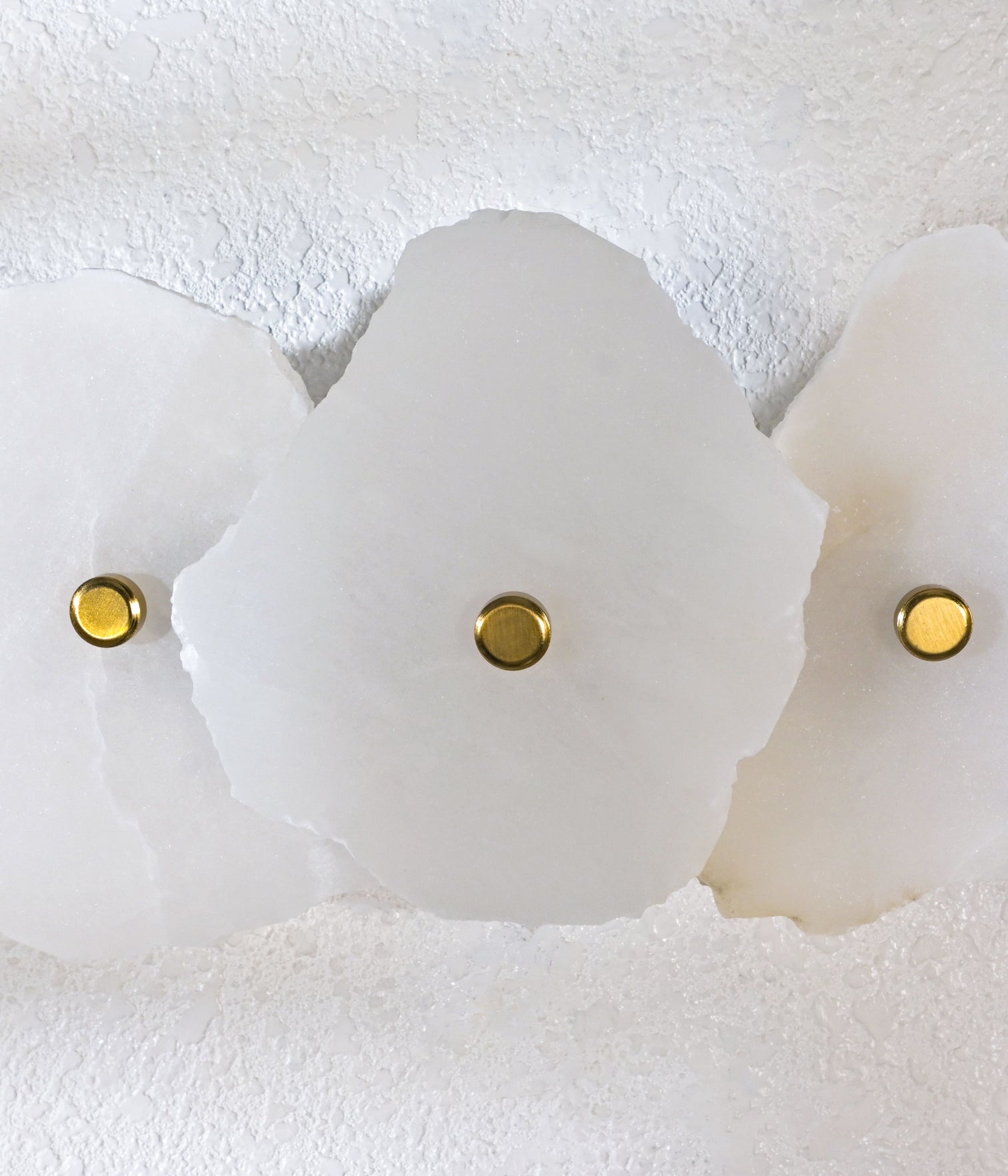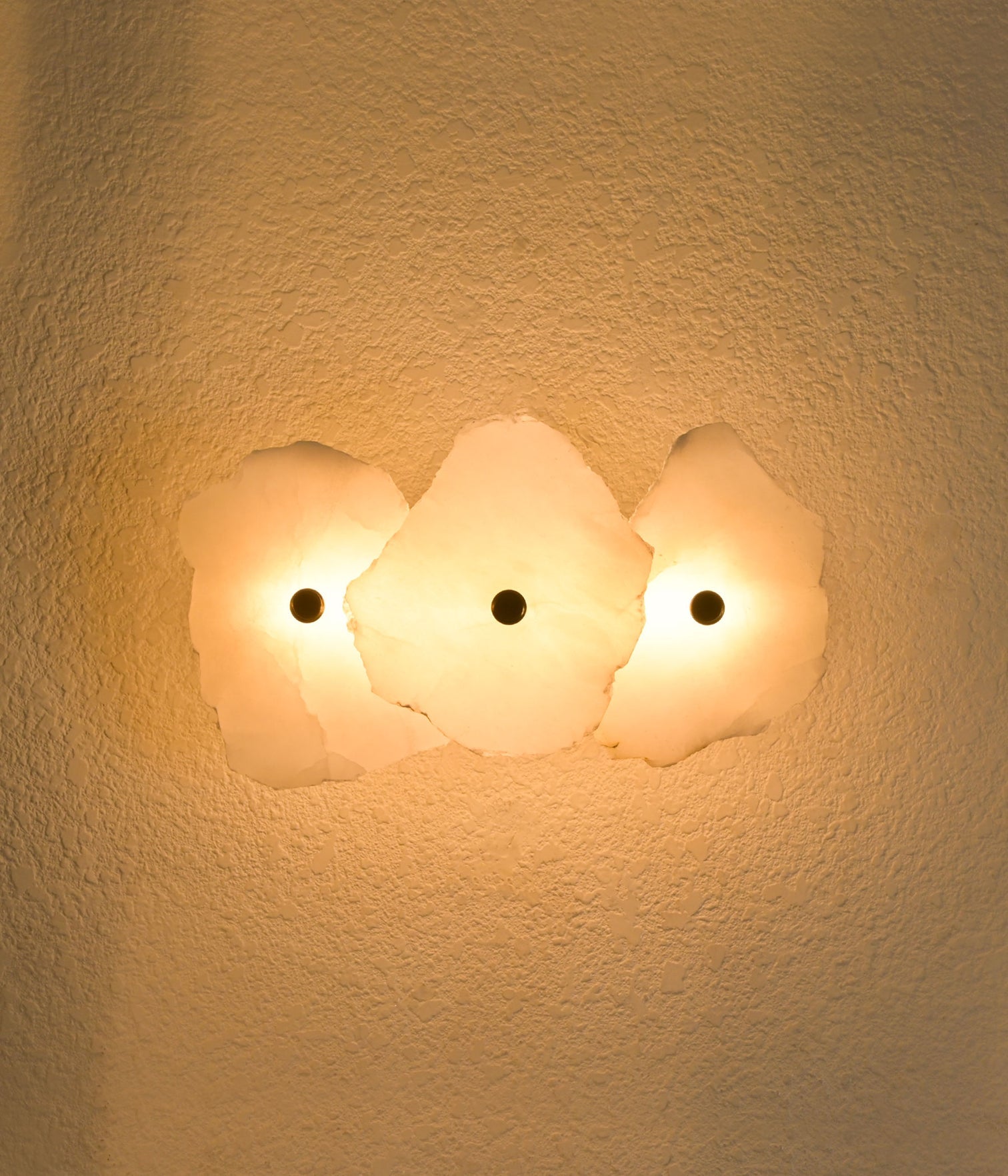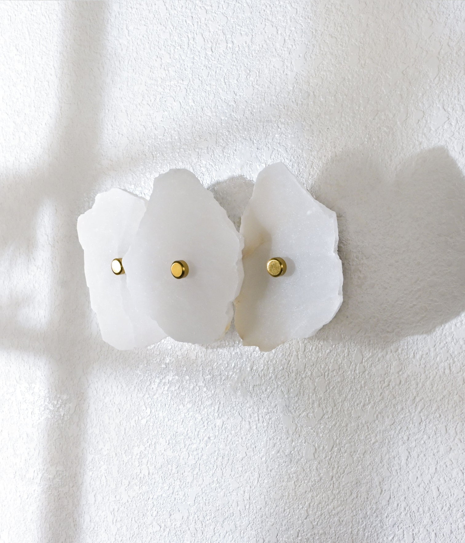 This alabaster stone wall light with a matt brass finish offers a fresh take on lighting. Its unique shape and subtle glow create a serene atmosphere, perfect for any modern interior.
