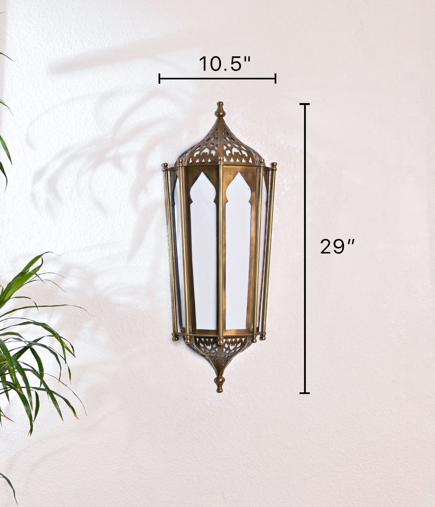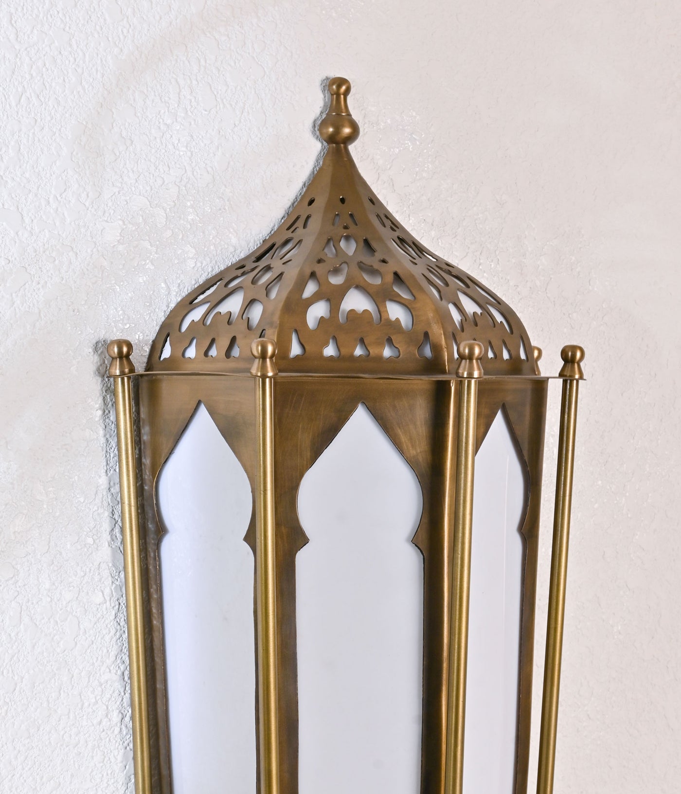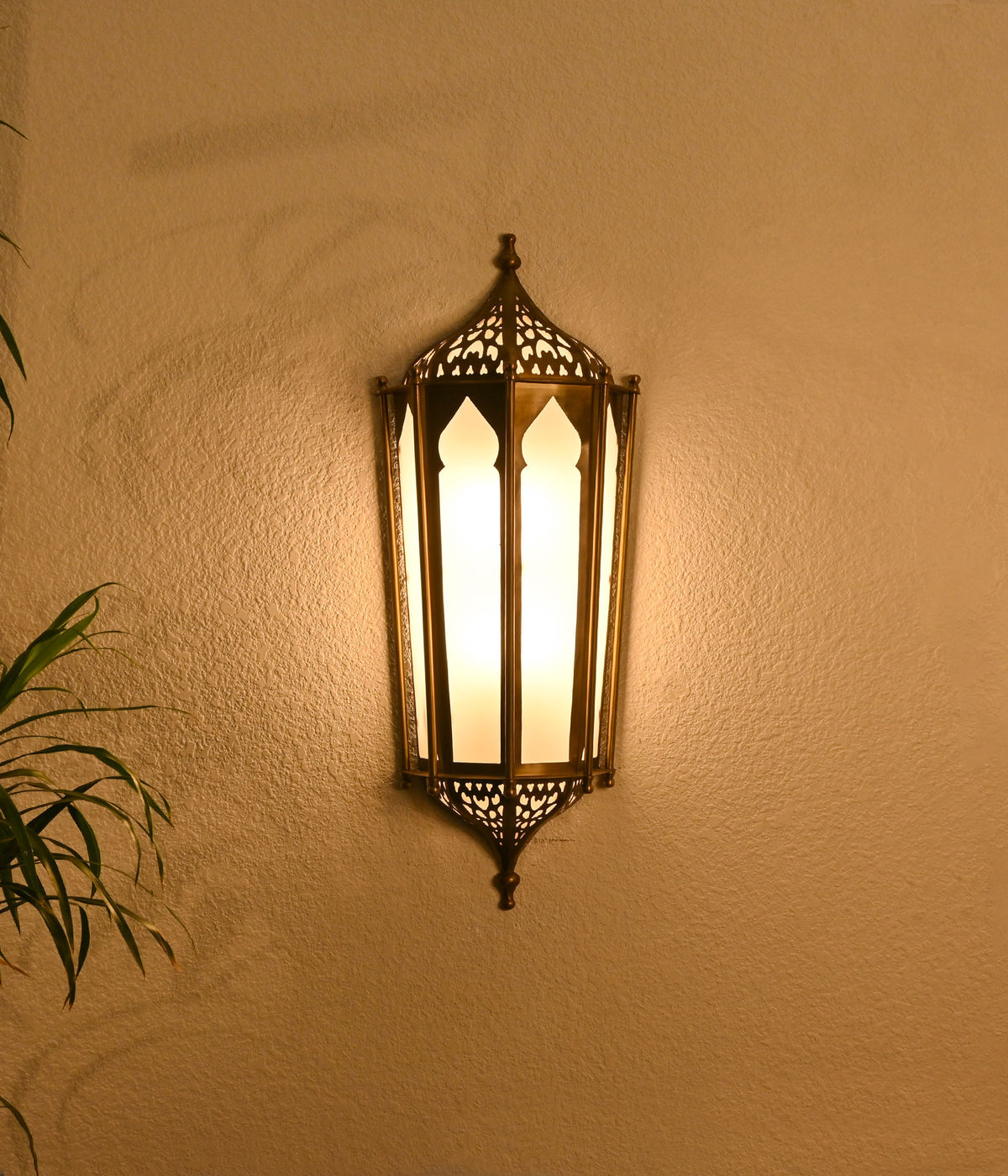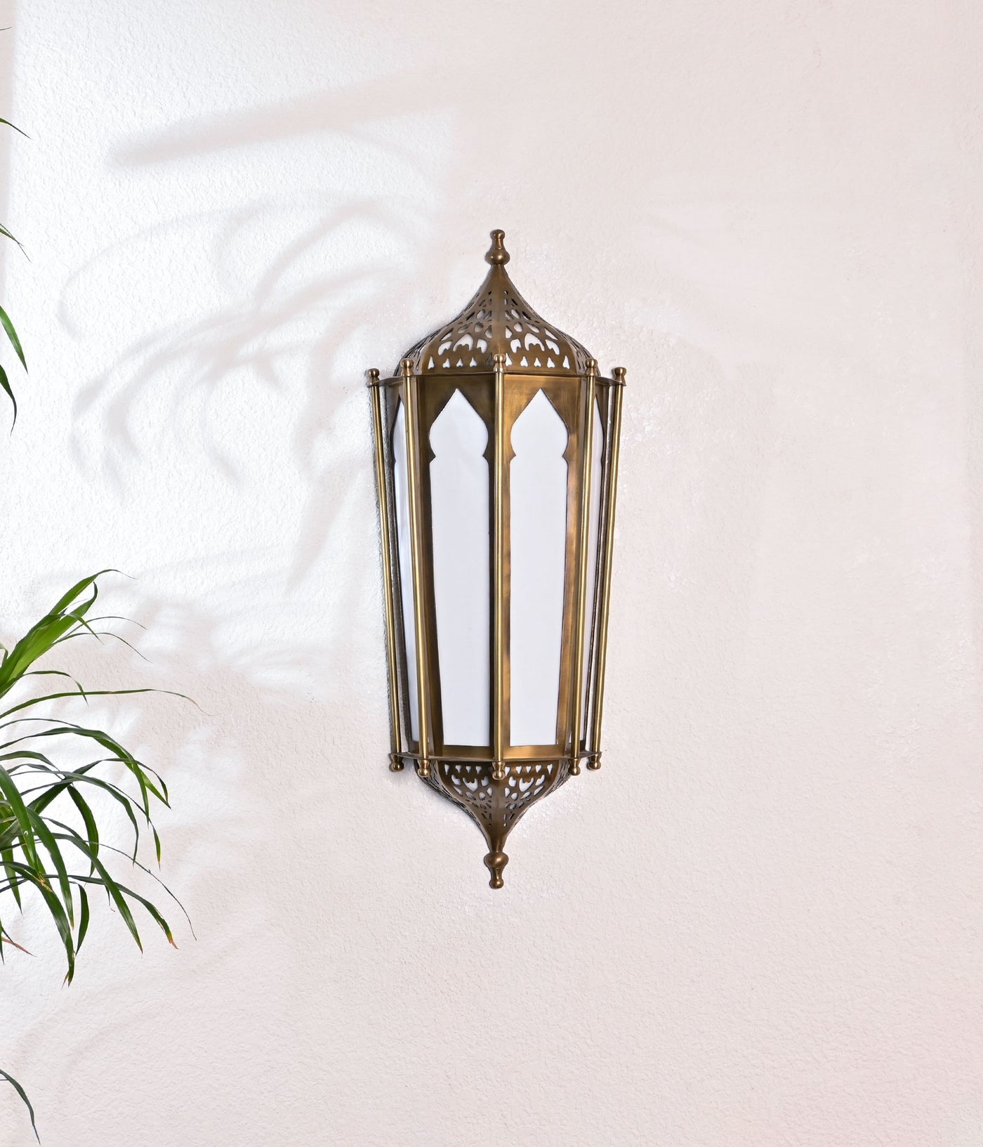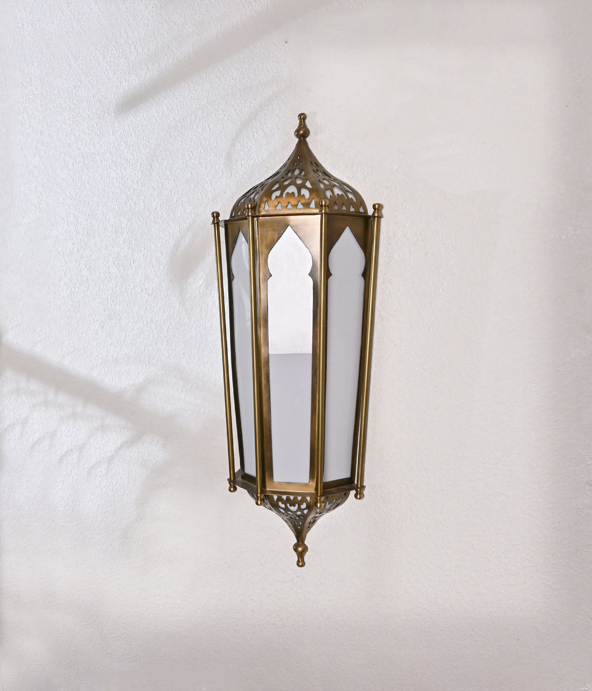 This Moroccan-inspired wall light, crafted in an aged brass finish, adds a touch of exotic elegance to your decor. The intricate design and warm brass tones create a captivating focal point in any room.