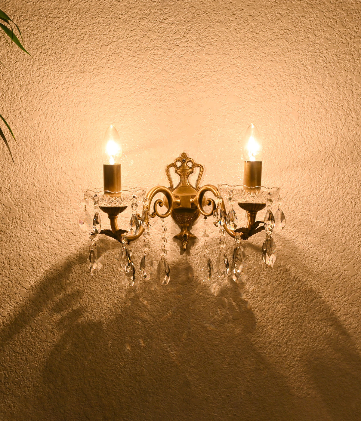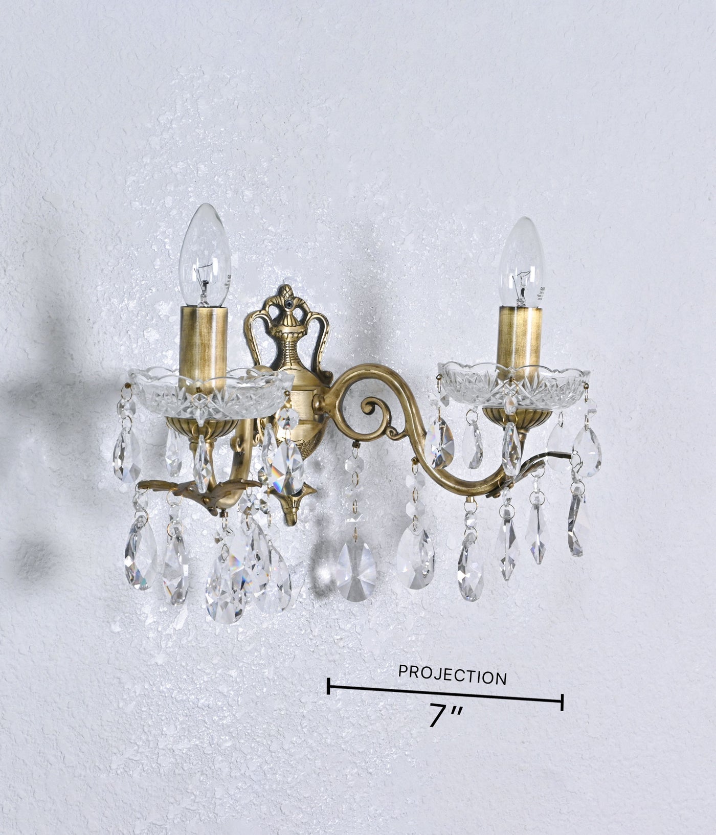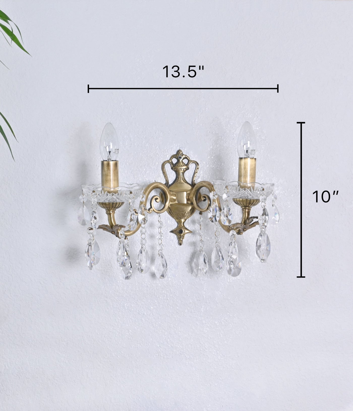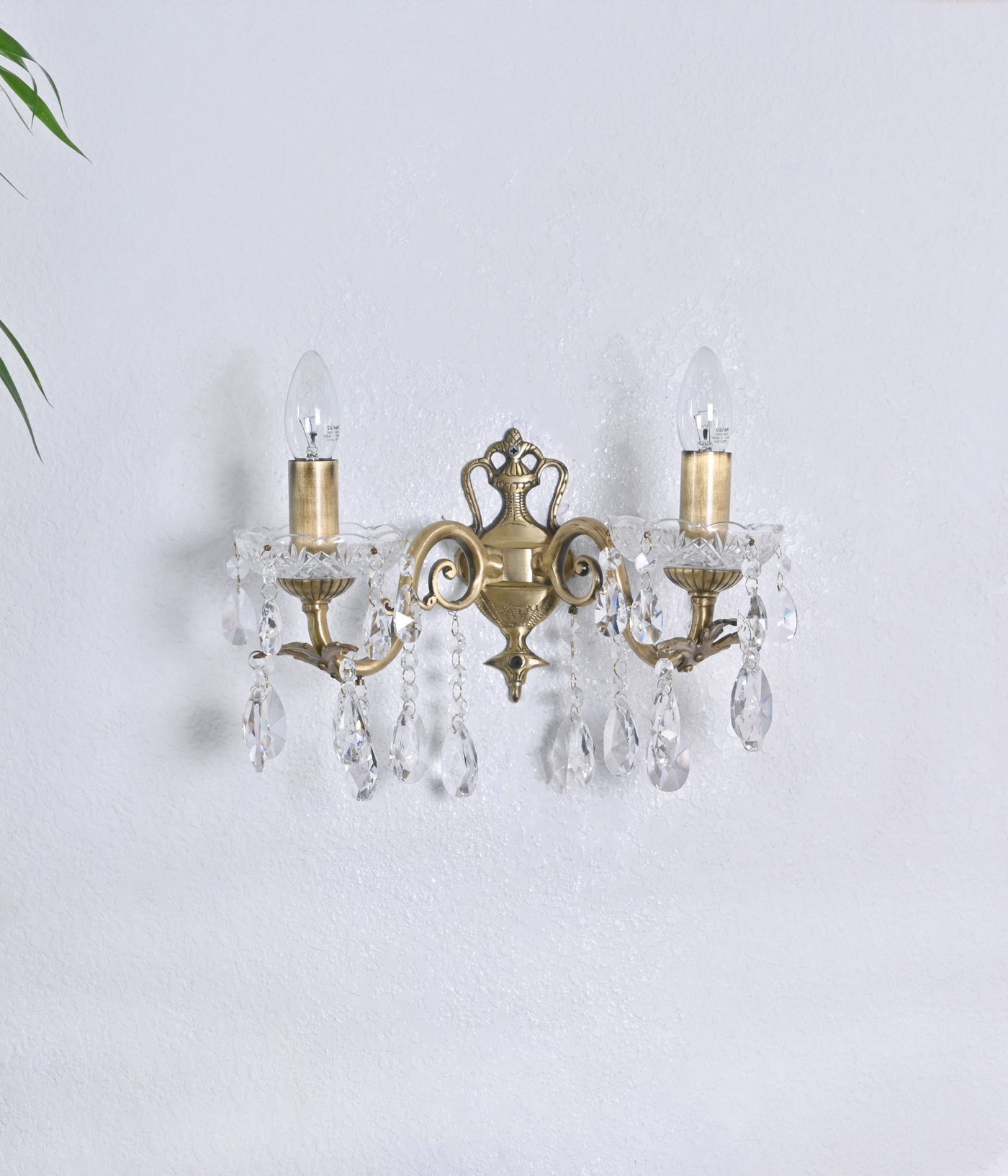 Embrace timeless elegance with this brass wall fixture boasting two arms adorned with shimmering crystals, finished in radiant brass gold.