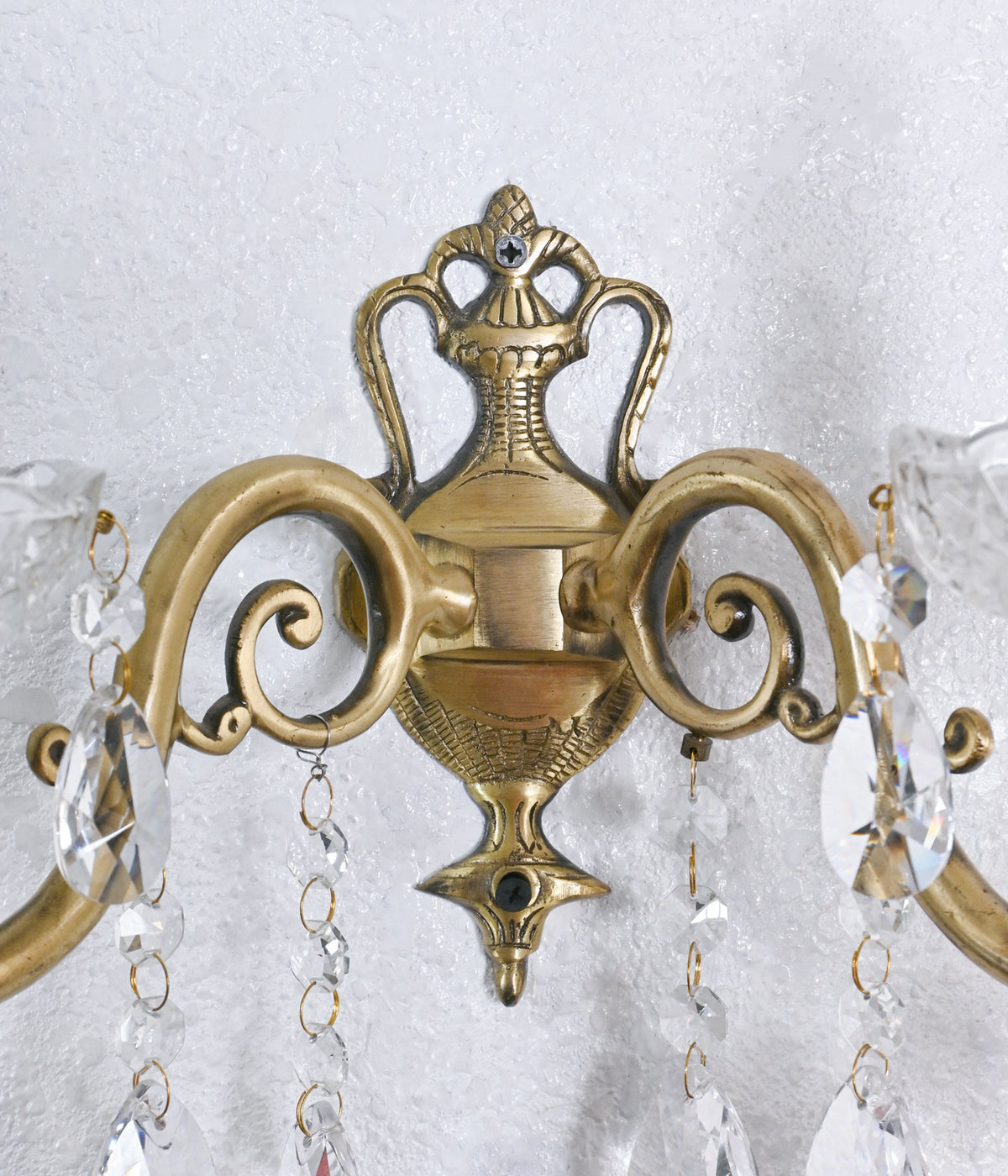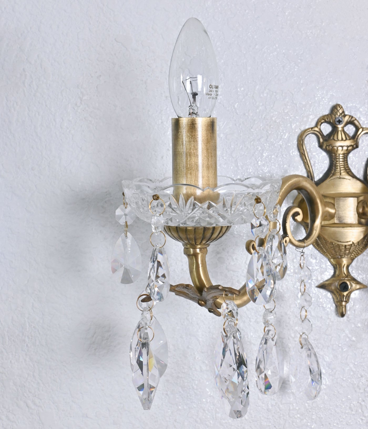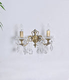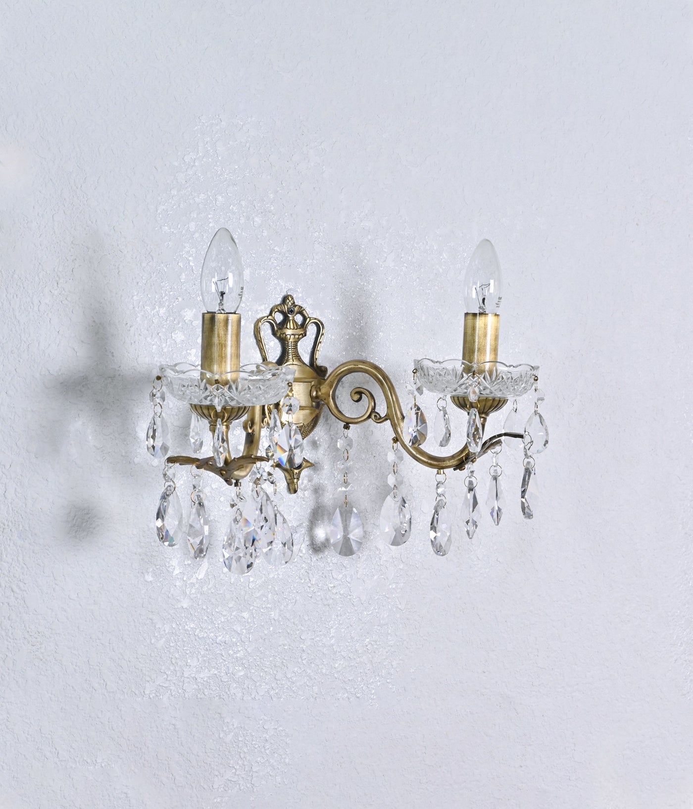 Embrace timeless elegance with this brass wall fixture boasting two arms adorned with shimmering crystals, finished in radiant brass gold.