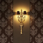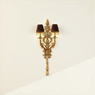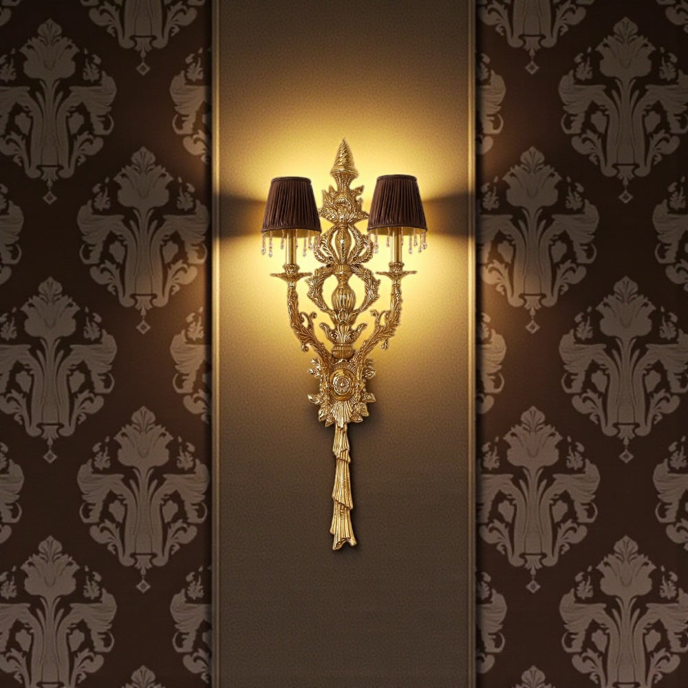 The lamp features an elegant, ornate design with a lustrous brass finish and two light sources. Each light has a fabric lampshade, and the fixture has intricate detailing and a decorative tassel-like element at the bottom. It is typically designed for use in living rooms, bedrooms, or hallways to create a warm, ambient atmosphere.