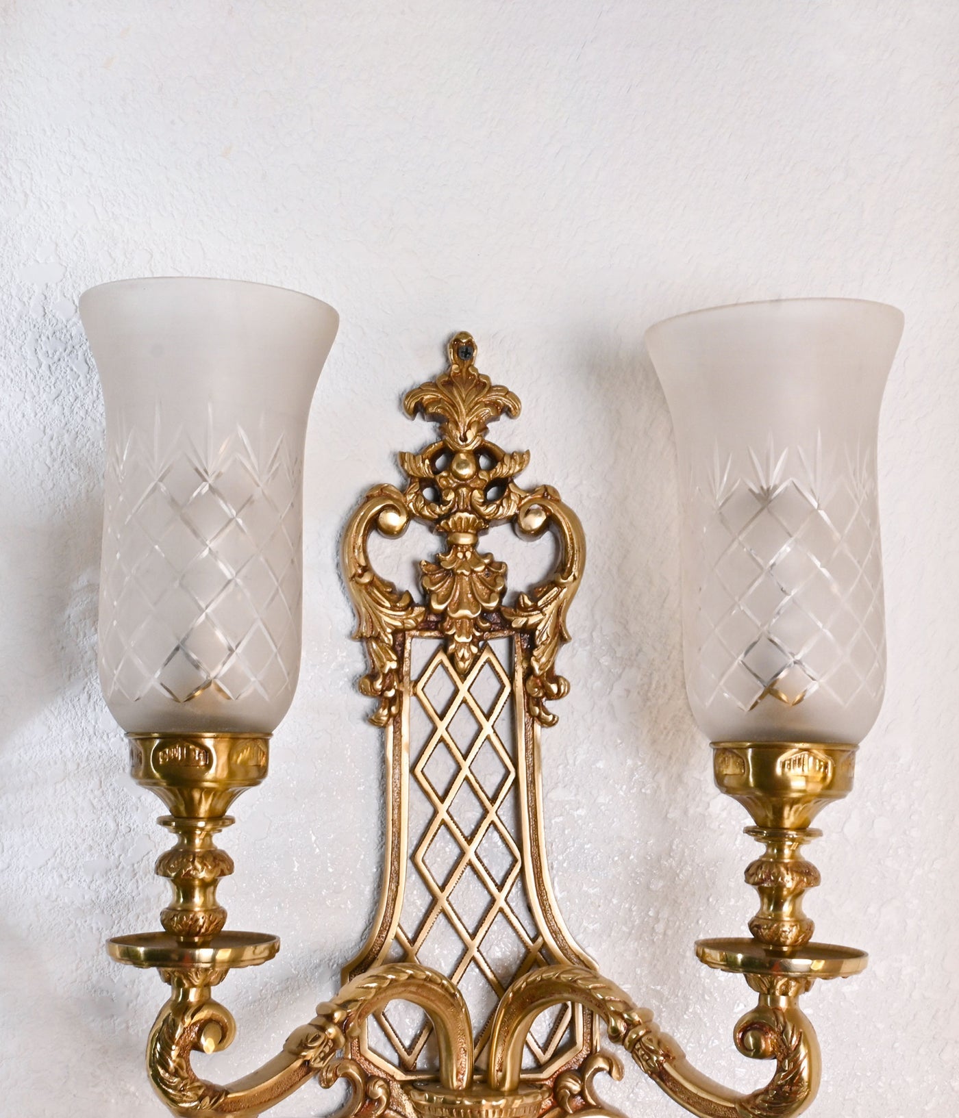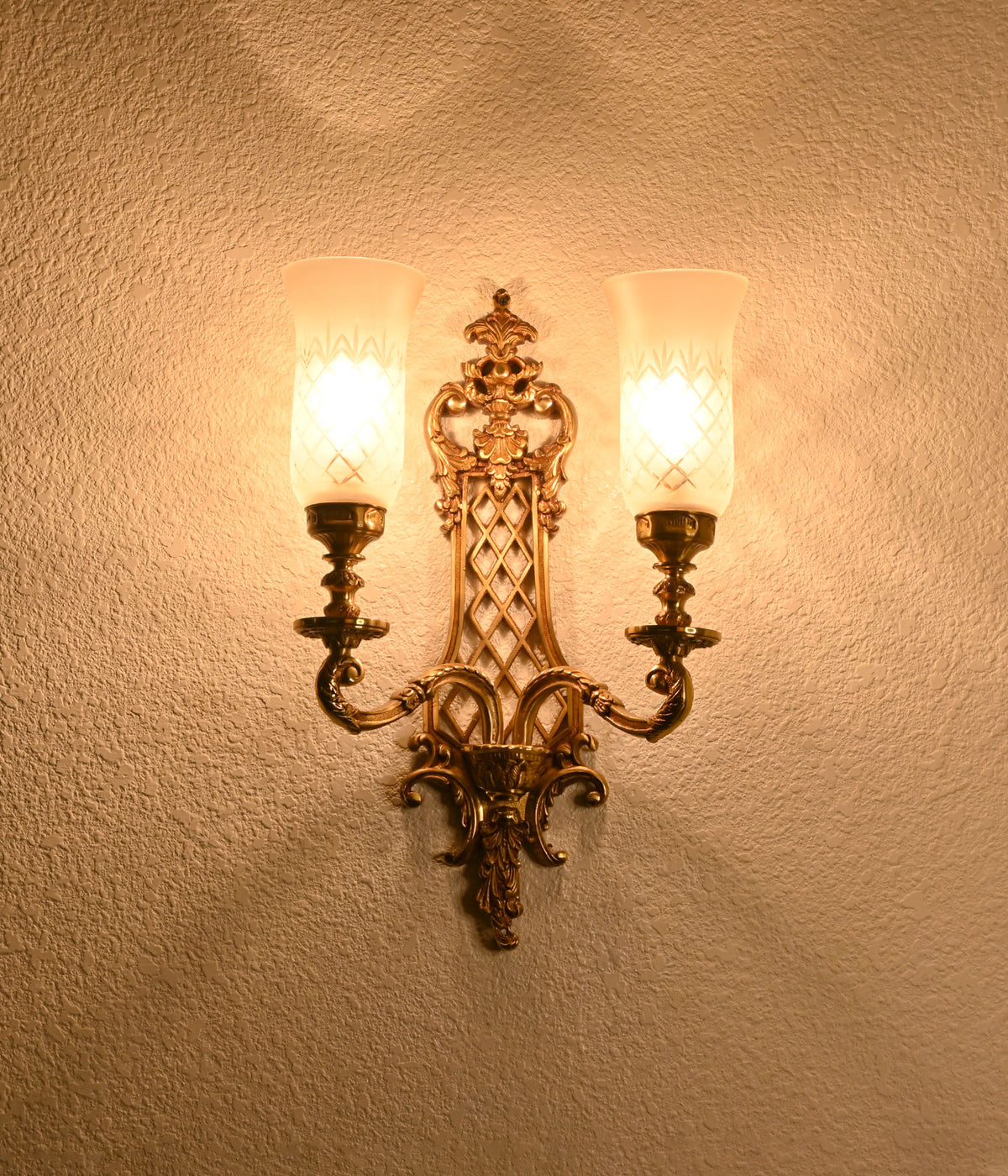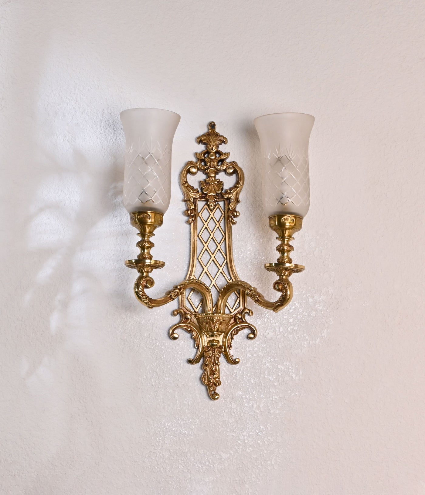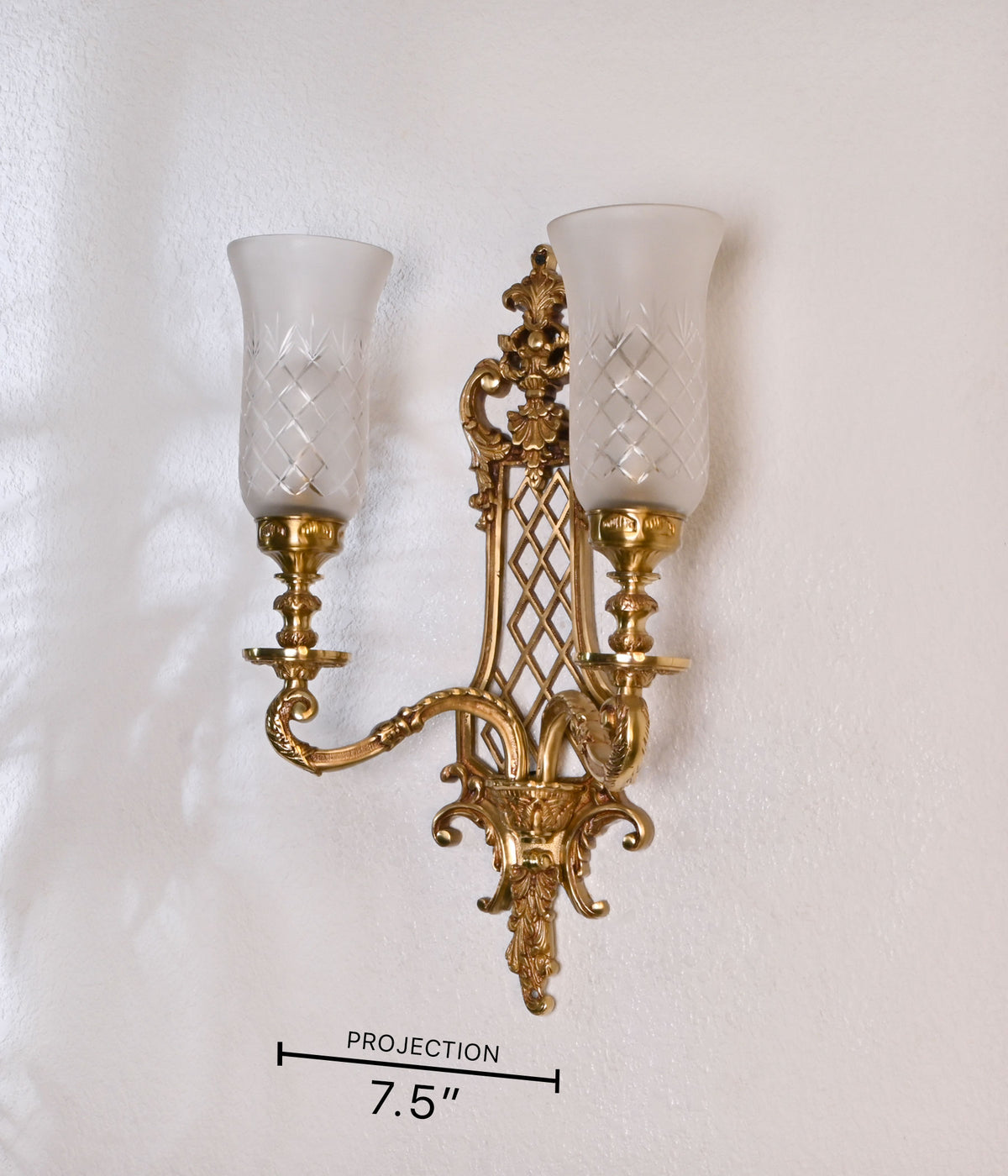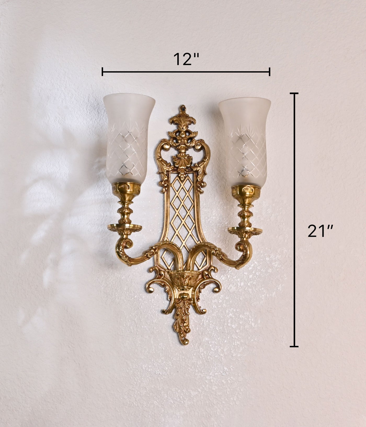 Experience the elegance of our Royal Double Casted brass Wall Light, featuring exquisite Frosted Hand Cut Glass Shades. Elevate your space with timeless sophistication and refined craftsmanship.