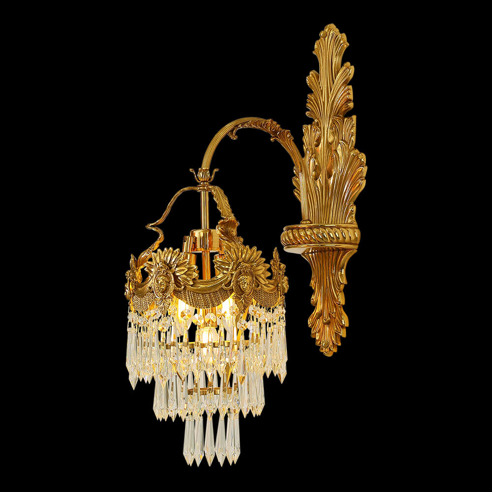 The image shows an ornate brass and crystal wall lamp, also known as a wall sconce, with a traditional or classic design. The lamp features a carved brass frame and hanging crystal pendants.