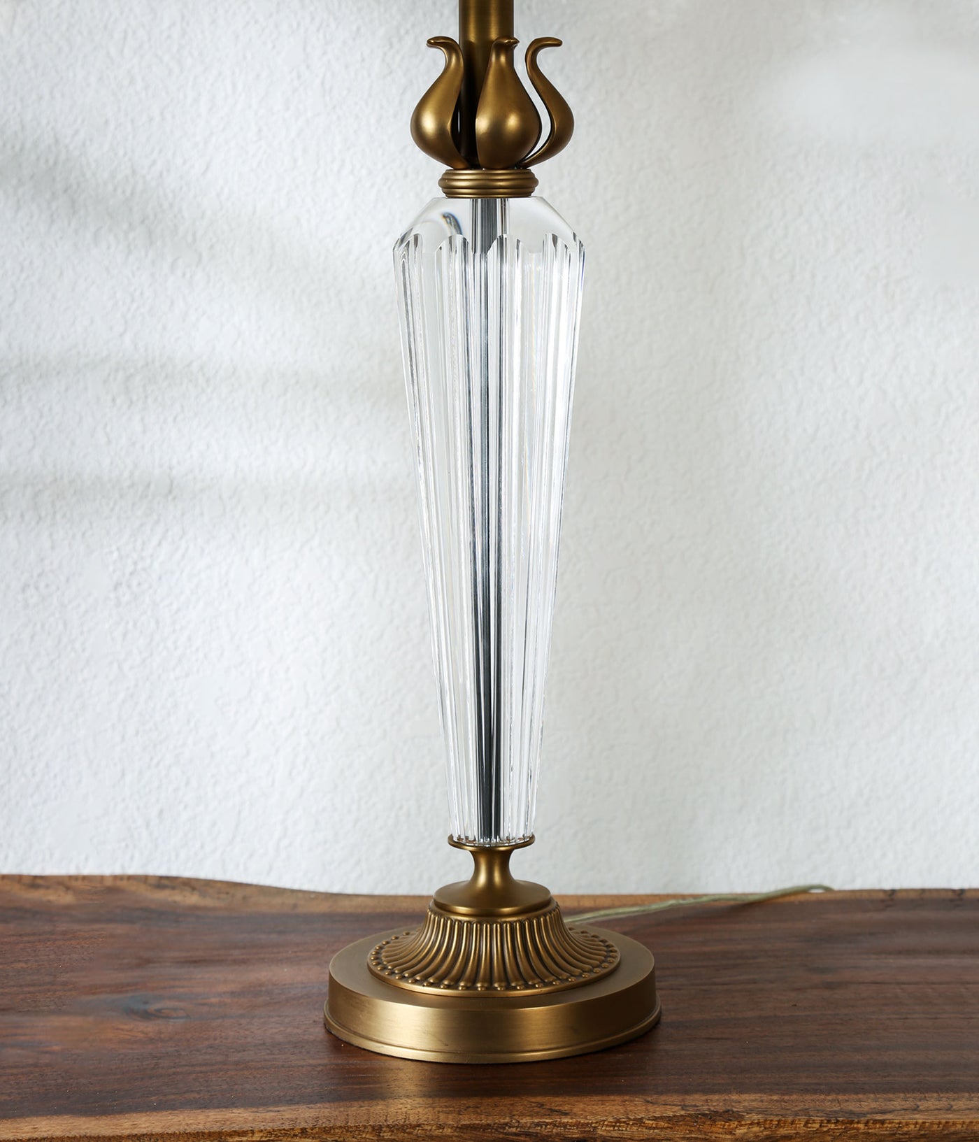 Featuring a fluted crystal glass body, this lamp catches and reflects ambient light, bringing sparkle and depth to your décor. The transparent design seamlessly complements the antique brass-finished base, offering a refined contrast and luxurious appeal. Its handcrafted scalloped fabric shade is made from premium linen-texture material in an elegant ivory cream tone, gently diffusing light to create a soft, ambient glow.