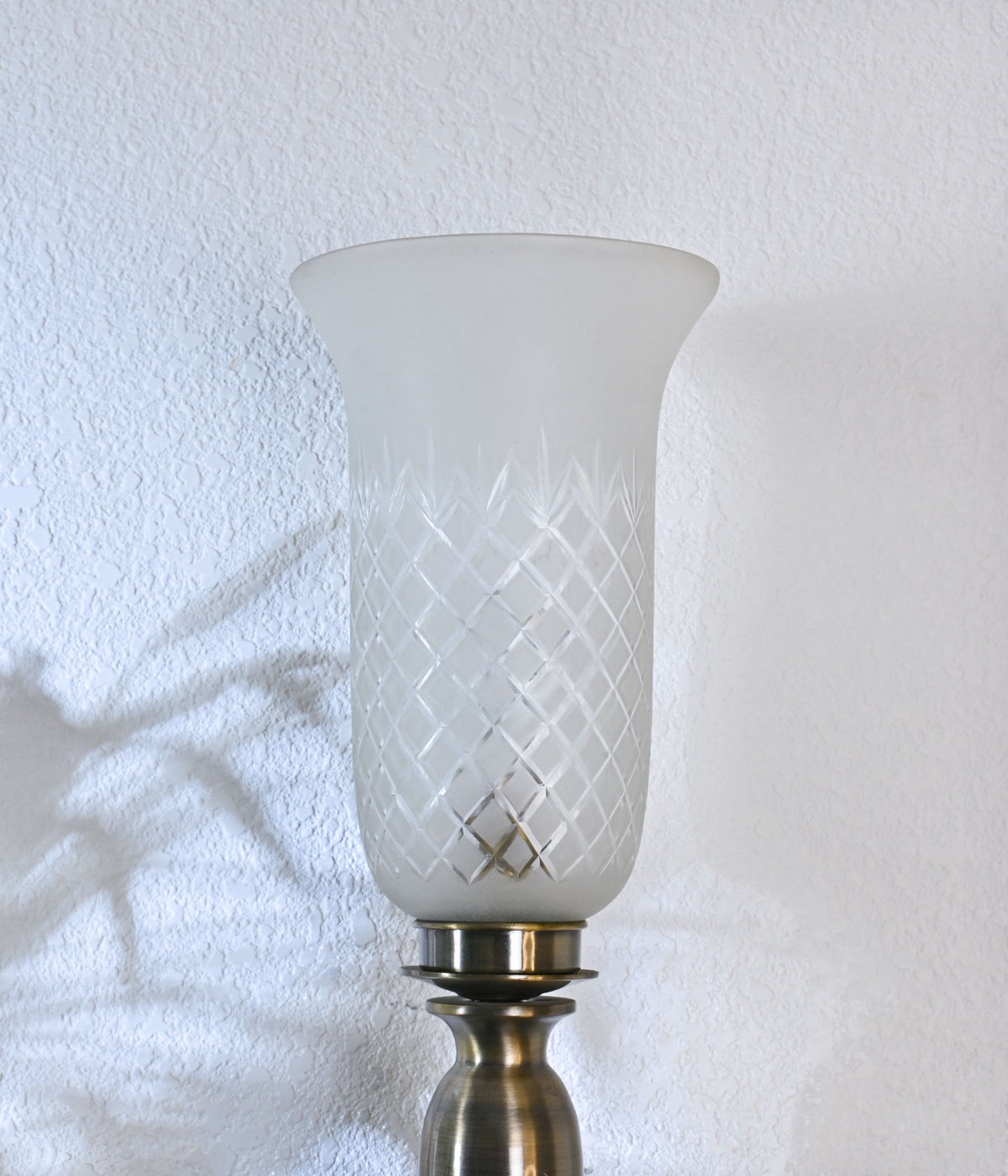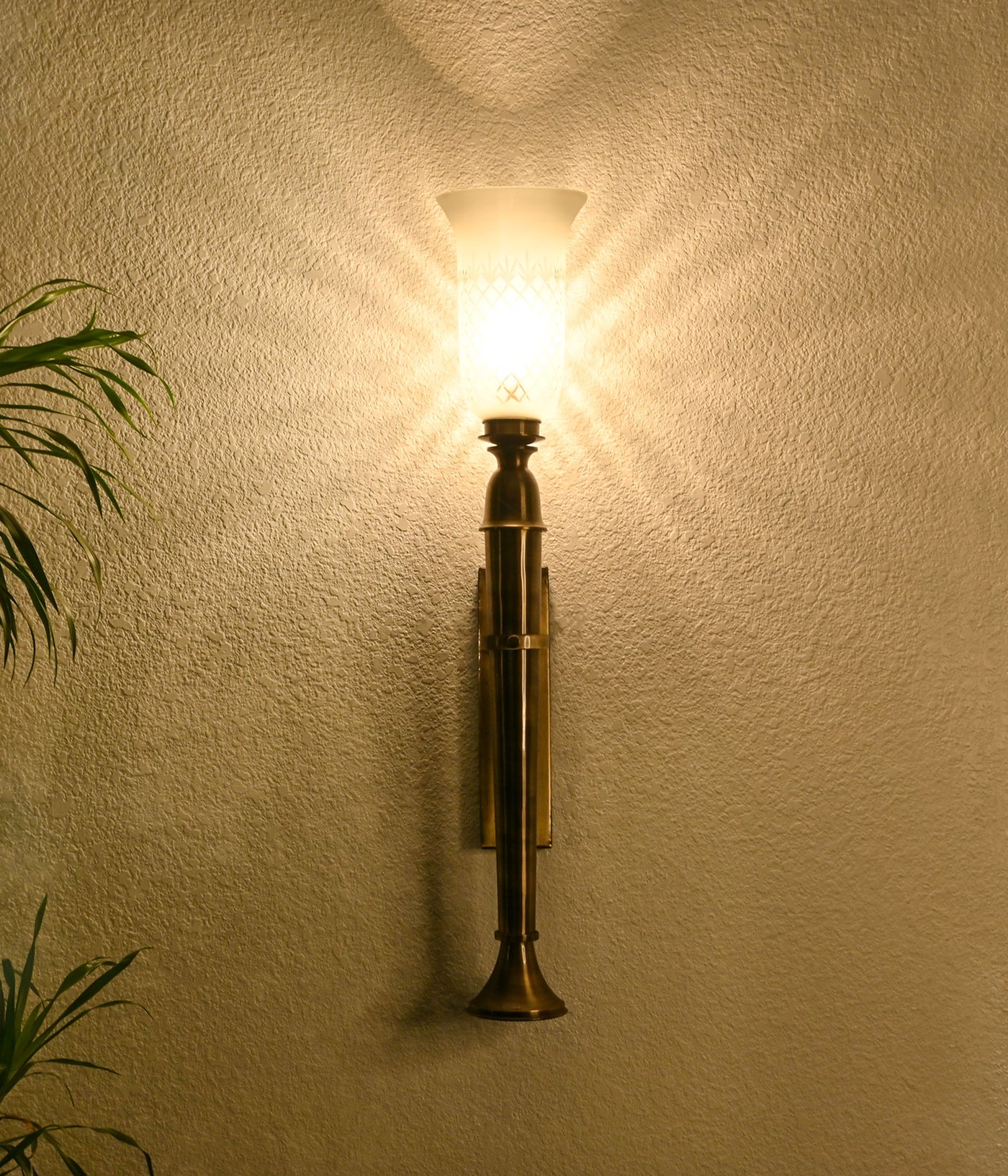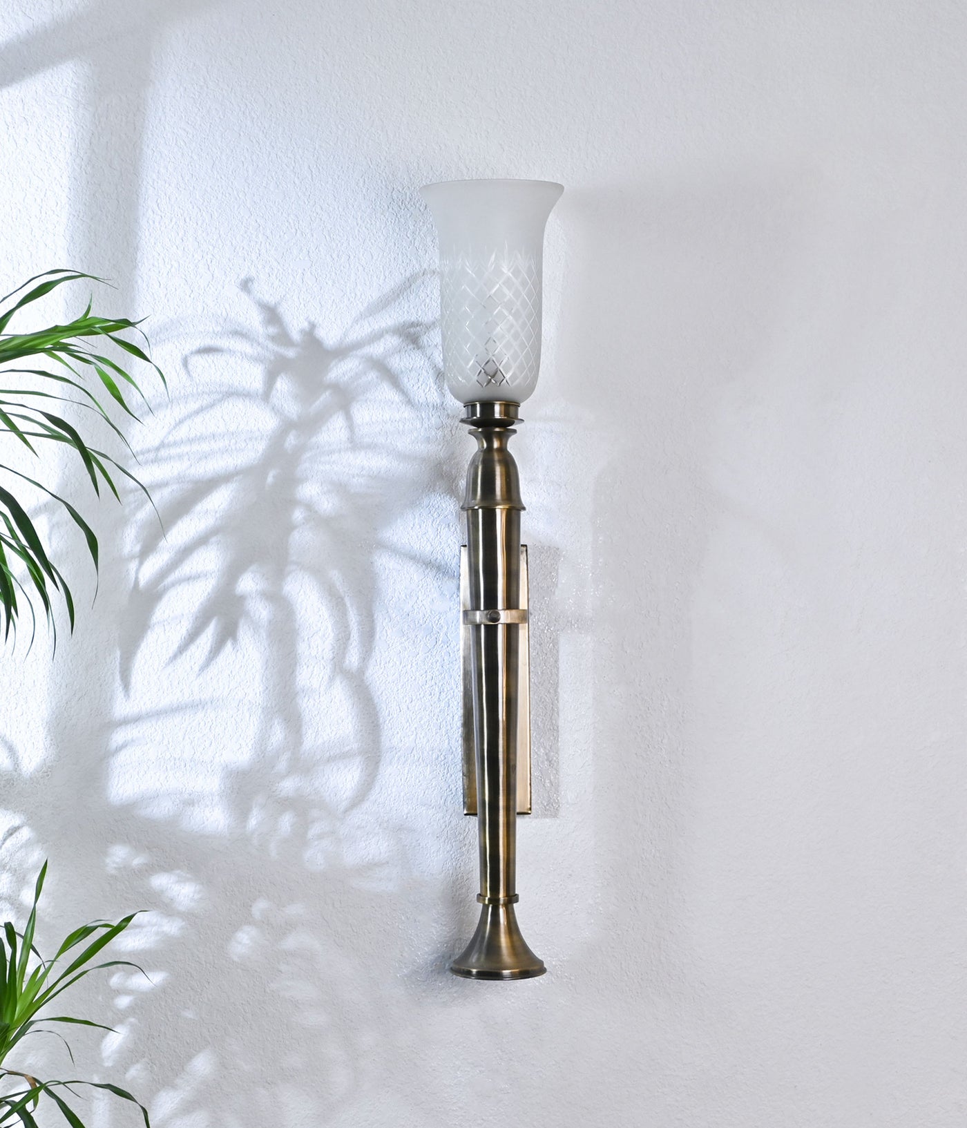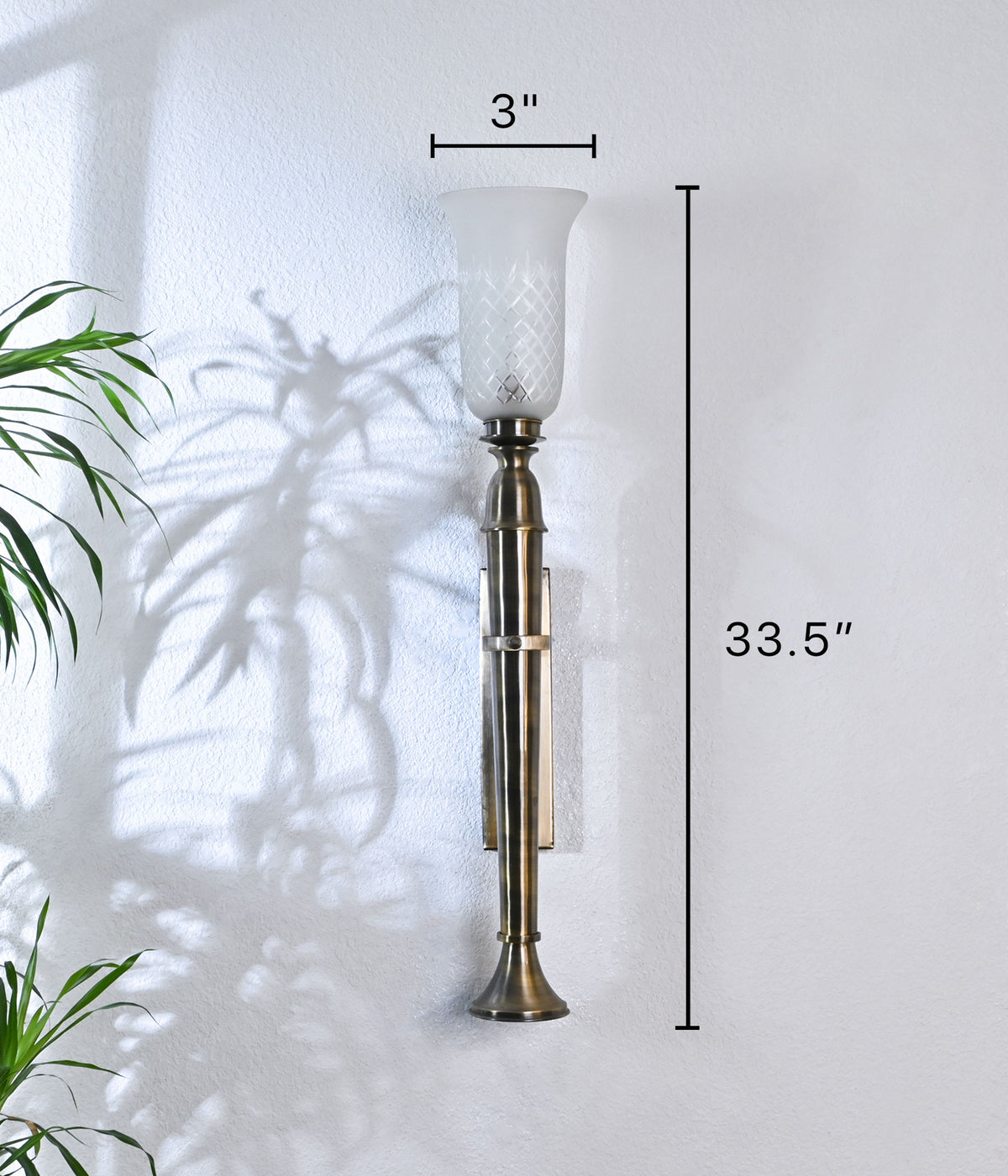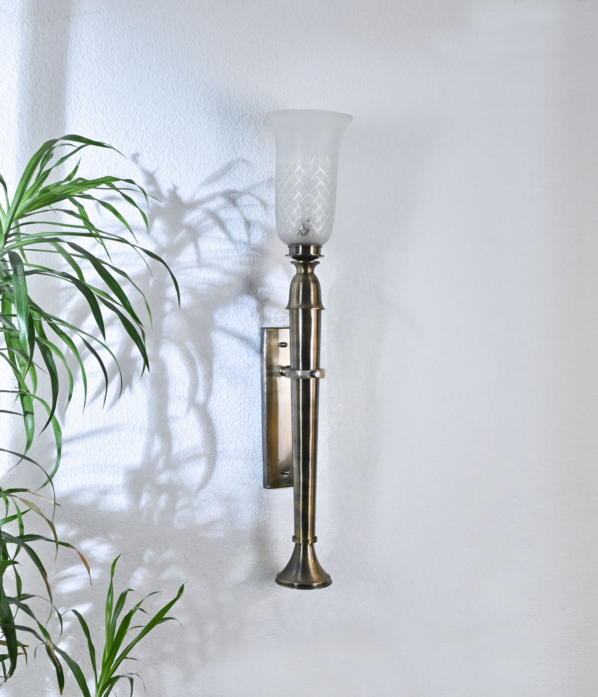 Elegant Vintage Design: Crafted with a timeless brass finish and a frosted glass shade with a diamond etched pattern, this wall sconce brings a refined antique charm to any interior.