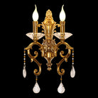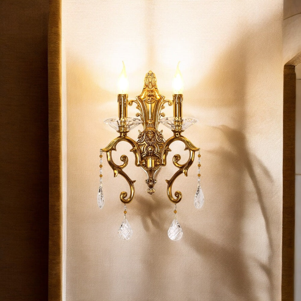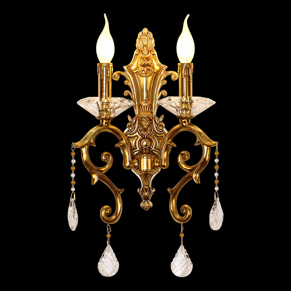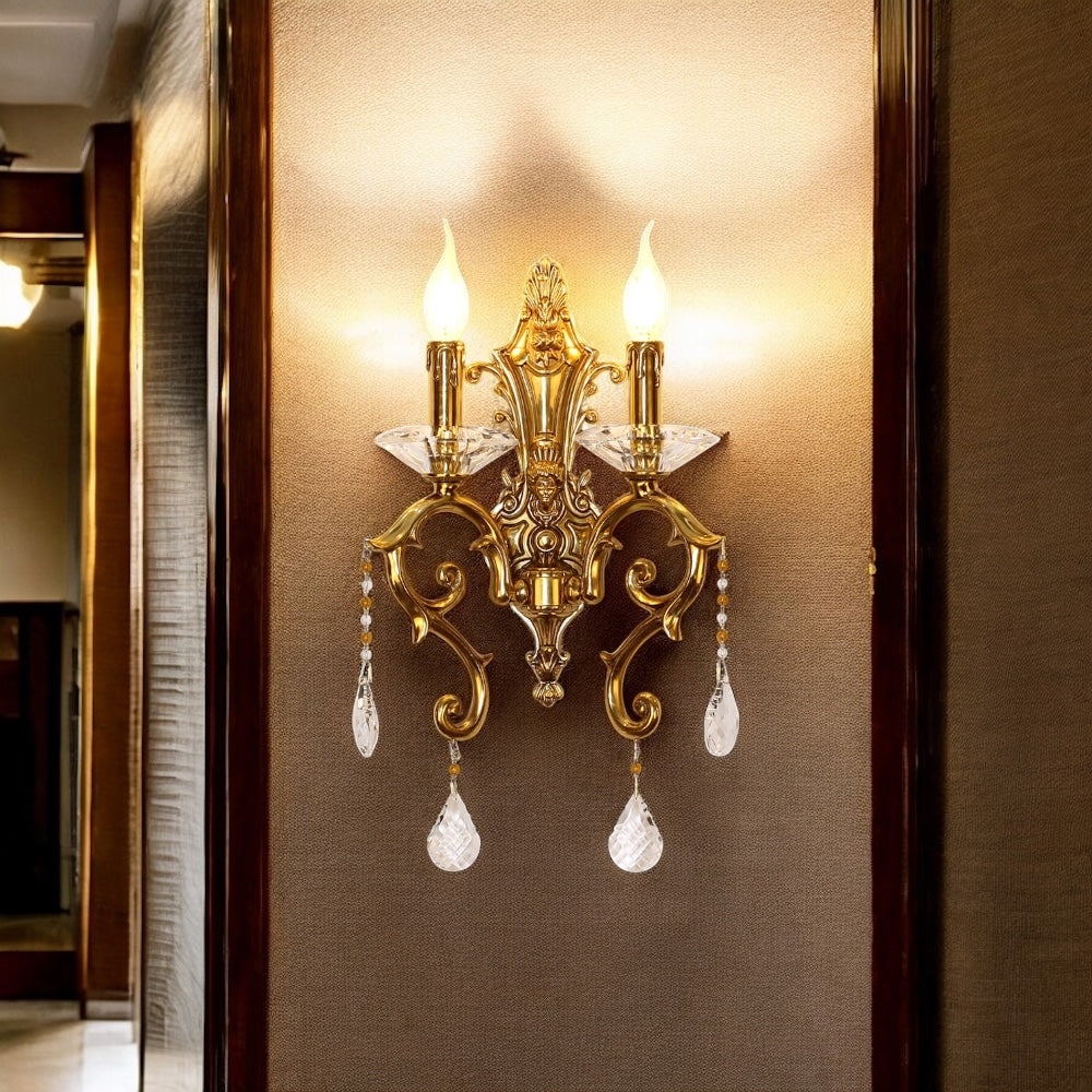 The wall lamp in the image is a classic, ornate wall sconce featuring a gold-colored metal frame with intricate scrollwork and crystal teardrop pendants. The light sources are designed to resemble candles.