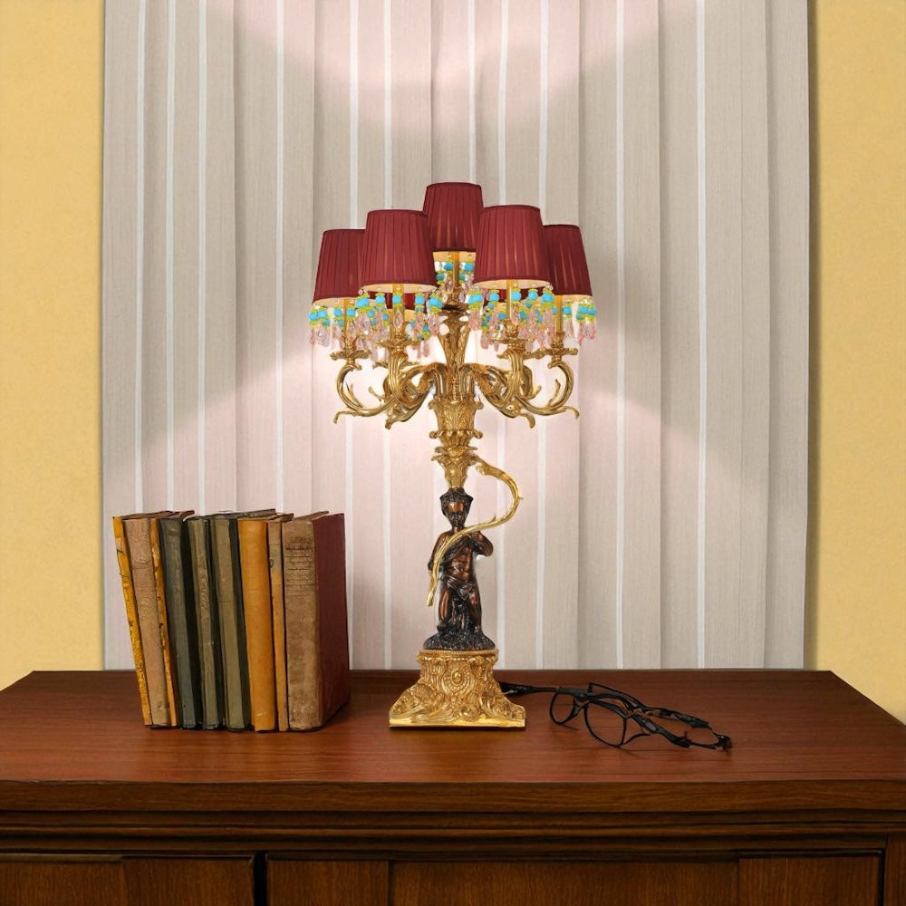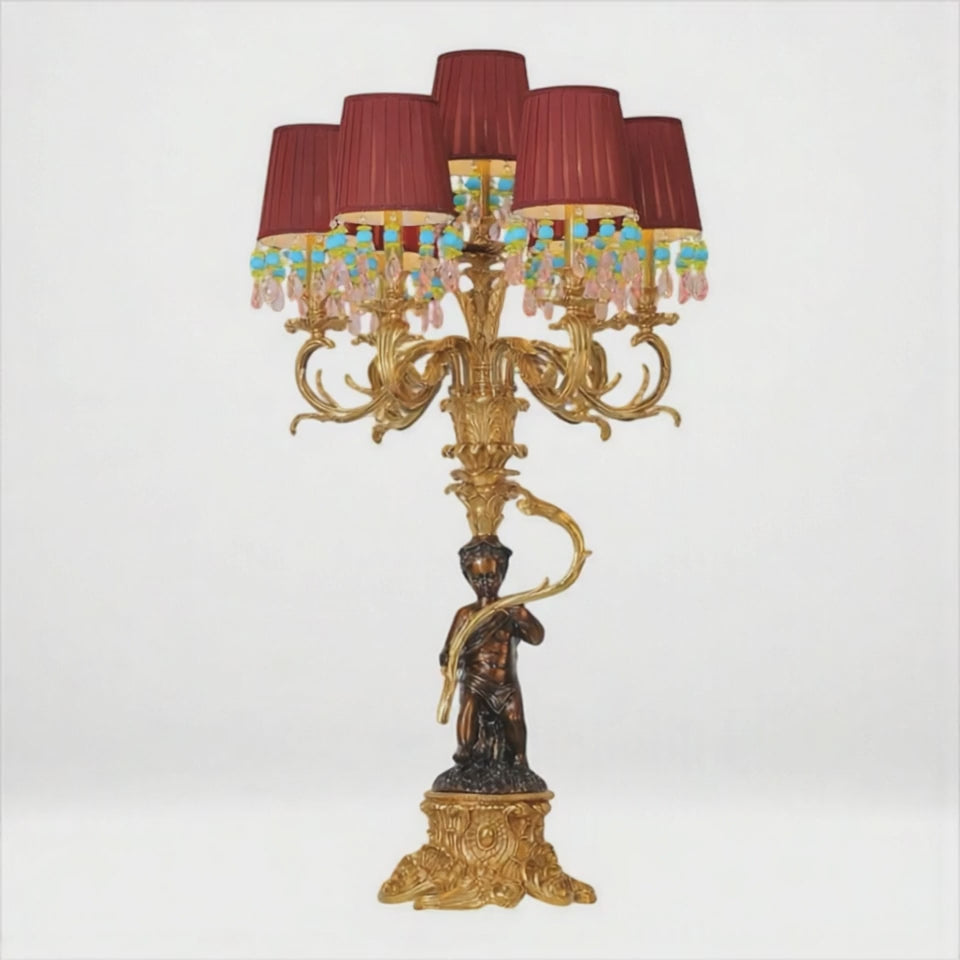 Base and Stand: The lamp has a base with a sculptural figure of a young boy holding a bow, reminiscent of Greco-Roman mythology. The main body and arms are crafted from brass with an antique finish and intricate detailing.