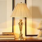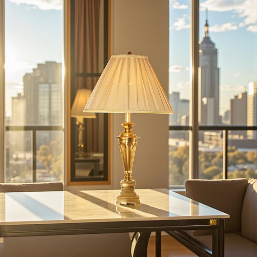 This is a classic Victorian-style table lamp. It features a solid cast brass base, a detailed central rod, and a pleated silk or fabric shade. The finish is typically a mellow, natural brass.
