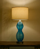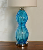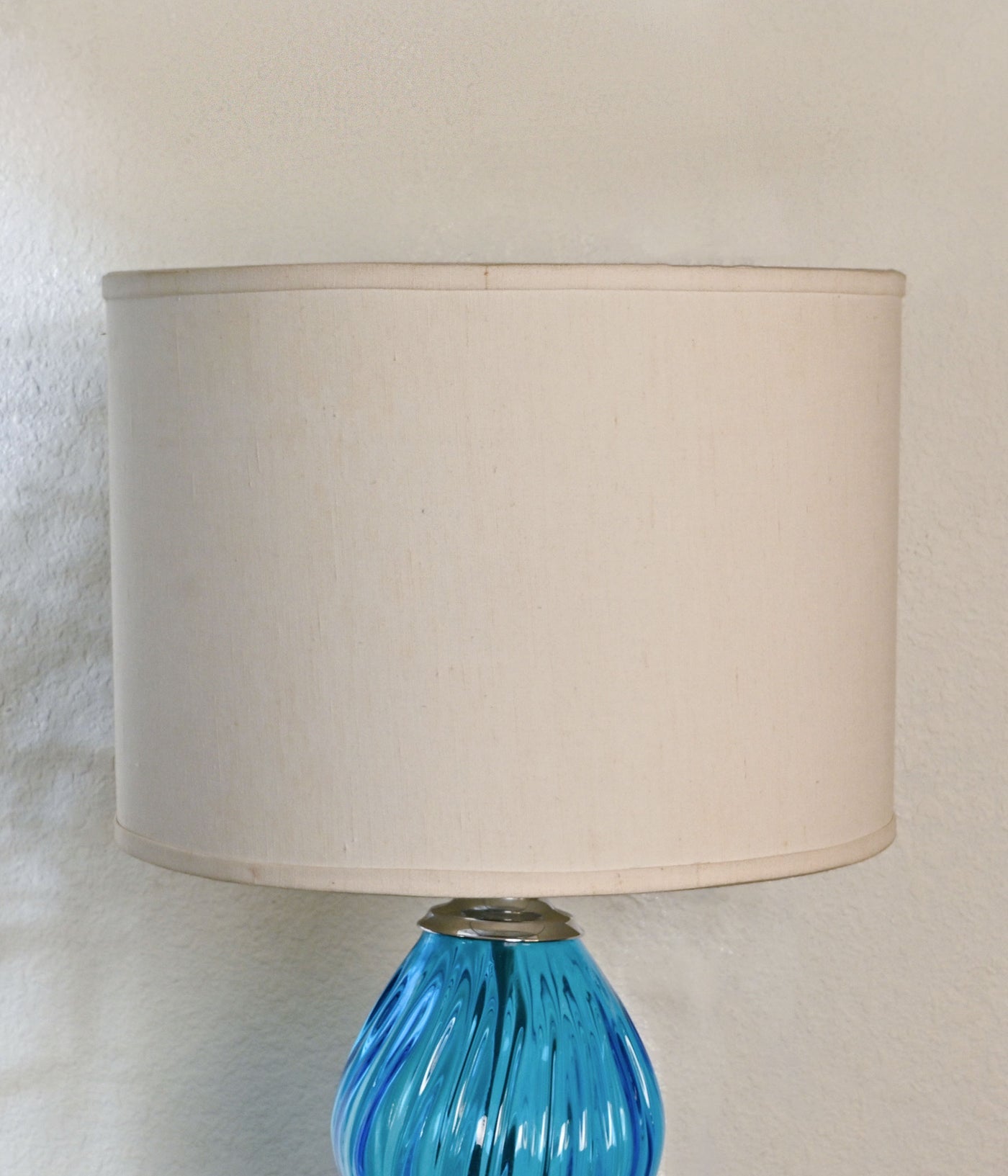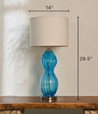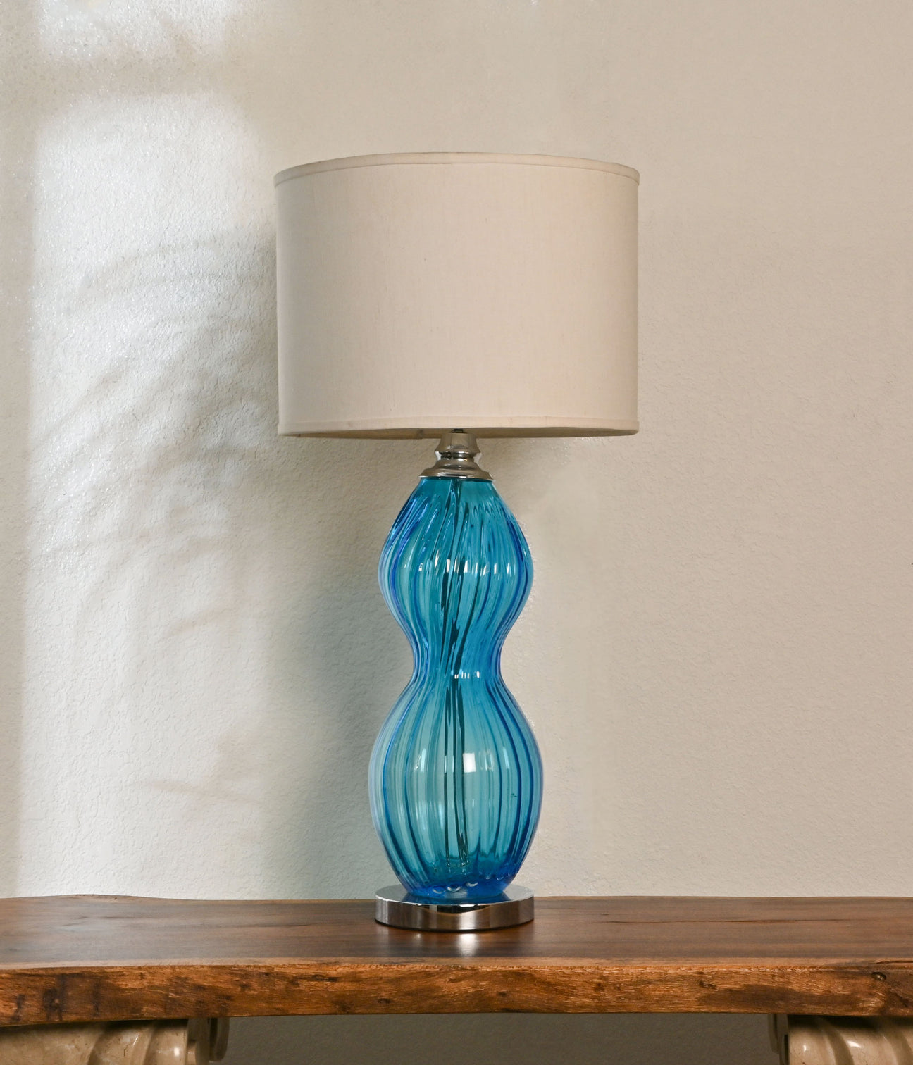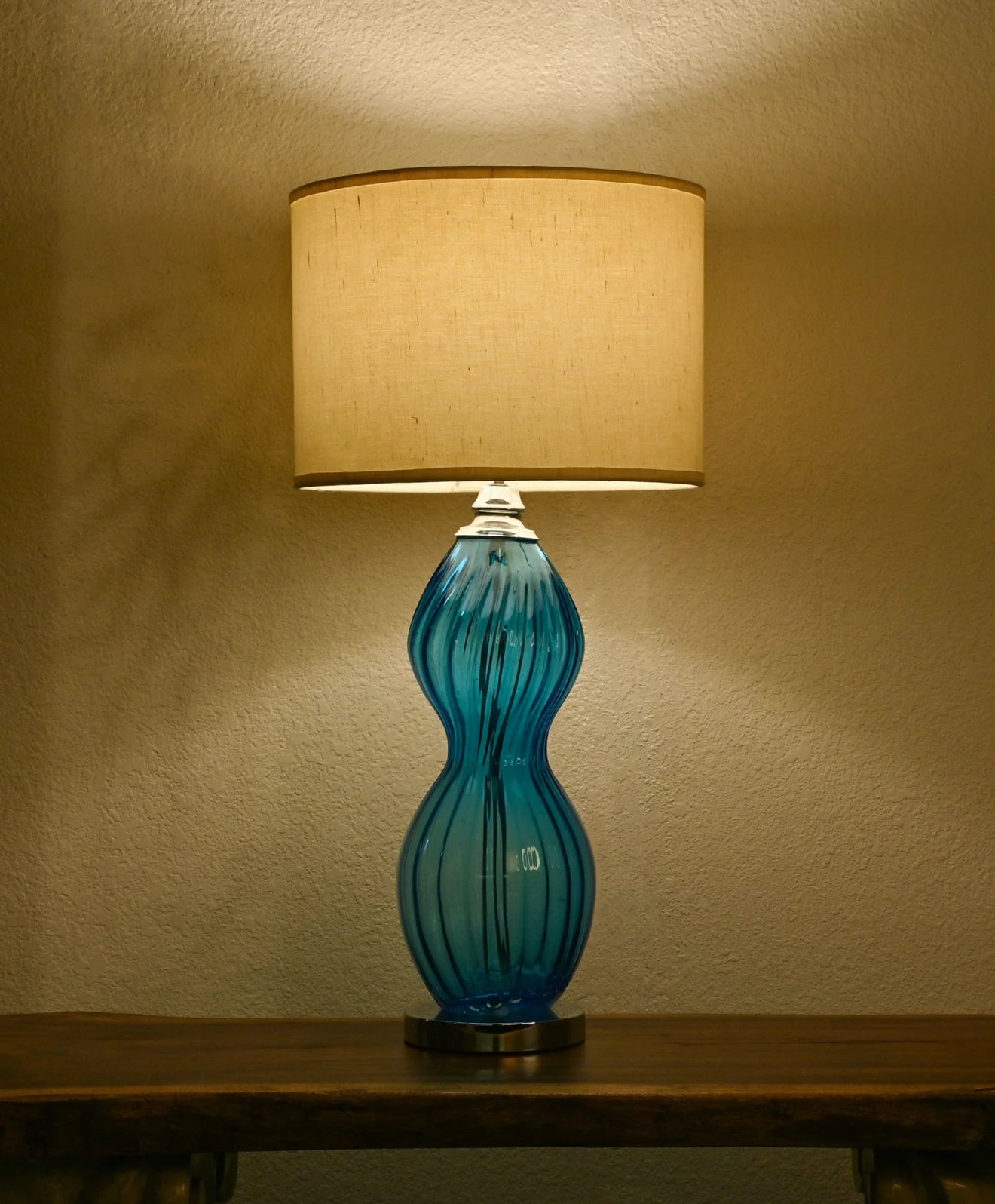Make a statement with this breathtaking table lamp, boasting a mesmerizing turquoise blue glass base, paired with a soft, creamy off-white shade that adds a touch of whimsy. A fusion of modern flair and vintage charm, this lamp is sure to be the crowning jewel of your home's decor.