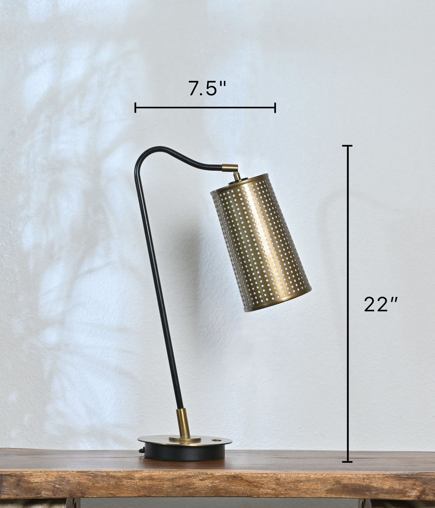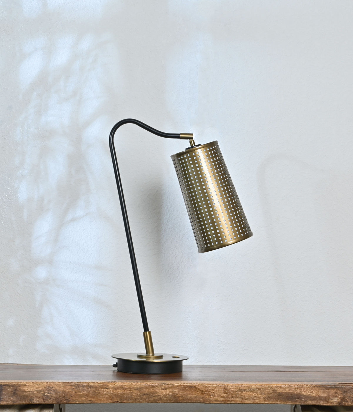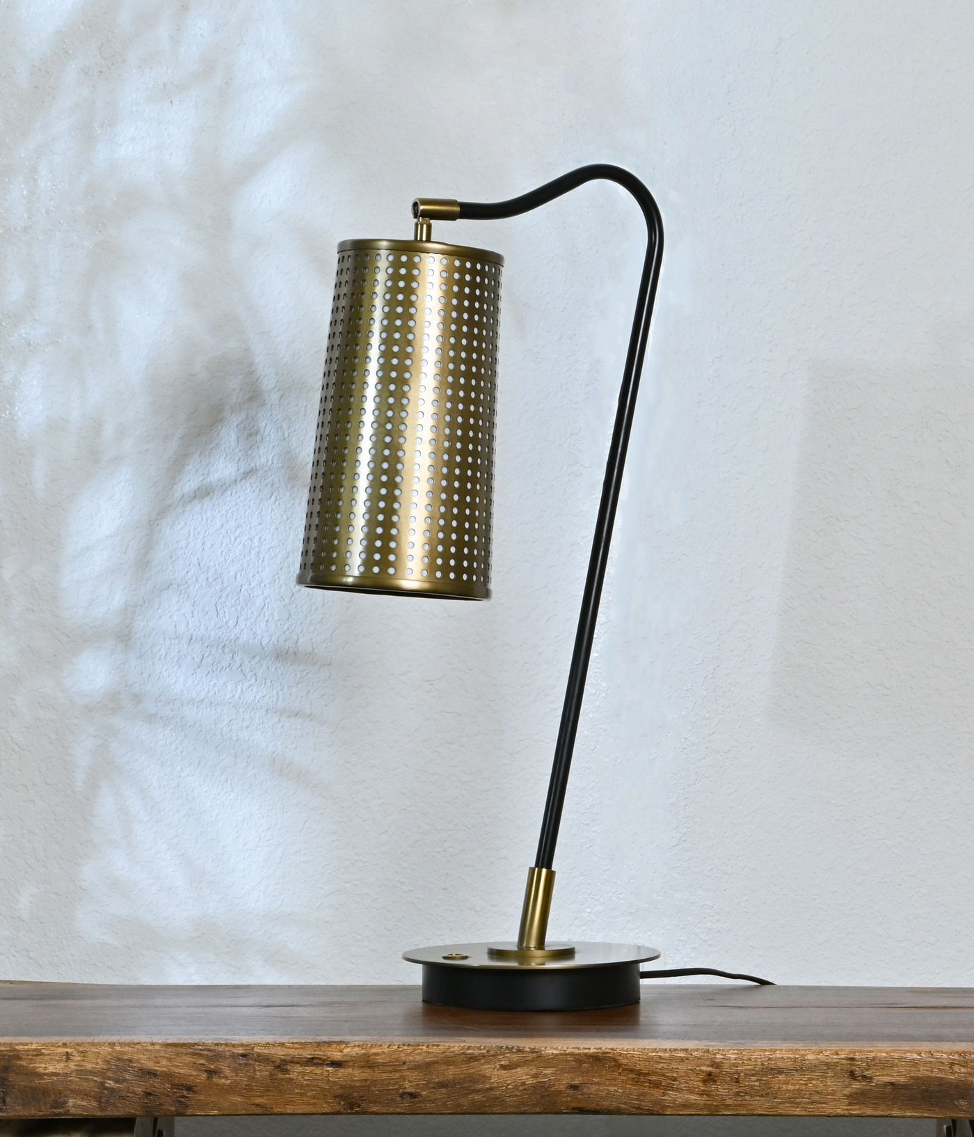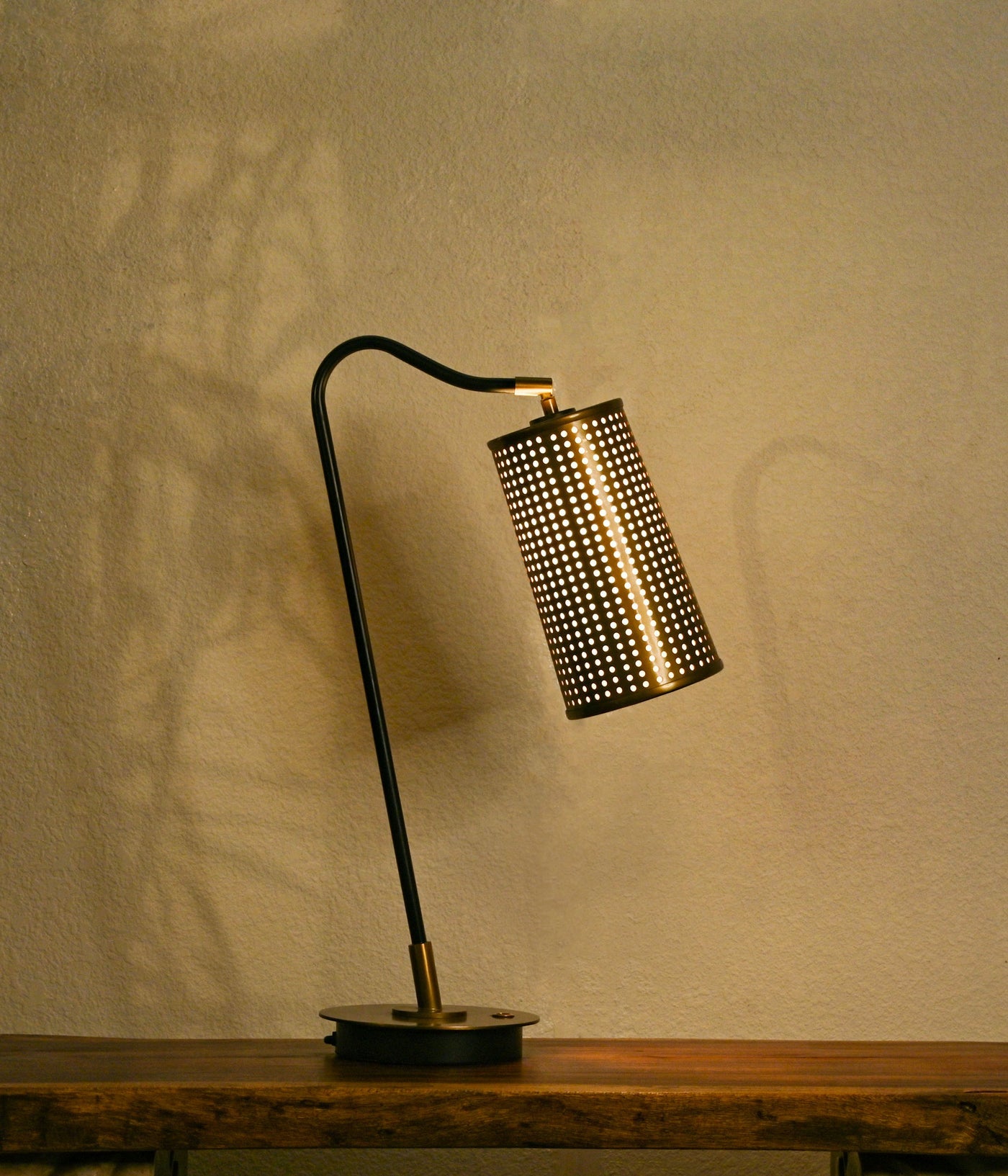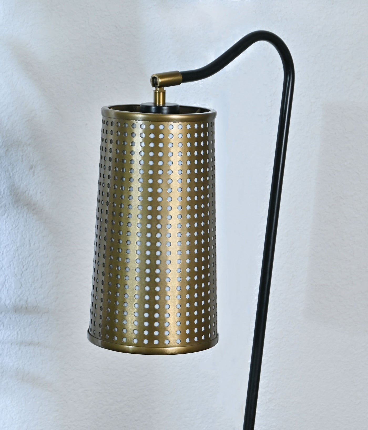 A modern bedside table lamp featuring a bronzed metal body and a black metal shade with intricate perforations. Its unique design and adjustable arm make it easy to direct the light where you need it most.