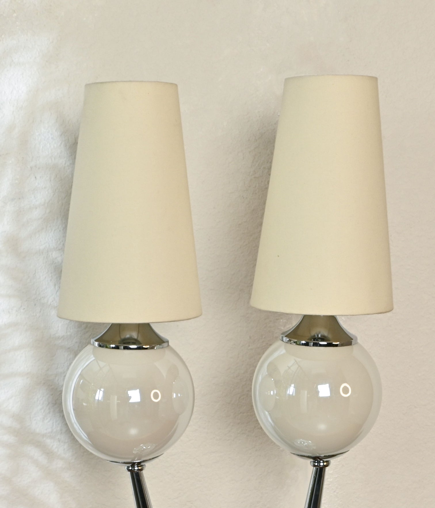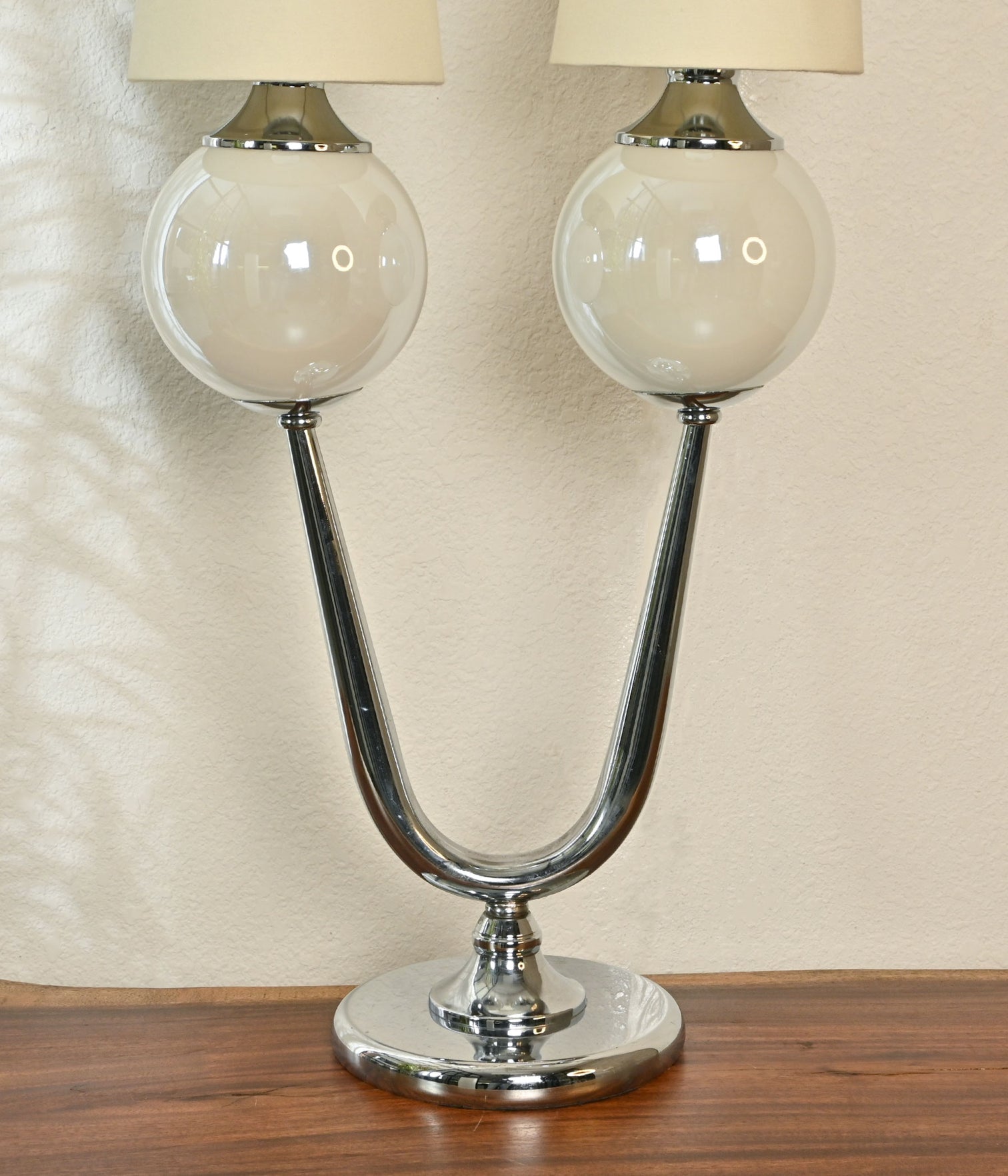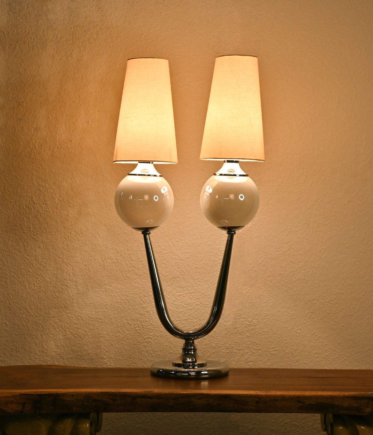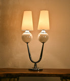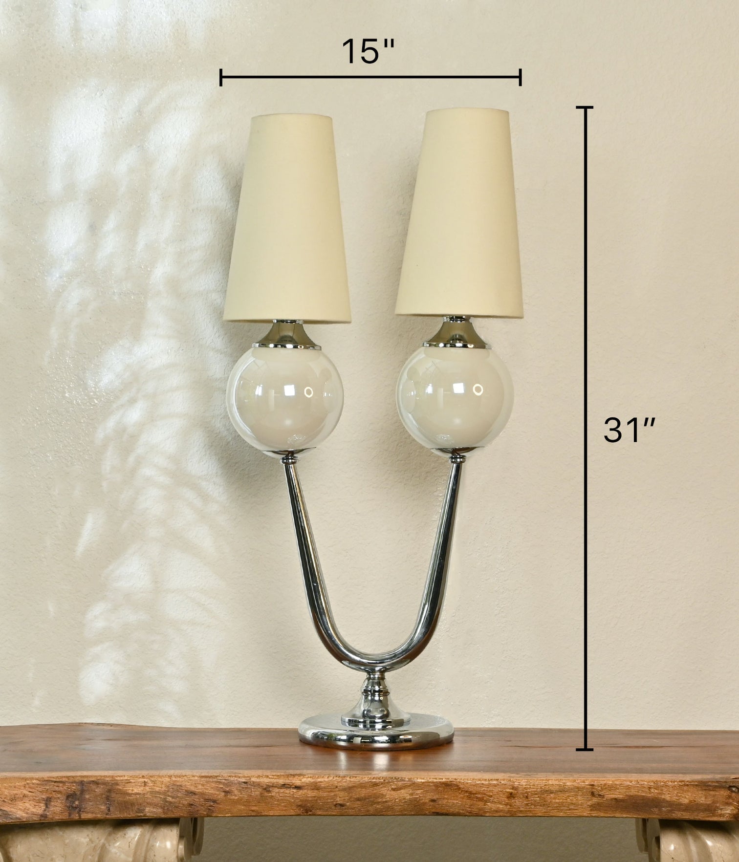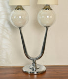 Elegant modern table lamp with a sleek chrome finish, accompanied by an off-white twin lamp shade. Its understated design makes it perfect for living rooms, bedrooms, or offices. Add a warm glow to your space with this stylish and functional lighting fixture.