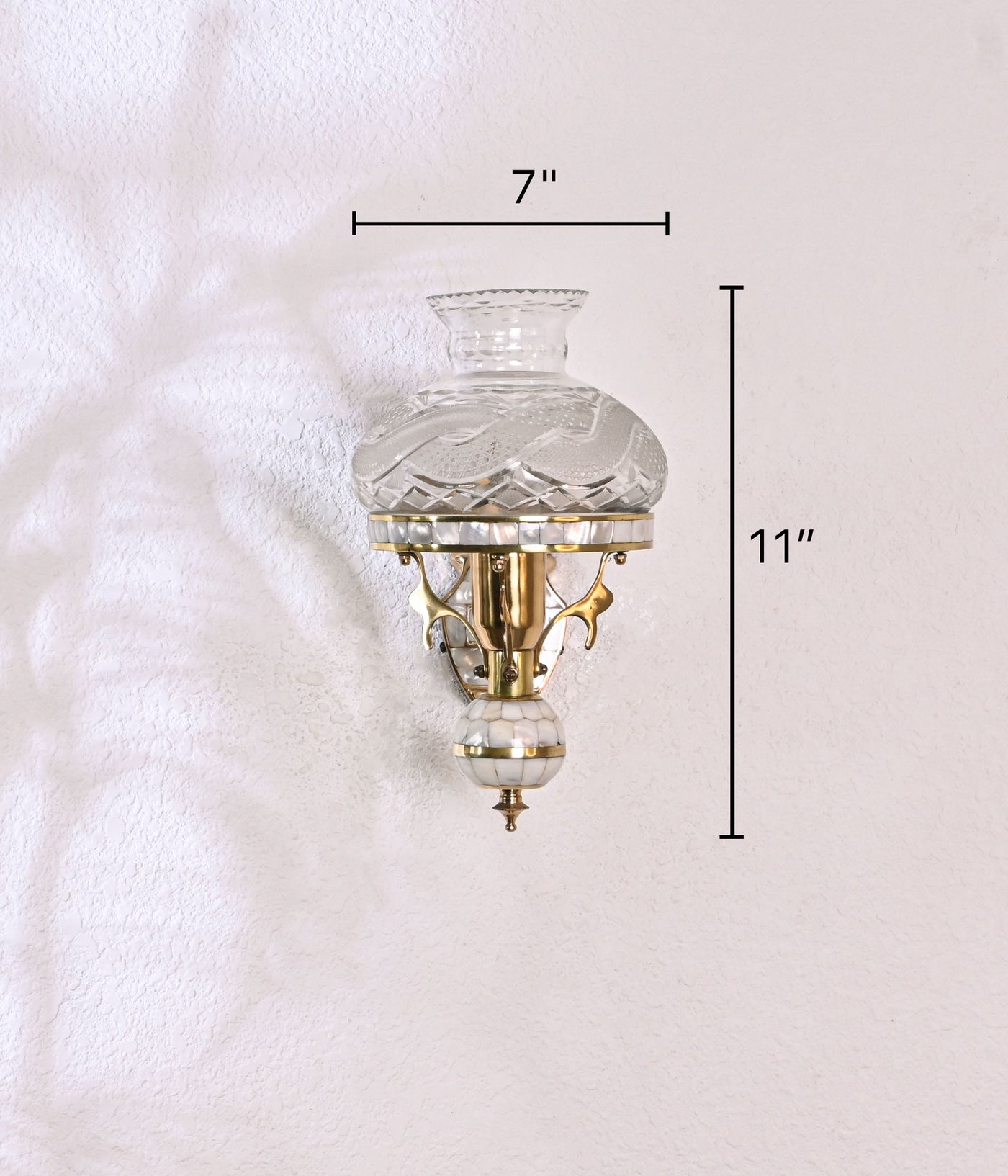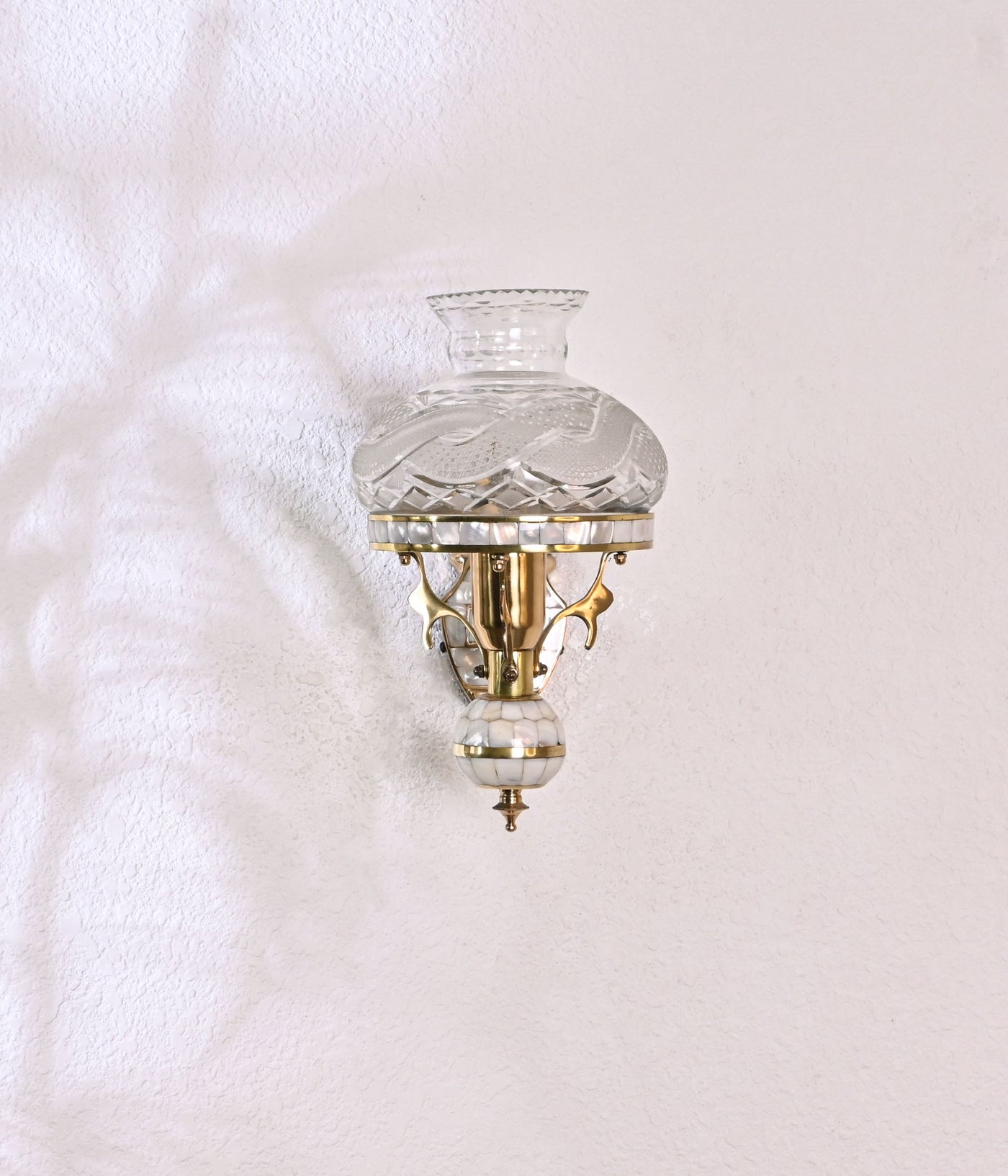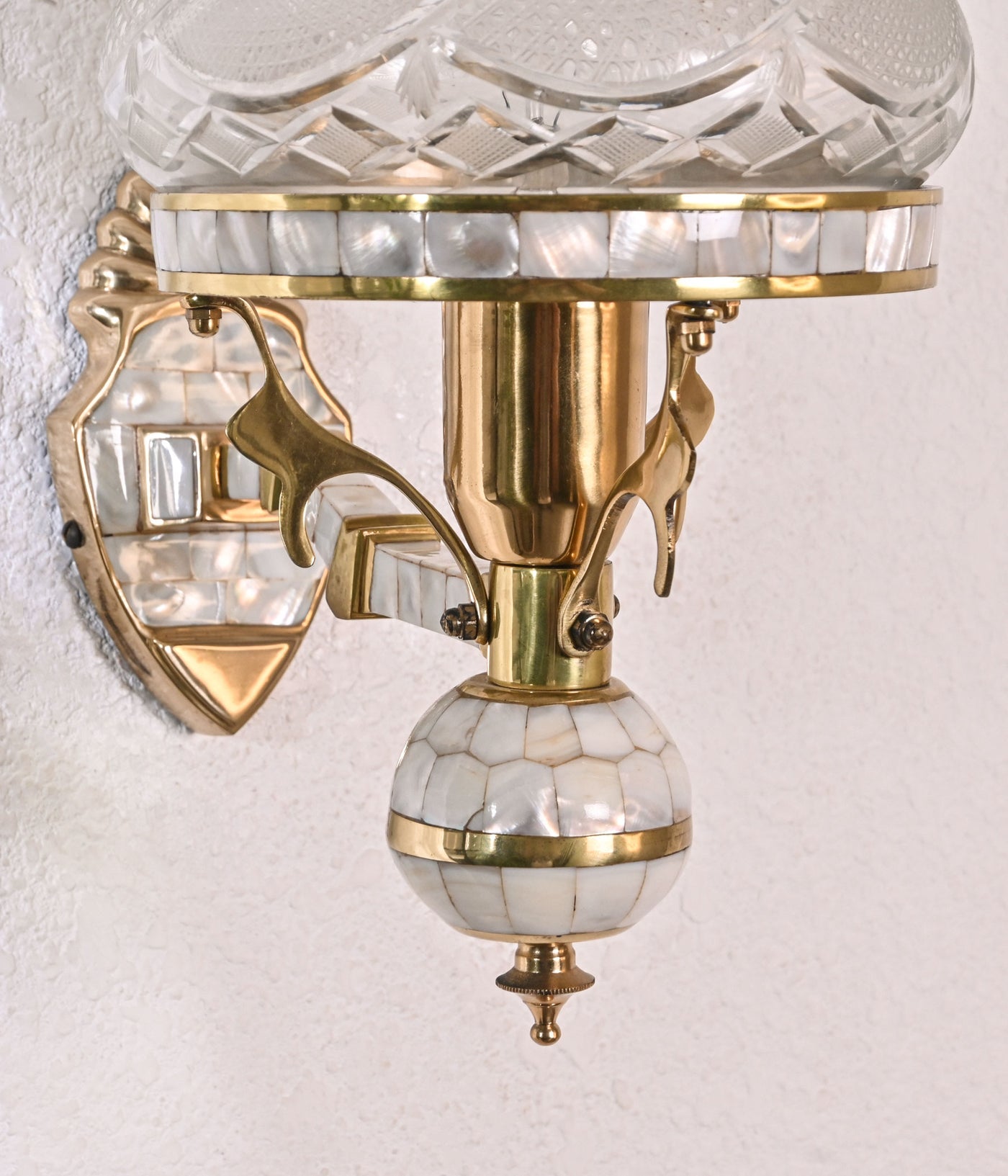 Enhance your space with the timeless elegance of this brass wall light featuring exquisite mother of pearl inlay, complemented by a natural brass finish and hand-cut lead glass. Illuminate any room with its 1 X B22 bulb, combining traditional craftsmanship with sophisticated design.