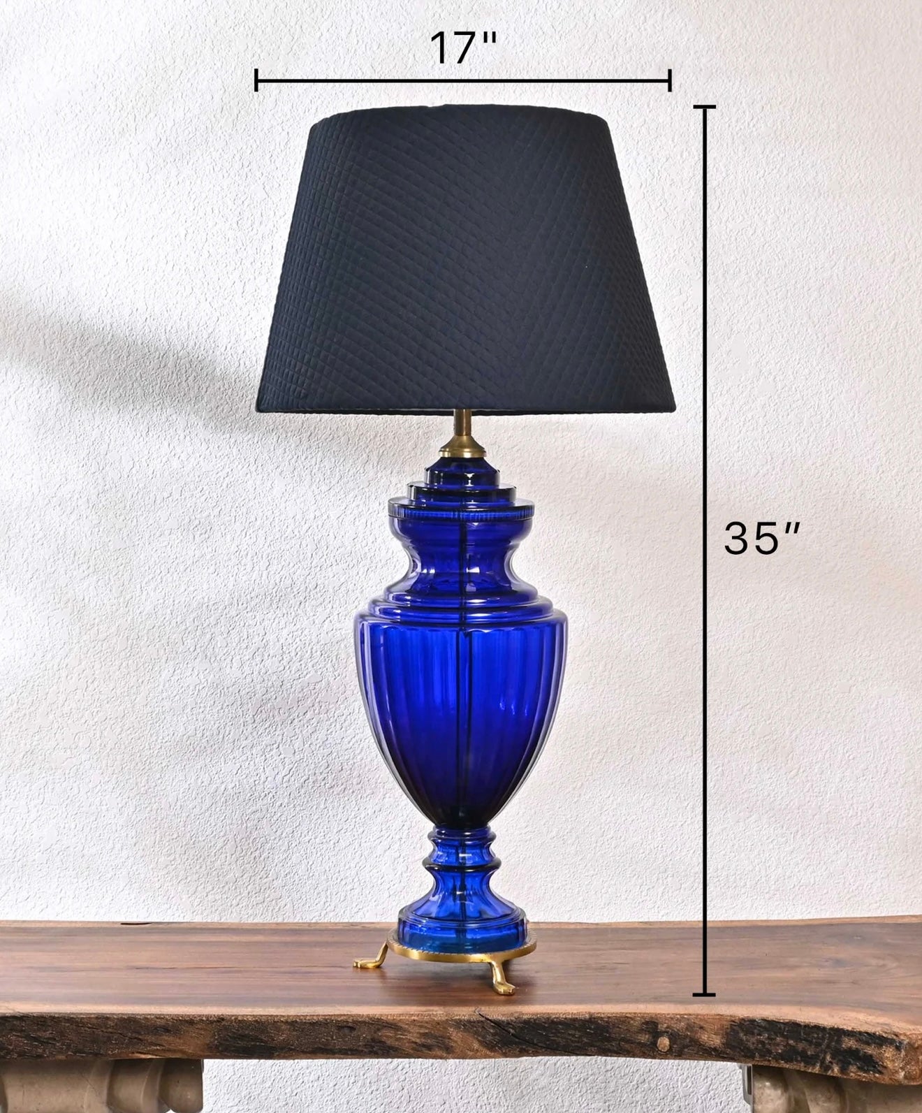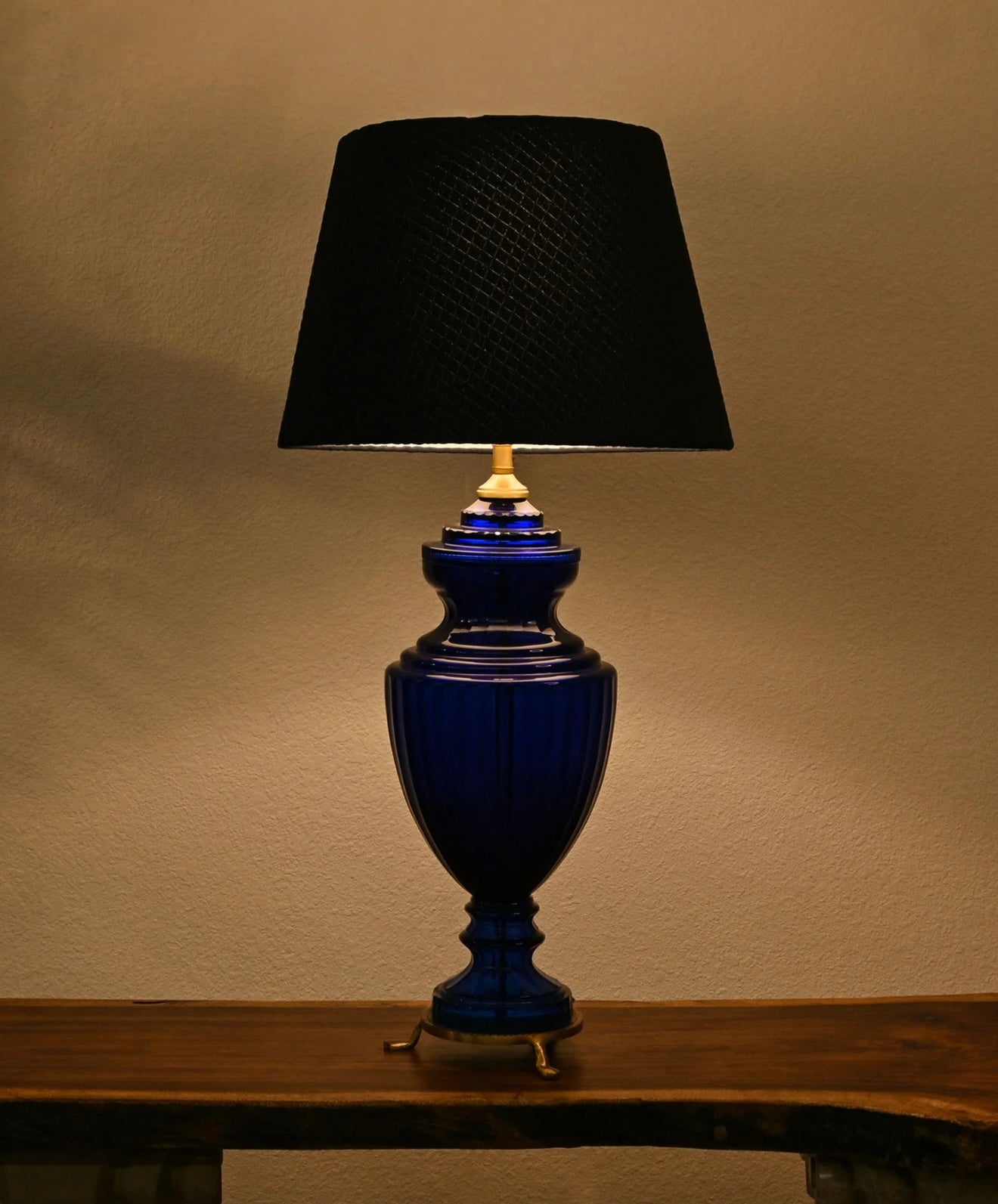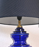 Table lamp crafted from lead glass, featuring an elegant royal blue hue, accompanied by a stylish navy blue quilted lamp shade.