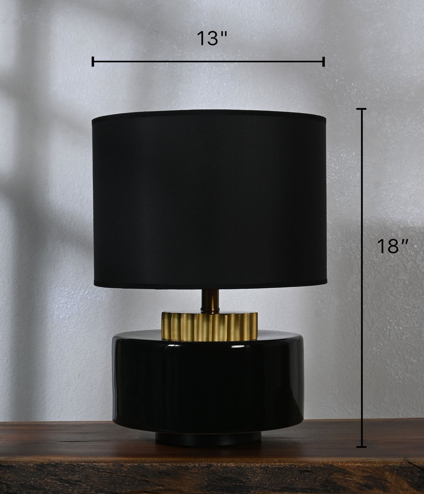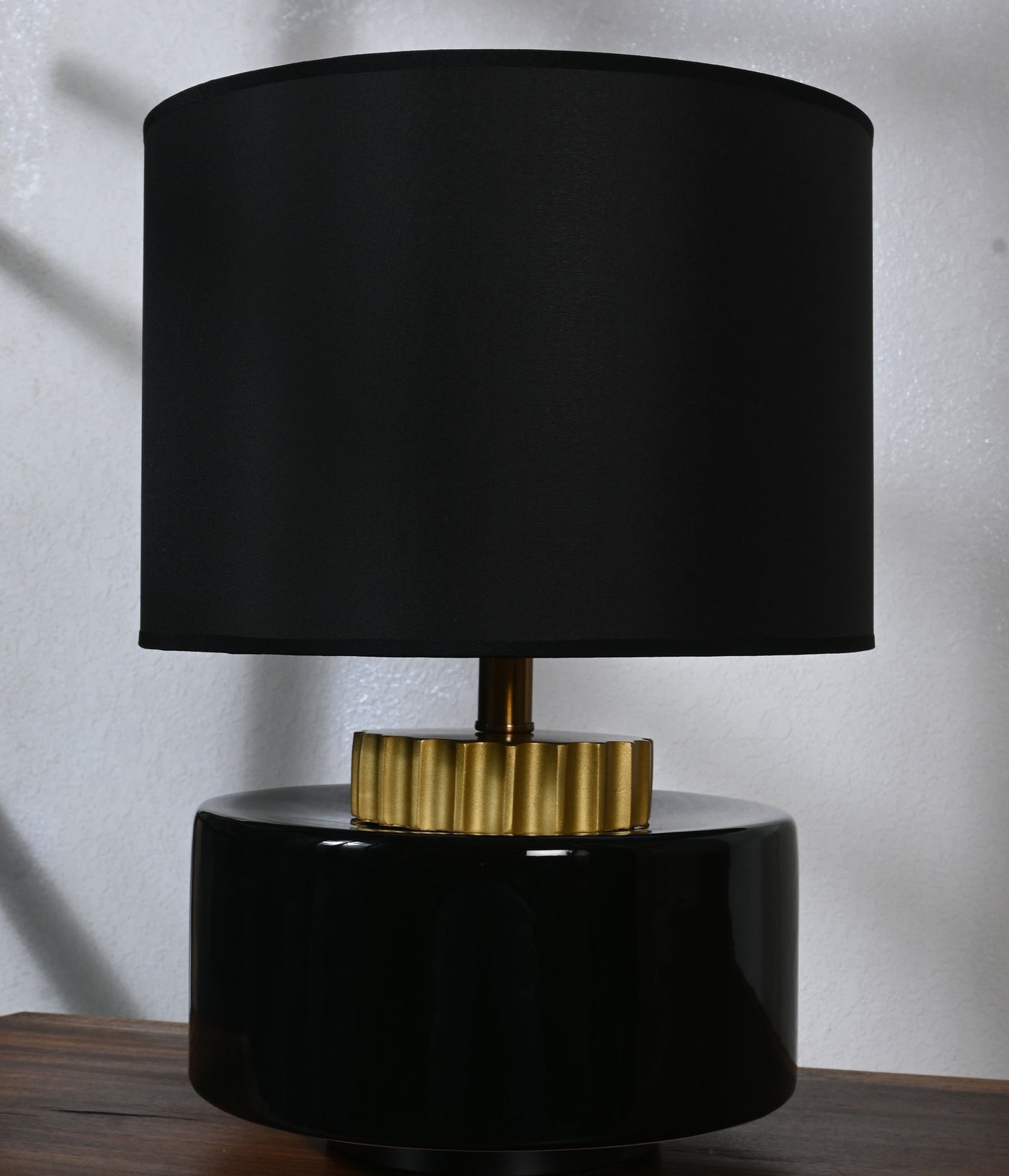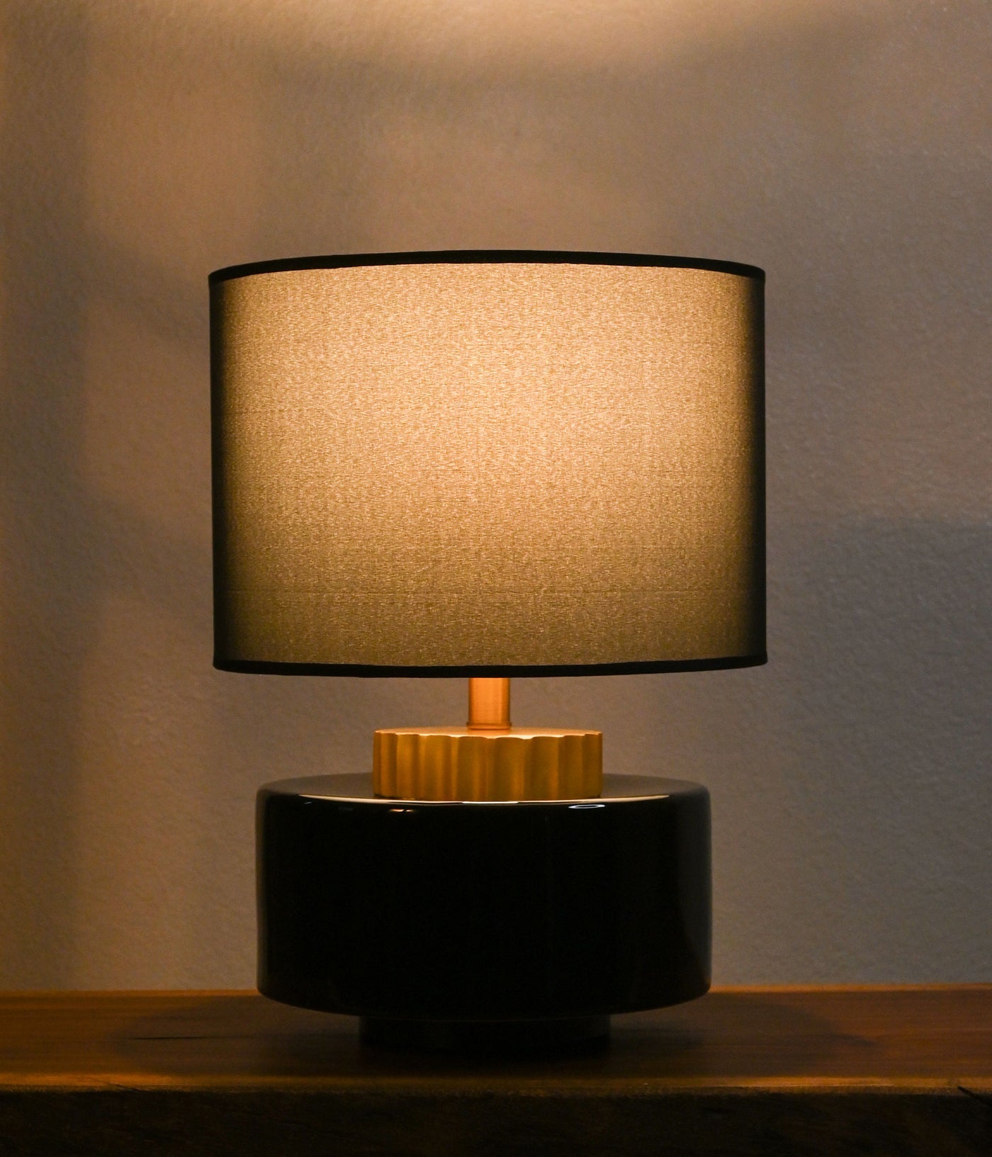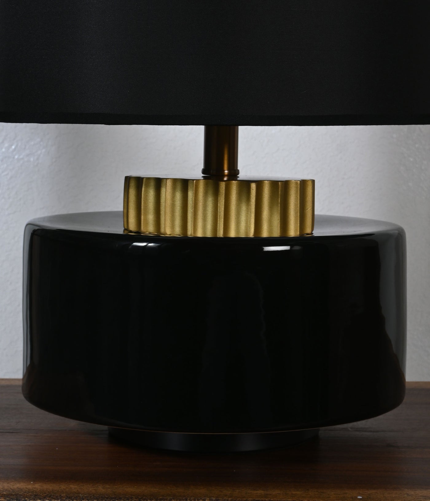A bold blend of contrast and calm, this ceramic table lamp in matte black and gold is the