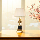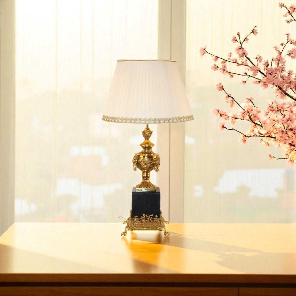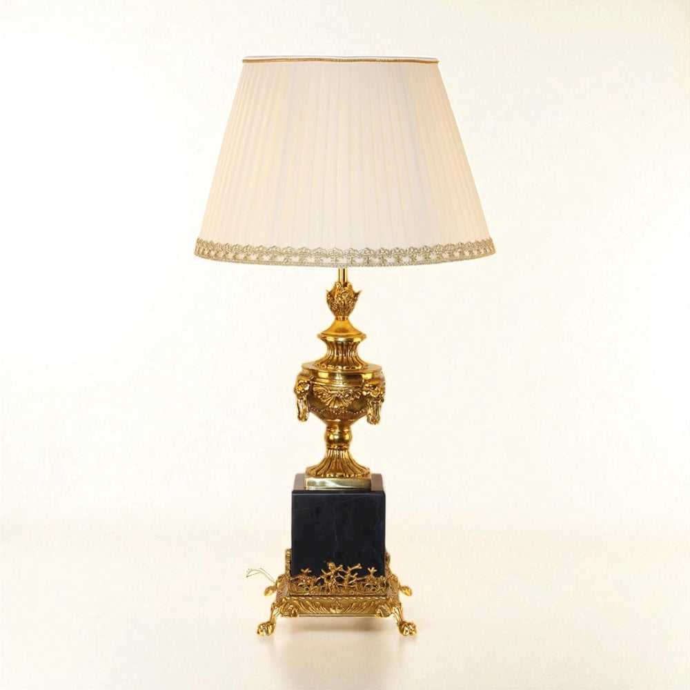 Design: The lamp features a pleated fabric lampshade and a highly detailed base. The base is made of gilded brass or bronze with intricate carvings, including lion heads and floral scrolls. The lamp stands on a dark, polished marble or ebonized pedestal, which rests on an ornate, four-footed base. The overall style is reminiscent of Rococo or Empire periods.
