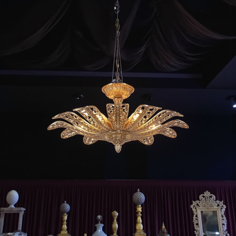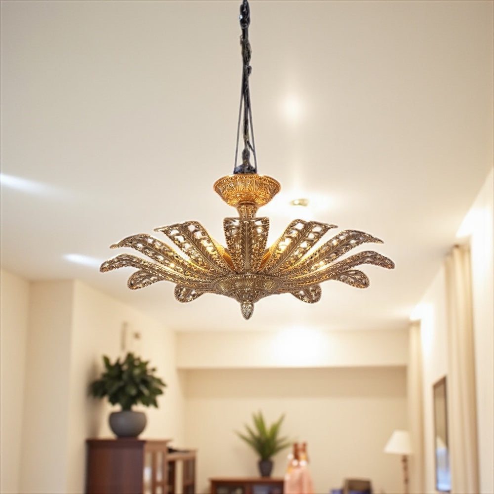 The chandelier is a vintage-style brass ceiling lamp, specifically identified as the "Oanpaste 24 Inch Vintage Brass Ceiling lamp XS-C019". It has a fan-like or floral design with multiple light fixtures.